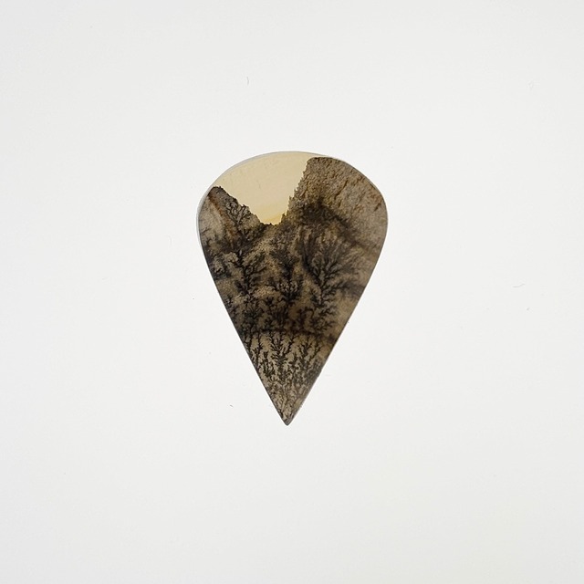 内包物が本物の草木のような模様になったデンドリティックアゲート。他にもデンドライトが入った鉱物はありますが、アゲートはどこかノスタルジーを感じます。 今回の9石は、ファンタジーのワンシーン、書物の挿絵にありそうな、想像力をかき立てられる模様を選んでいます。 厚みがあって不透明で、透かさずとも丘陵のような景色が見えますが、裏から光を強くあてると夕暮れの表情へ変わります。裏側はまた雰囲気が違い、丘の向こう側で何かが舞っているみたいです。 サイズ:16.8*24.7*3.8mm 産地:インド 《ご購入後のトラブルを防ぐために下記ご確認くださいませ》 ◆取り扱っている石について ・サイズや重さはおおよそになります。 ・キズやカケ、ヒビ、内包物 (インクルージョン) は画像や説明文でお知らせしていますが、微細なものは見落としがあったり、画像にはっきり写らないかもしれません。天然石の特性としてご了承くださいませ。 ・正面から見た際に致命的な瑕疵があるものは訳あり品としてお出ししてます。天然石特有の仕方ないキズカケ、ヒビで許容範囲と判断したものは商品説明や画像にてお知らせし、通常出品しています。 ・非加熱、ノンオイルなど、処理が施されていないものは別途記載しています。仕入先、鑑別機関からの情報を記載しており、全てを保証できないことをご理解くださいませ。 ・カットが歪なものがありますので画像にてご確認くださいませ。 ・商品名は仕入先の流通名をもとにしており、誤解を招くことがありそうな場合は説明文にて補足してます。 ・お客さまの照明、光源の角度、お使いのモニター環境により、印象が異なる場合があります。 ※この他、撮影方法、配送や包装についてのご留意事項もショップ情報にてご確認ください。