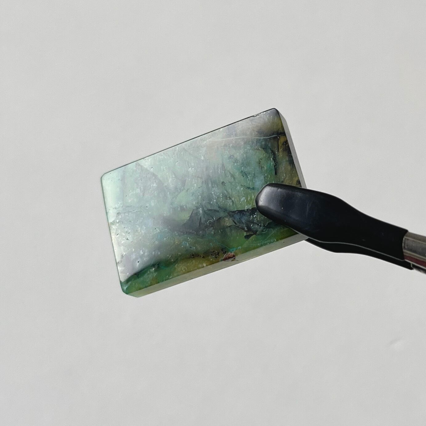 長い年月をかけてオパール化した植物の化石です。風景画のようなものを選びました。光で透かすと内包物がはっきりと写し出され、また違った表情になります。