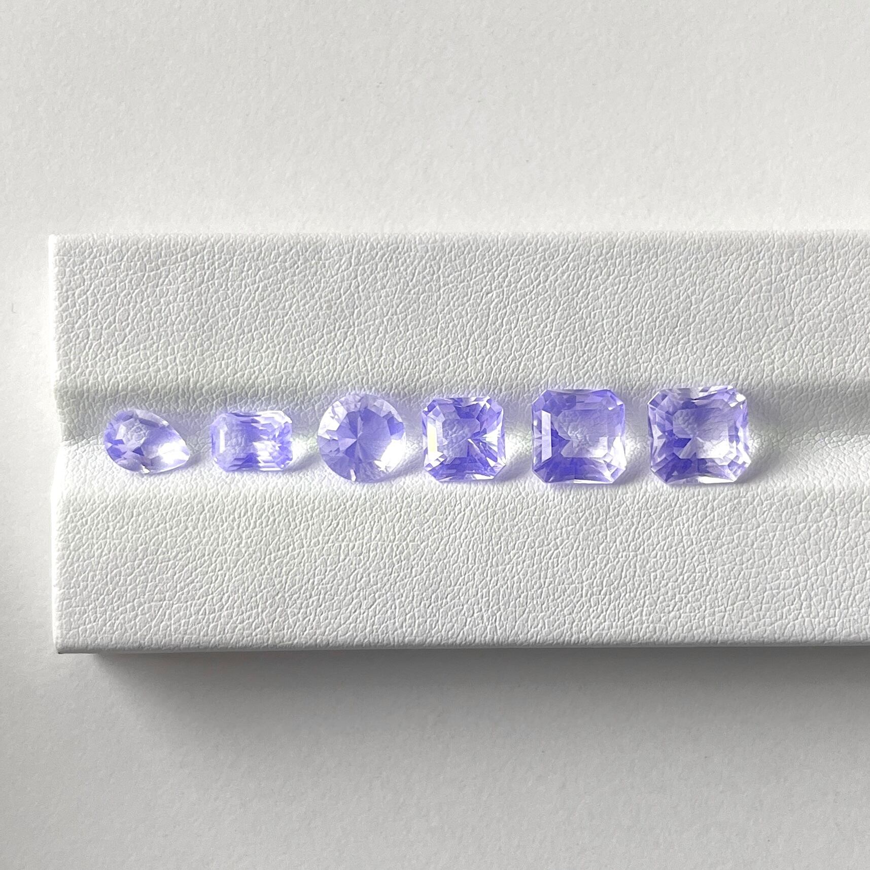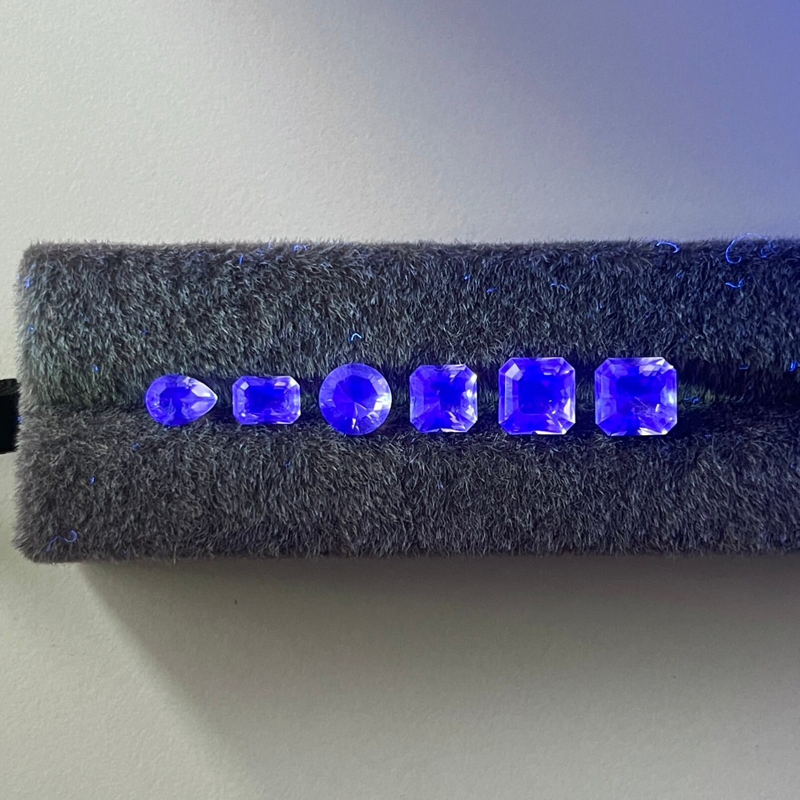 UVライトをあてると無色から鮮やかなブルーに変わるフローライト。明るい地色、場所でも美しく蛍光するので、ぜひお手元で試していただきたいです。