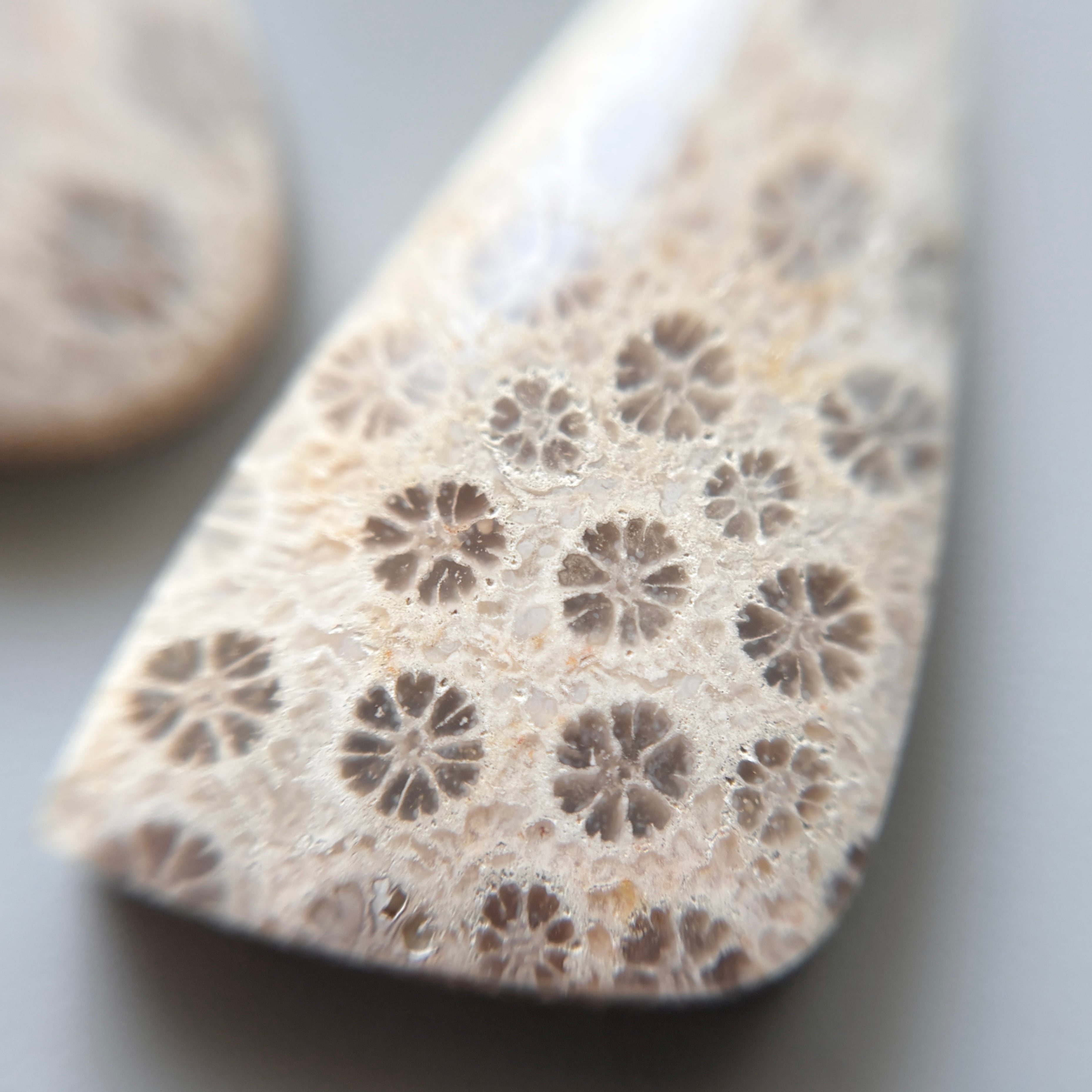 小花模様と白っぽい地色がピュアな雰囲気のフォシルコーラルです。光を背に小花を透かすと別の世界が見えます。