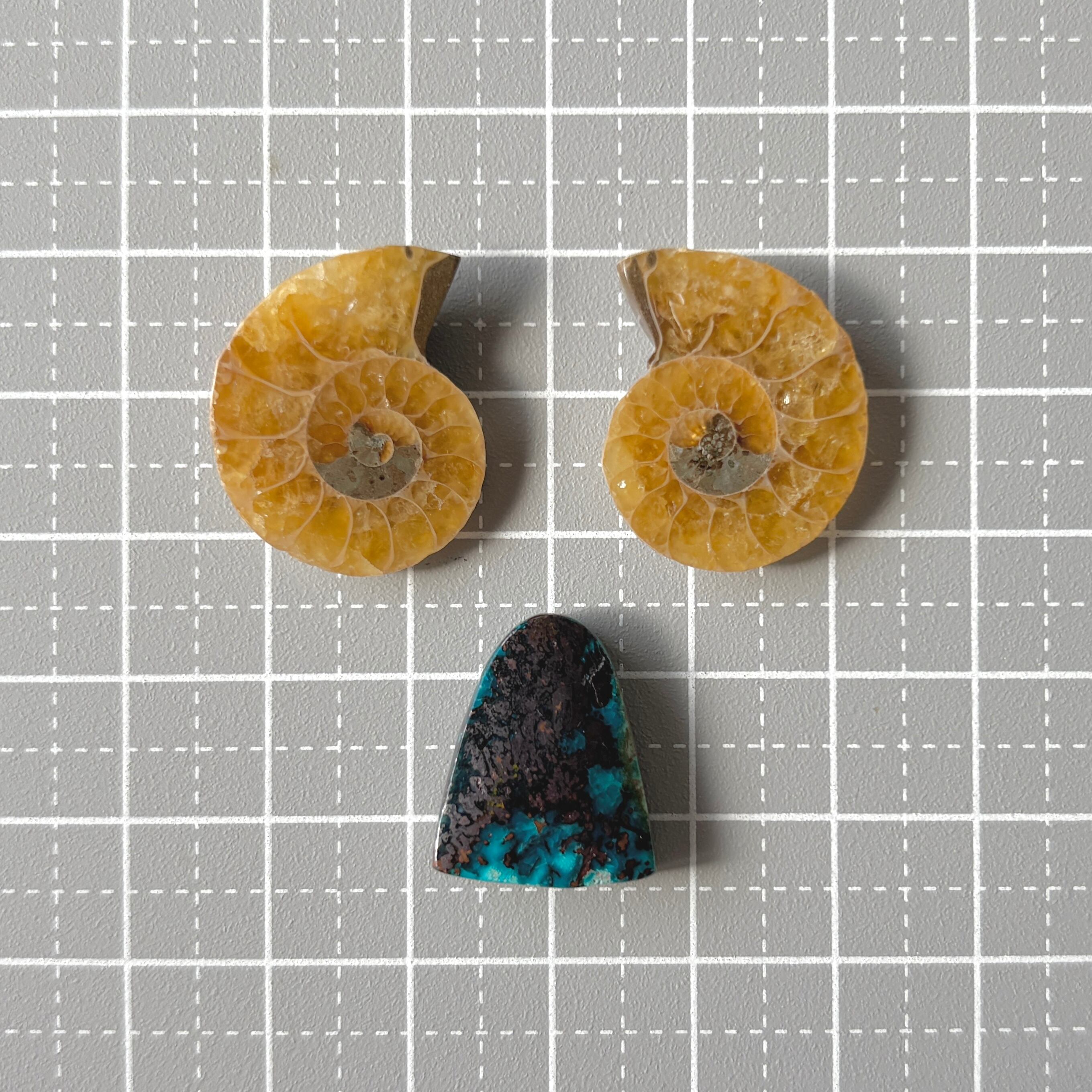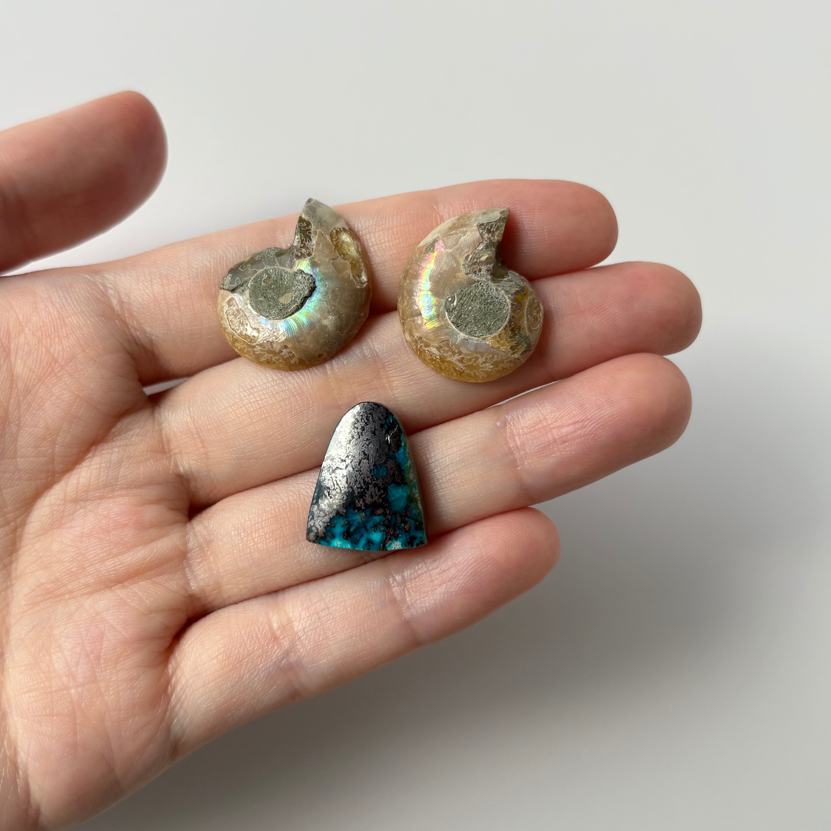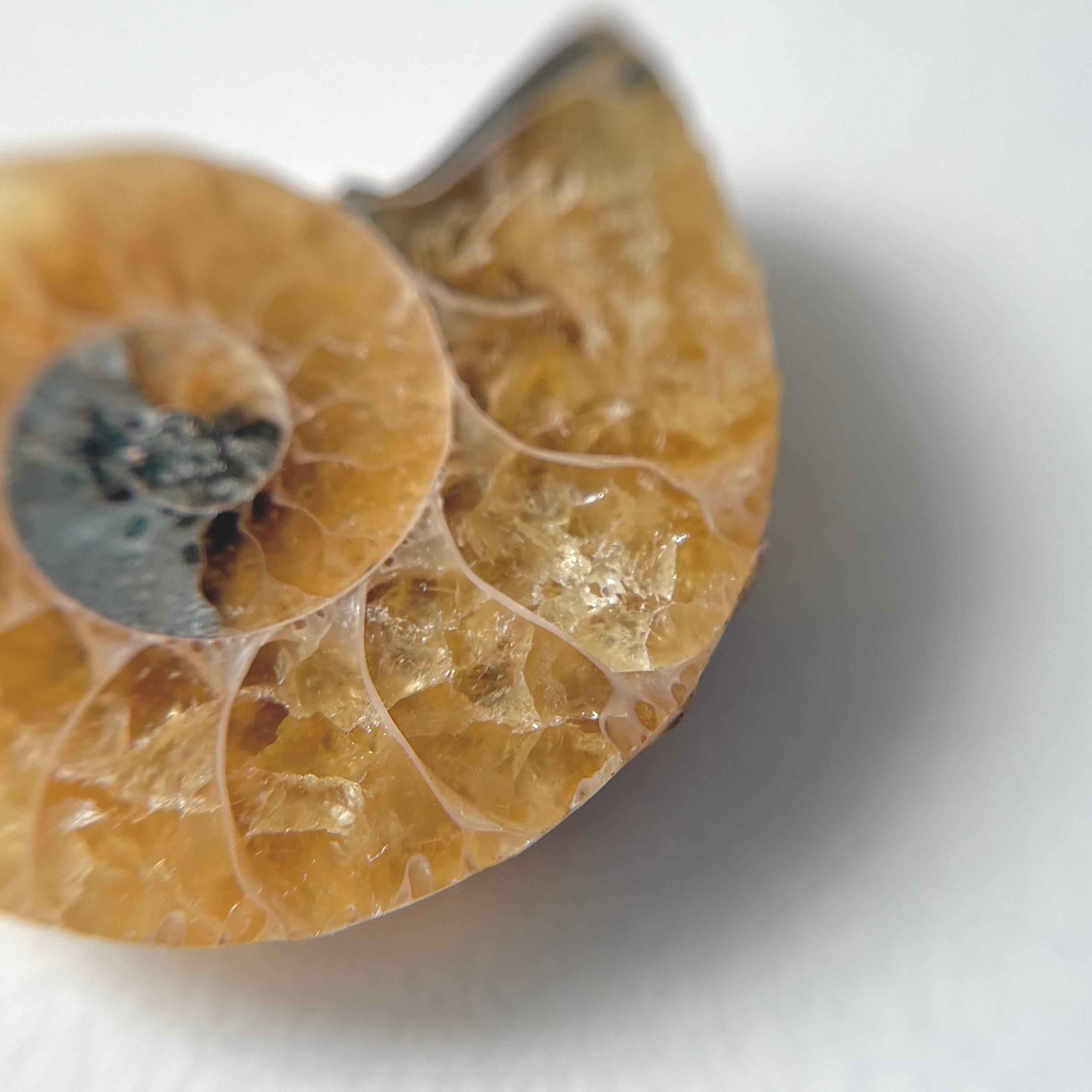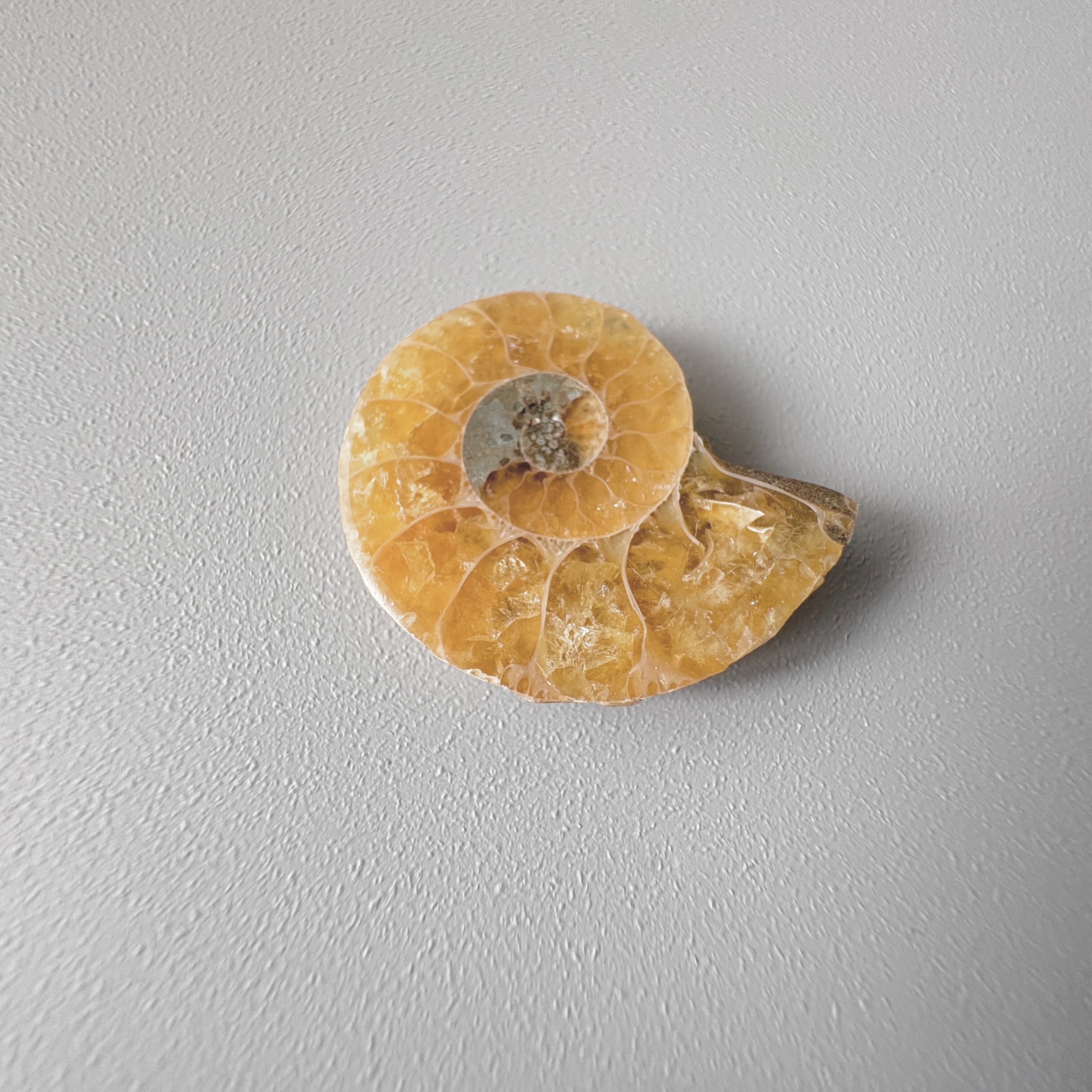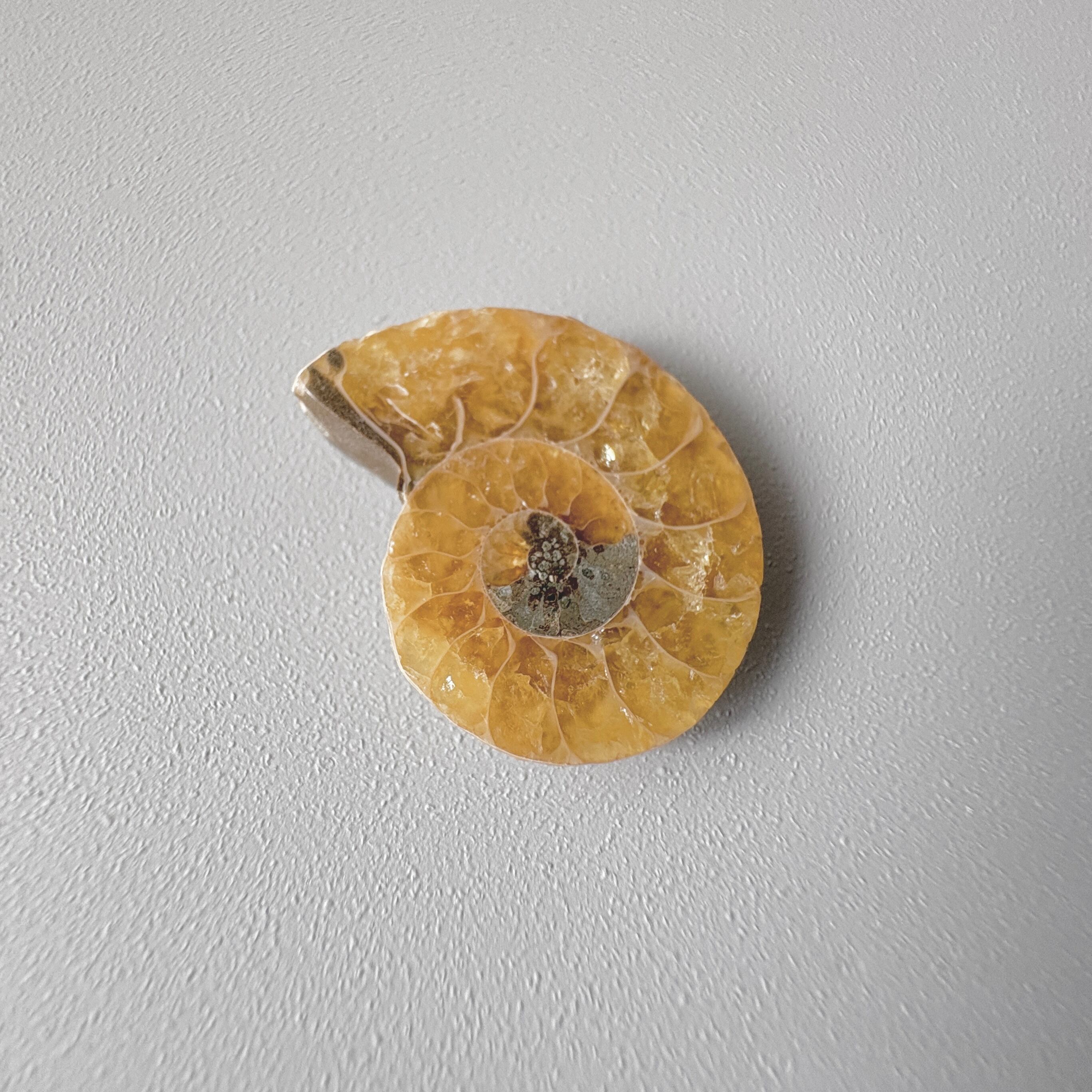 化石といえばアンモナイト。一つのアンモナイトをスライスし、表面を磨いたものです。裏面は未加工で遊色効果があります。
