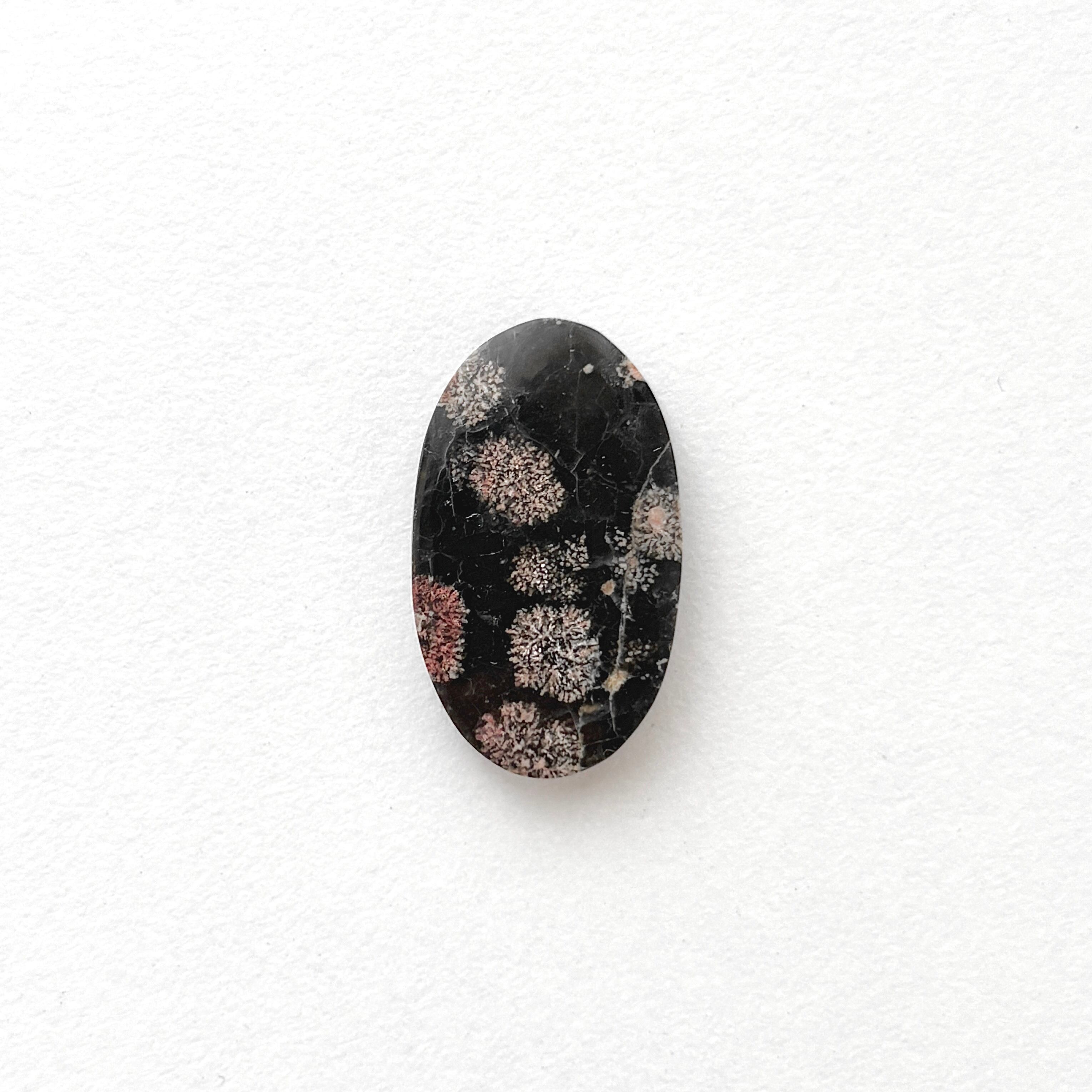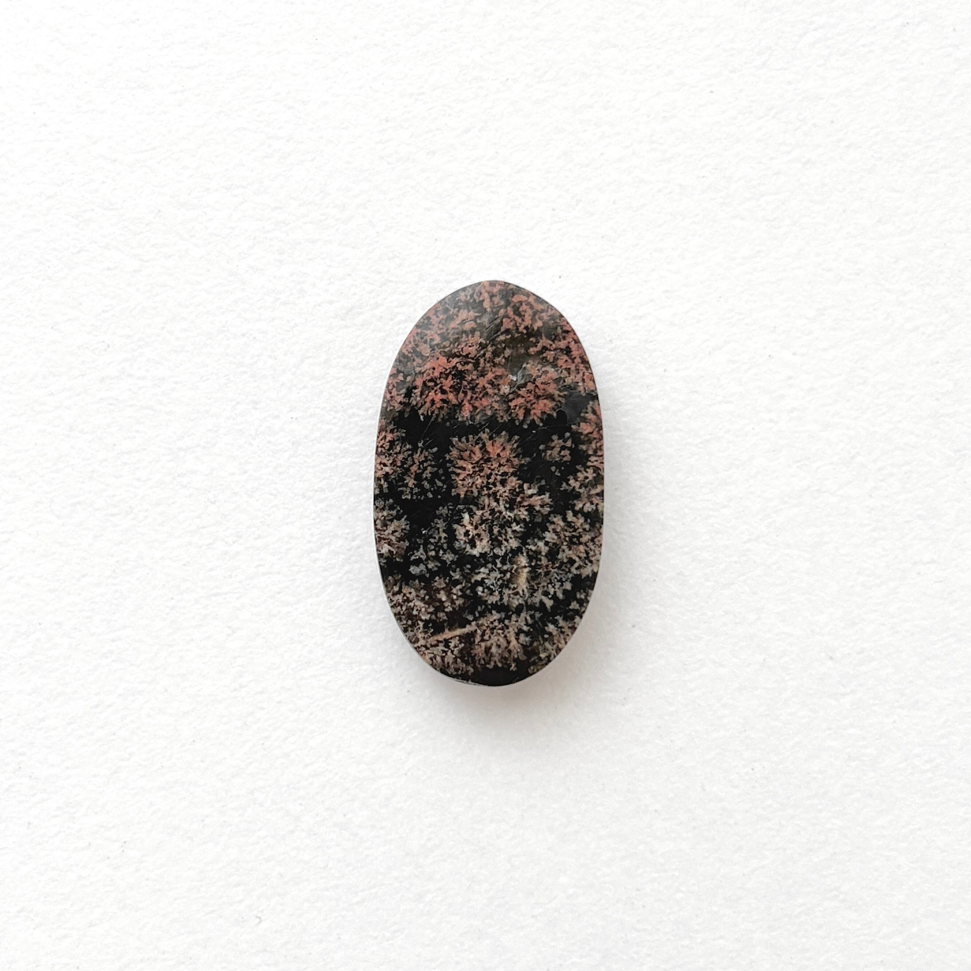 夏の夜空に打ち上げられる花火のような模様の天然ガラス (黒曜石) です。