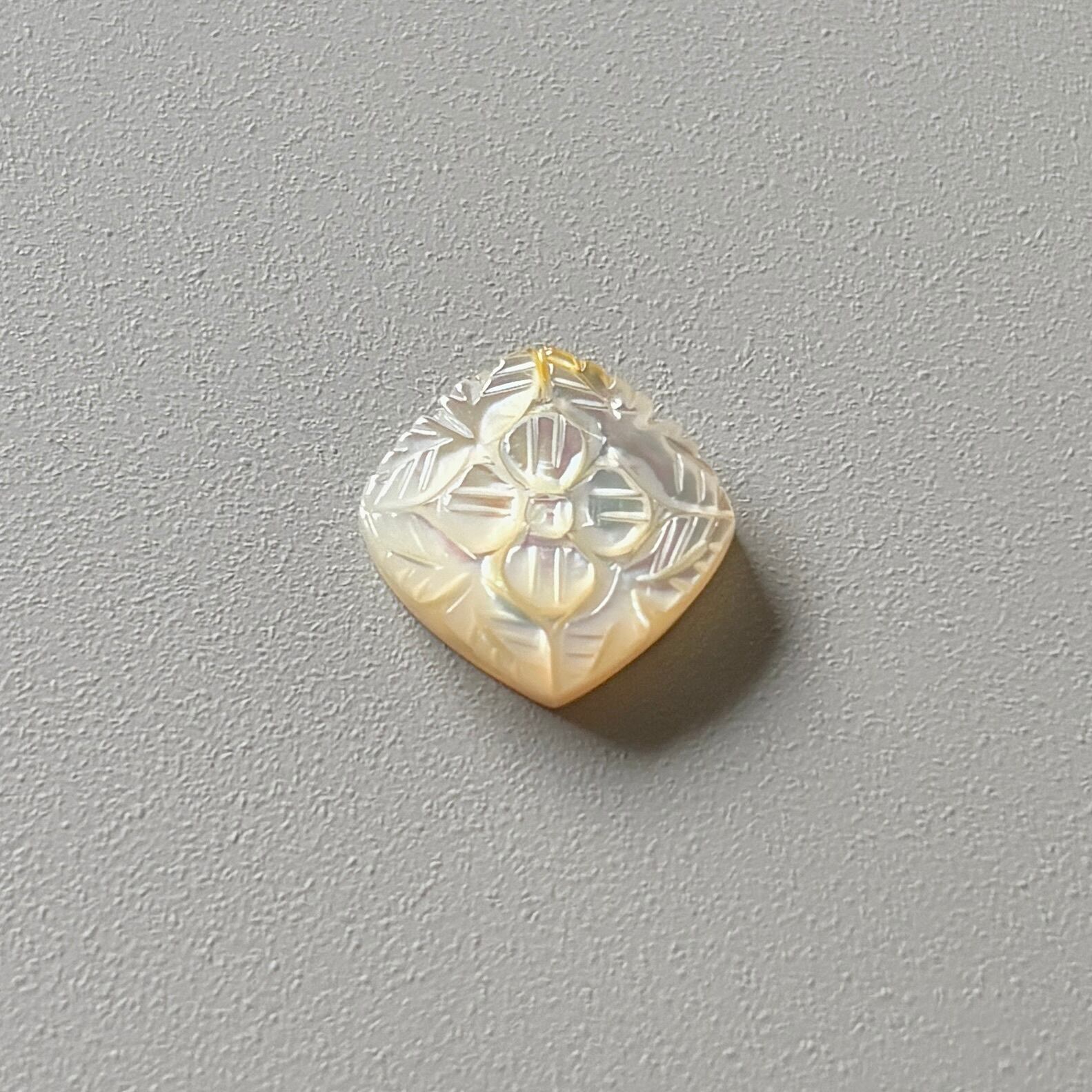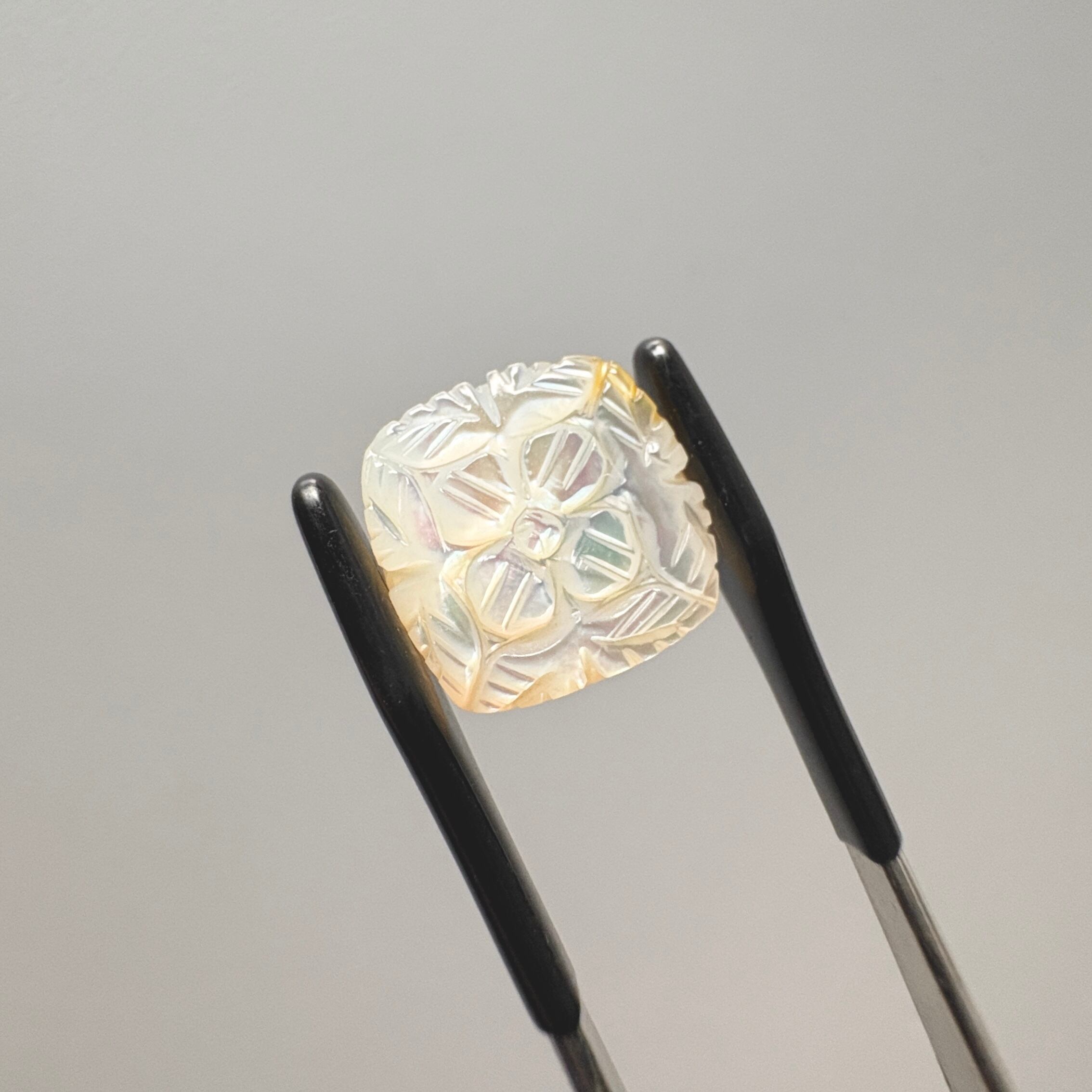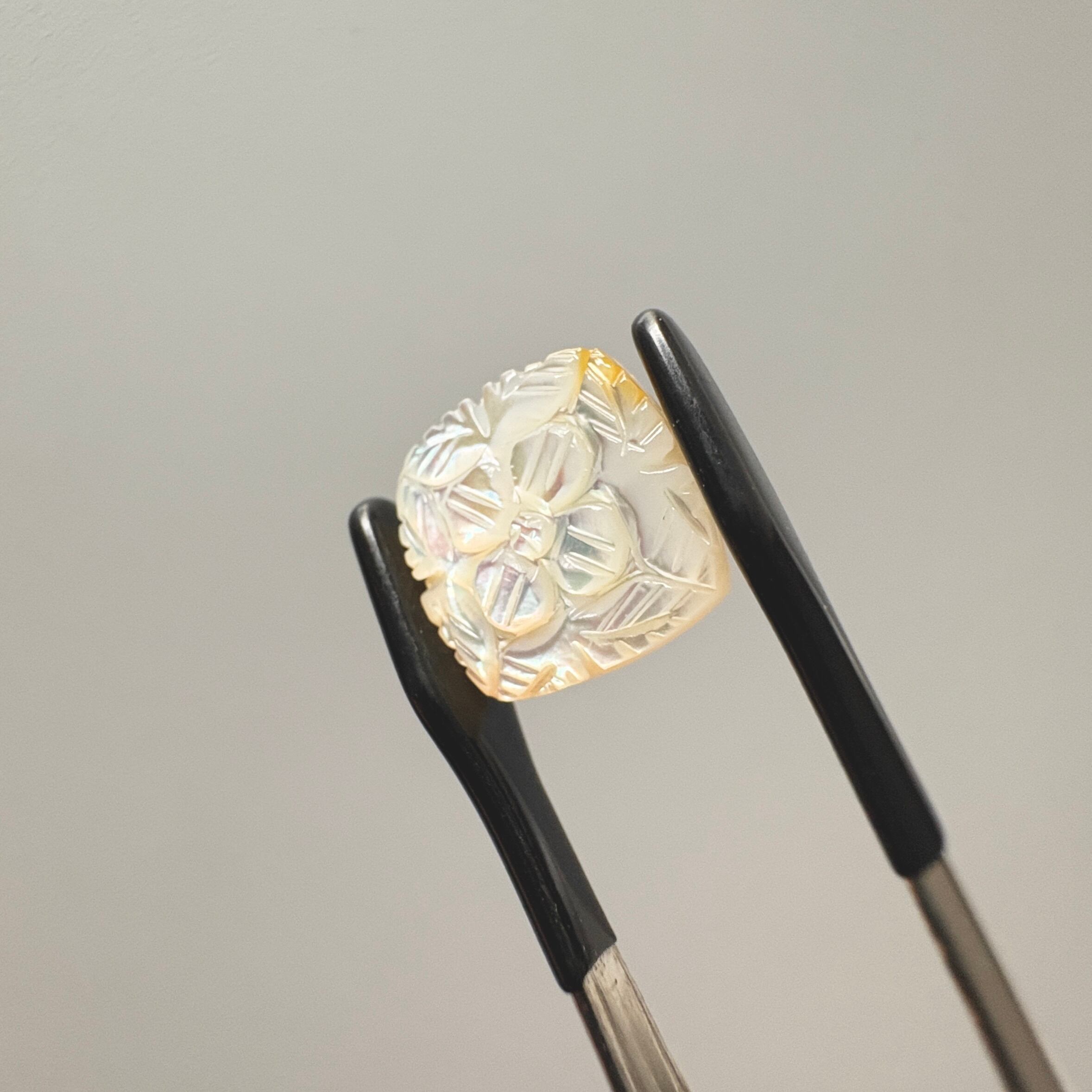 虹色に煌めくマザーオブパール (真珠母貝) のカービングです。