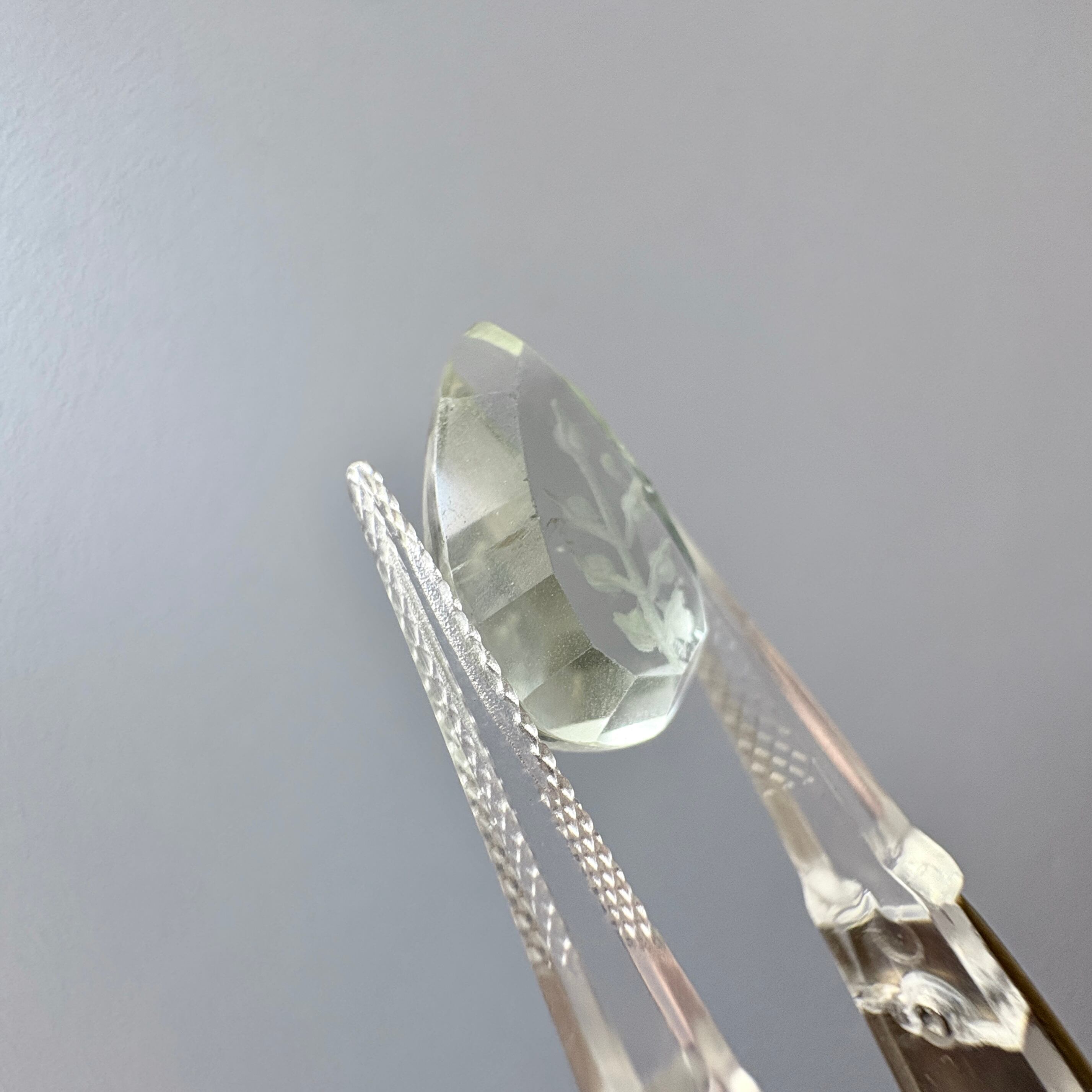 フラットな裏面に沈み彫りが施されたグリーンアメシストです。