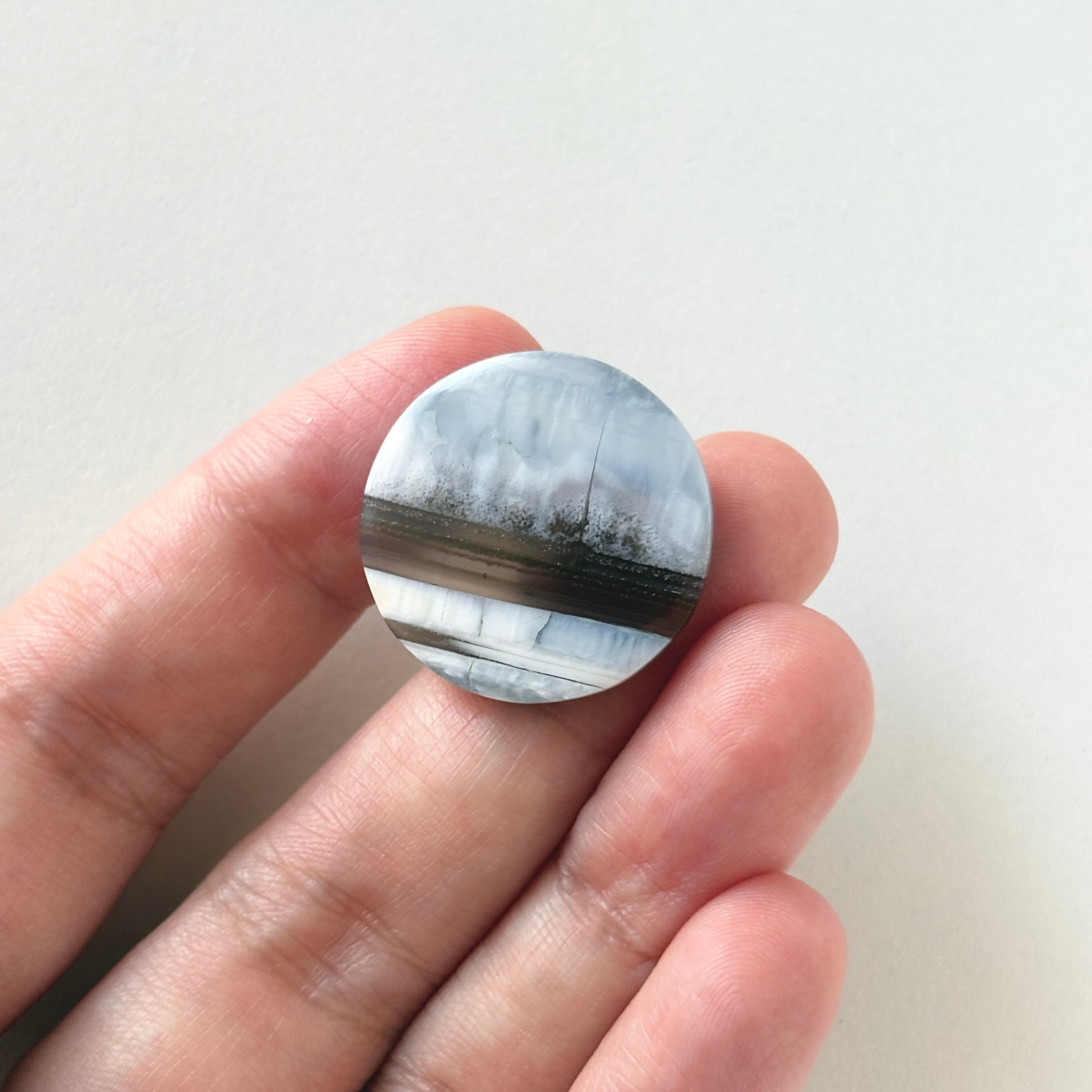 ブルーと白、チャコールグレーの層からなるコモンオパール。チャコールグレーの部分はカルセドニーで透け感があります。