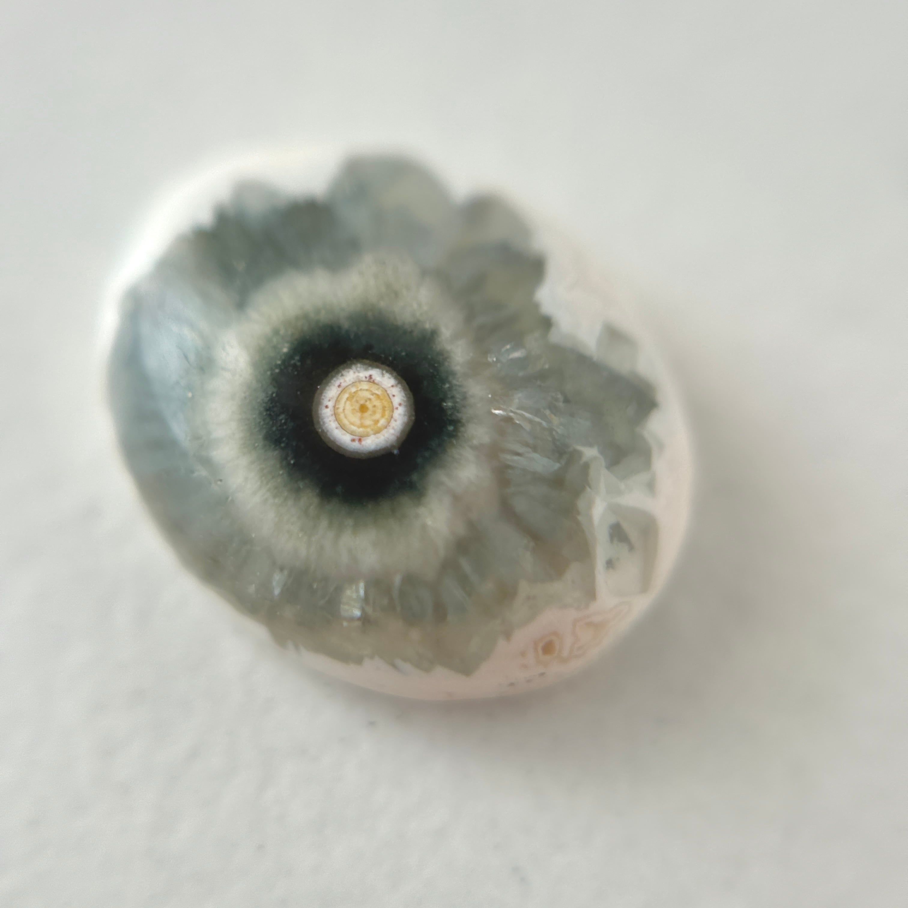 外側の緑部分は半透明でしゃりしゃりとした質感です。真っ白な地に異世界の花が咲いてるようです。