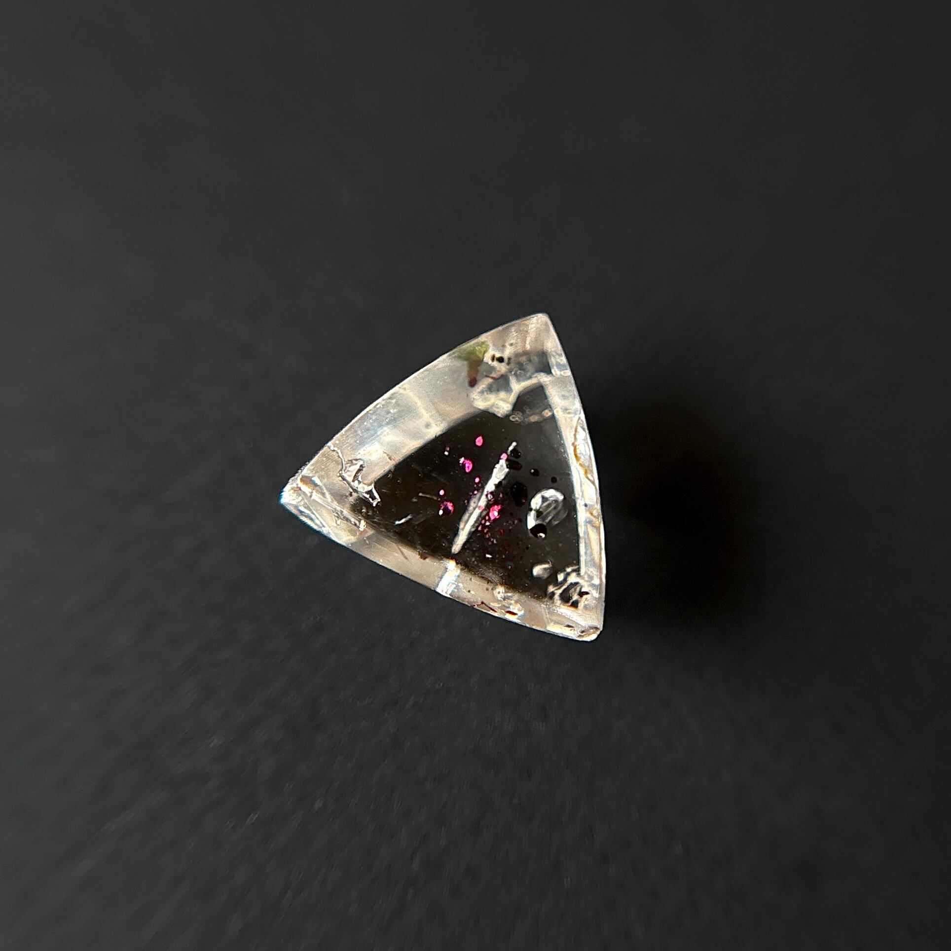 無色でクリアな地の中央で、大きめのコベライトが大胆に輝きます。裏面近くに小さな空洞のような内包物が見られますので、ルーペで観察していただきたいです。