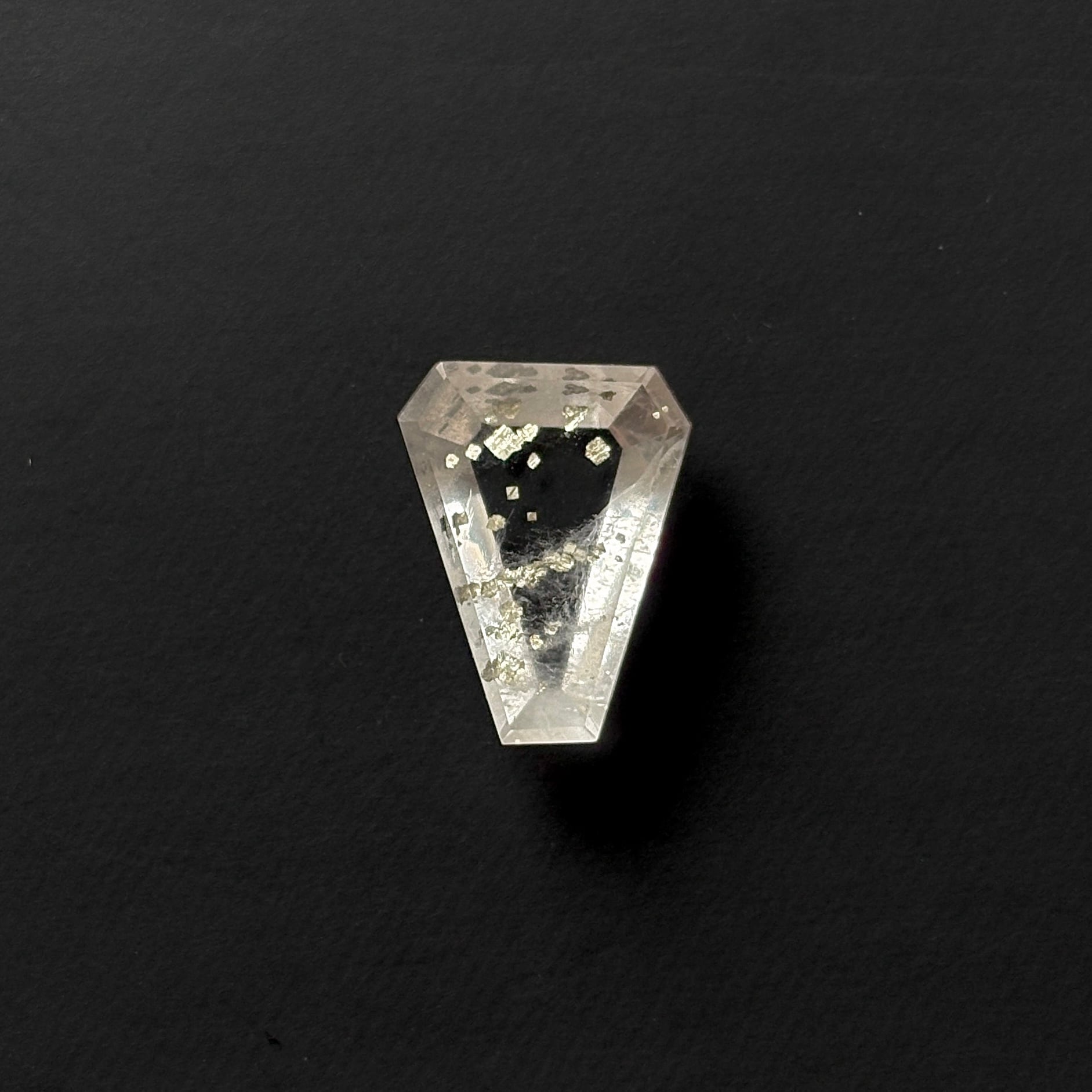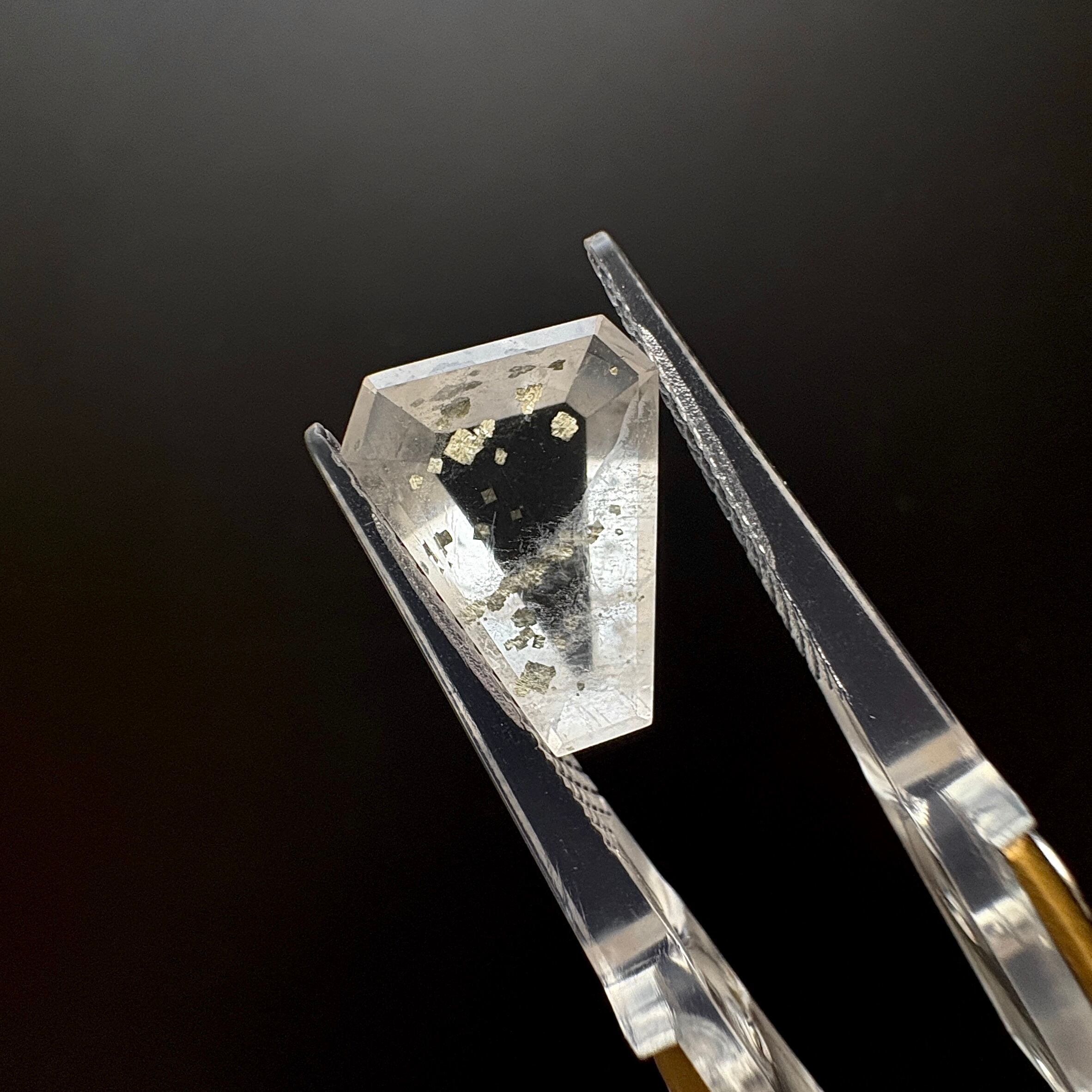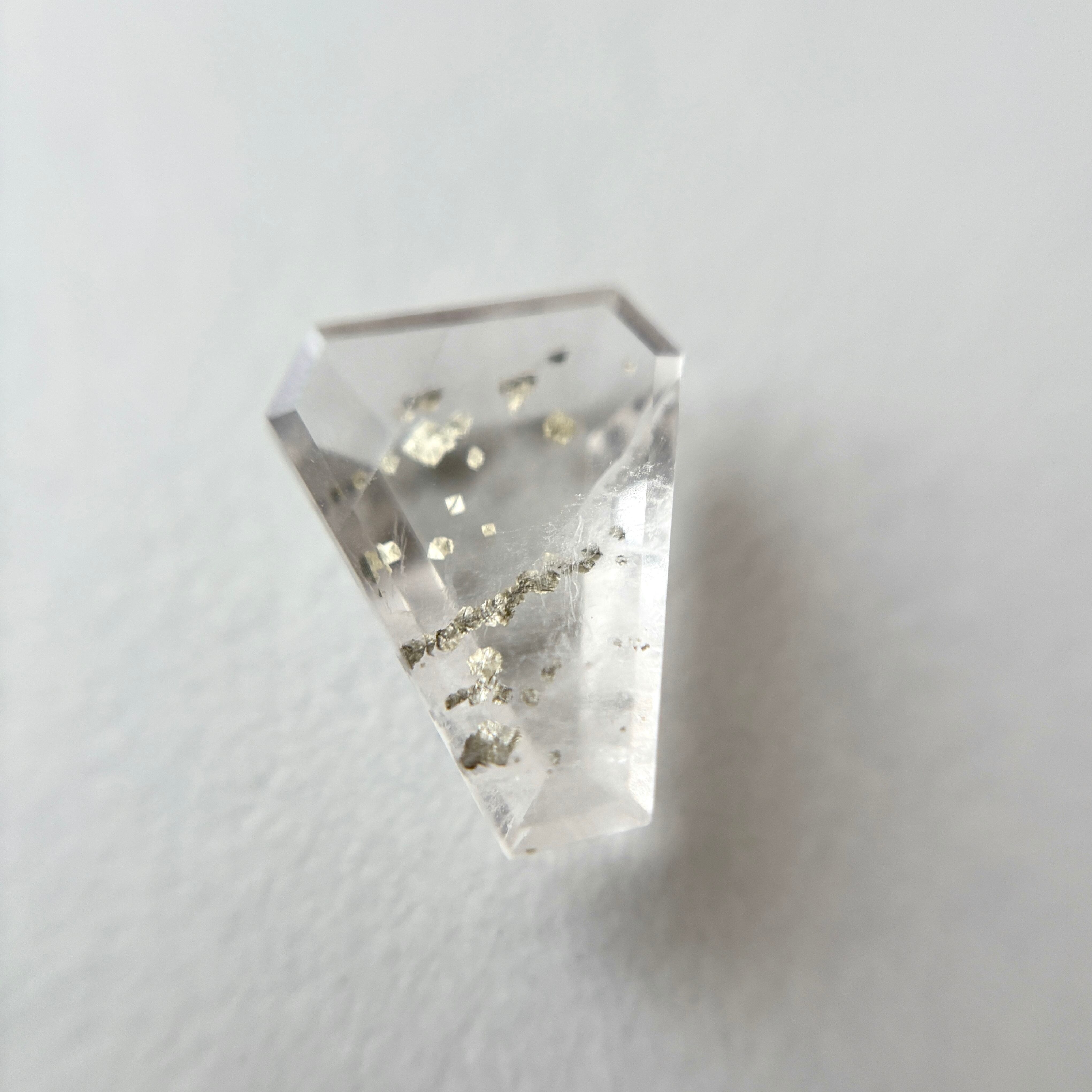 金に似た光沢を見せるパイライト (マーカサイト) を内包した水晶です。