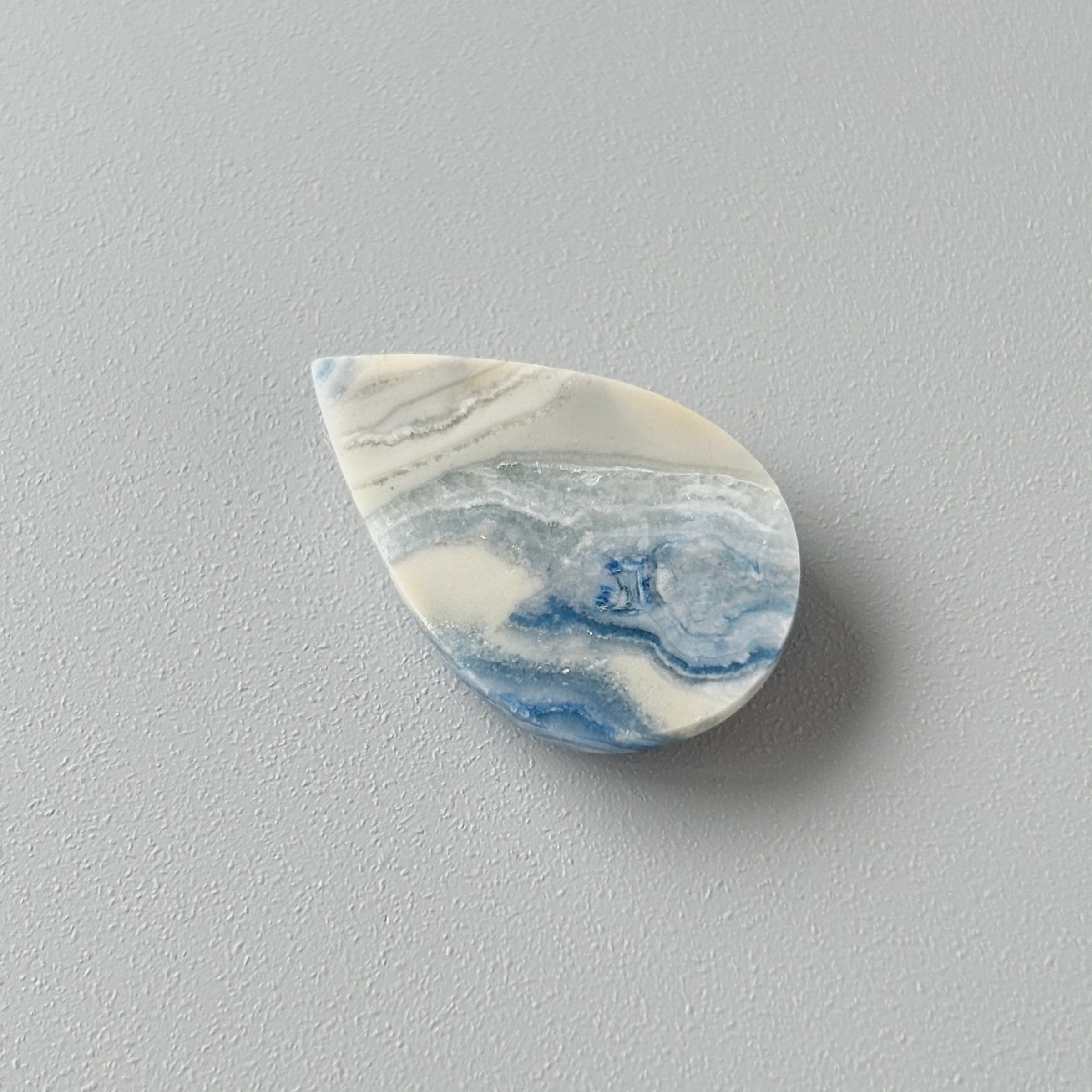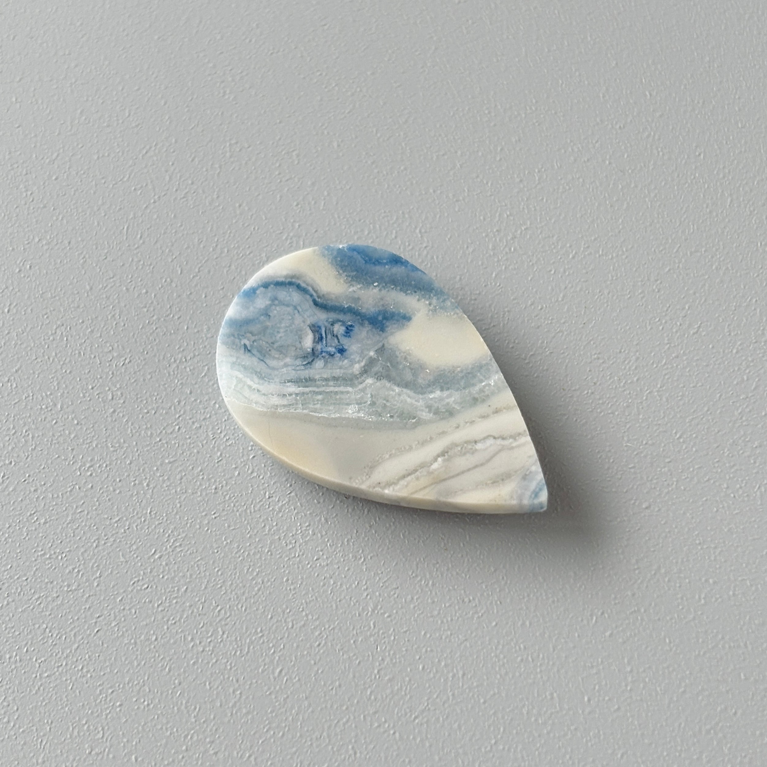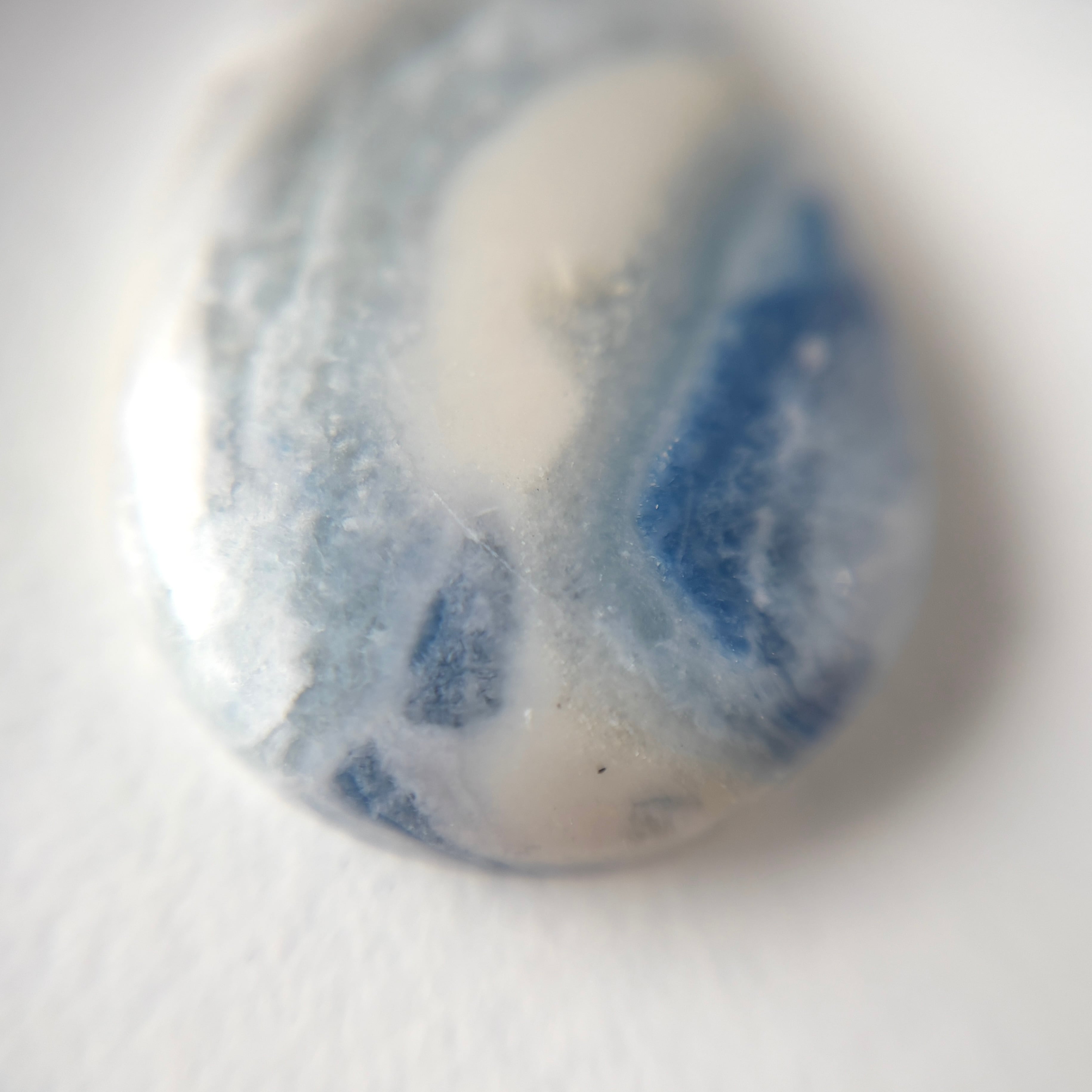乳白色のクリーミーなシェーライトに、ブルーのドロマイトが入ったブルーシェーライト。シャリっとした結晶部分はキラキラ光を反射します。