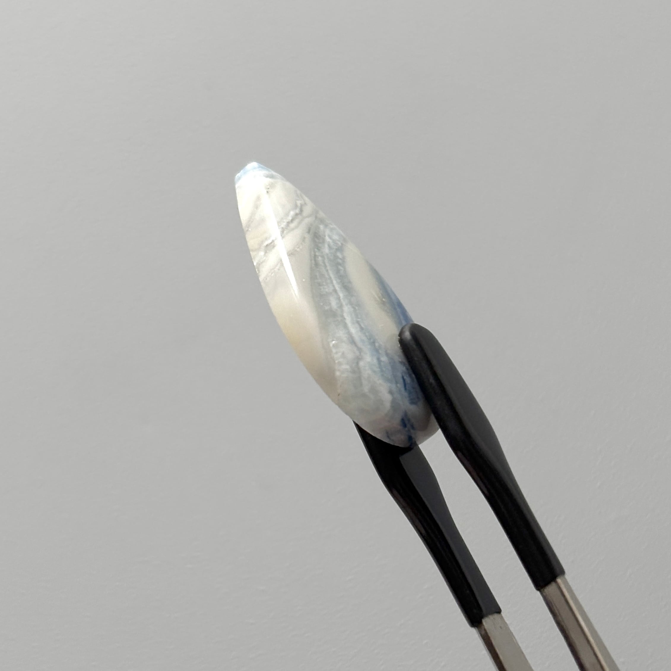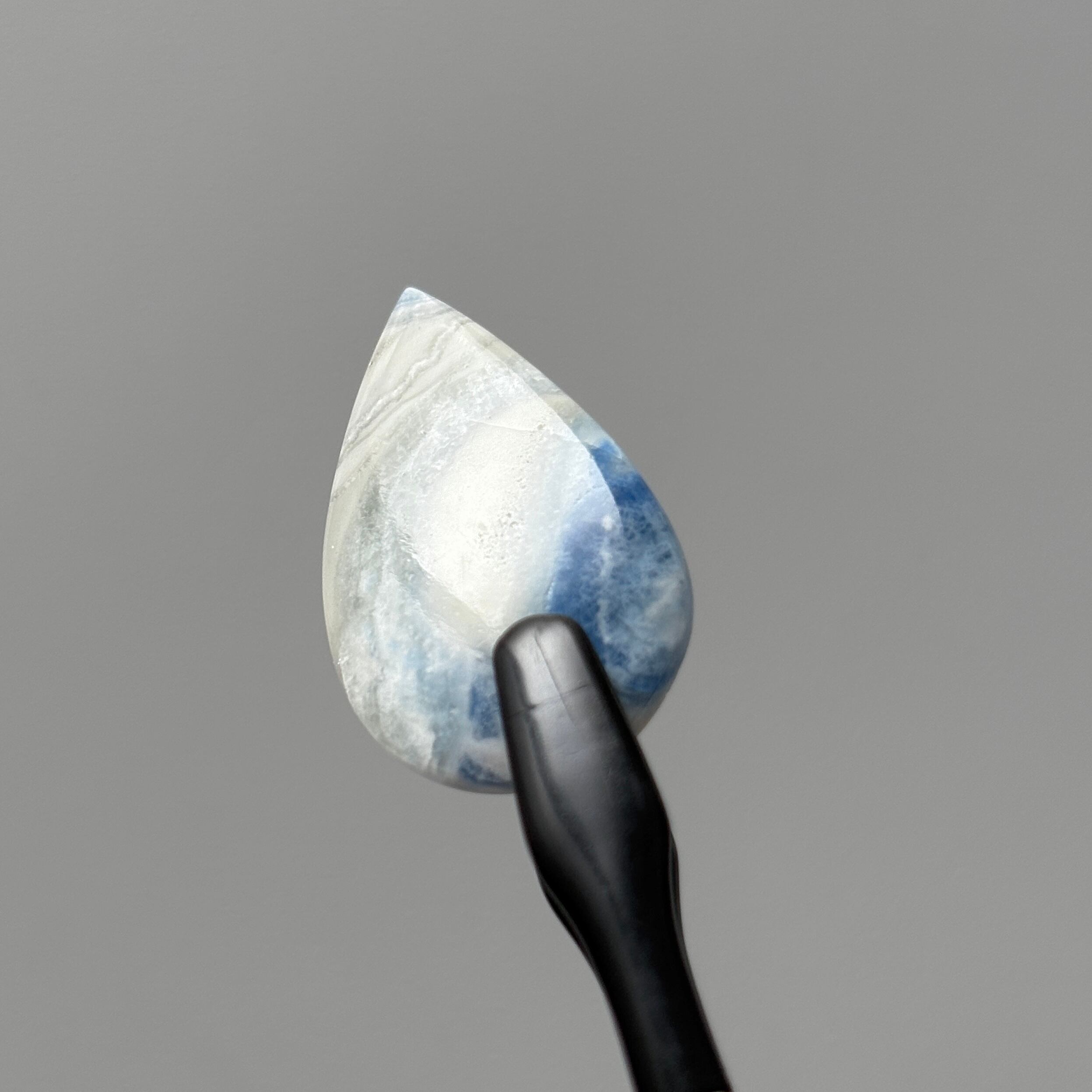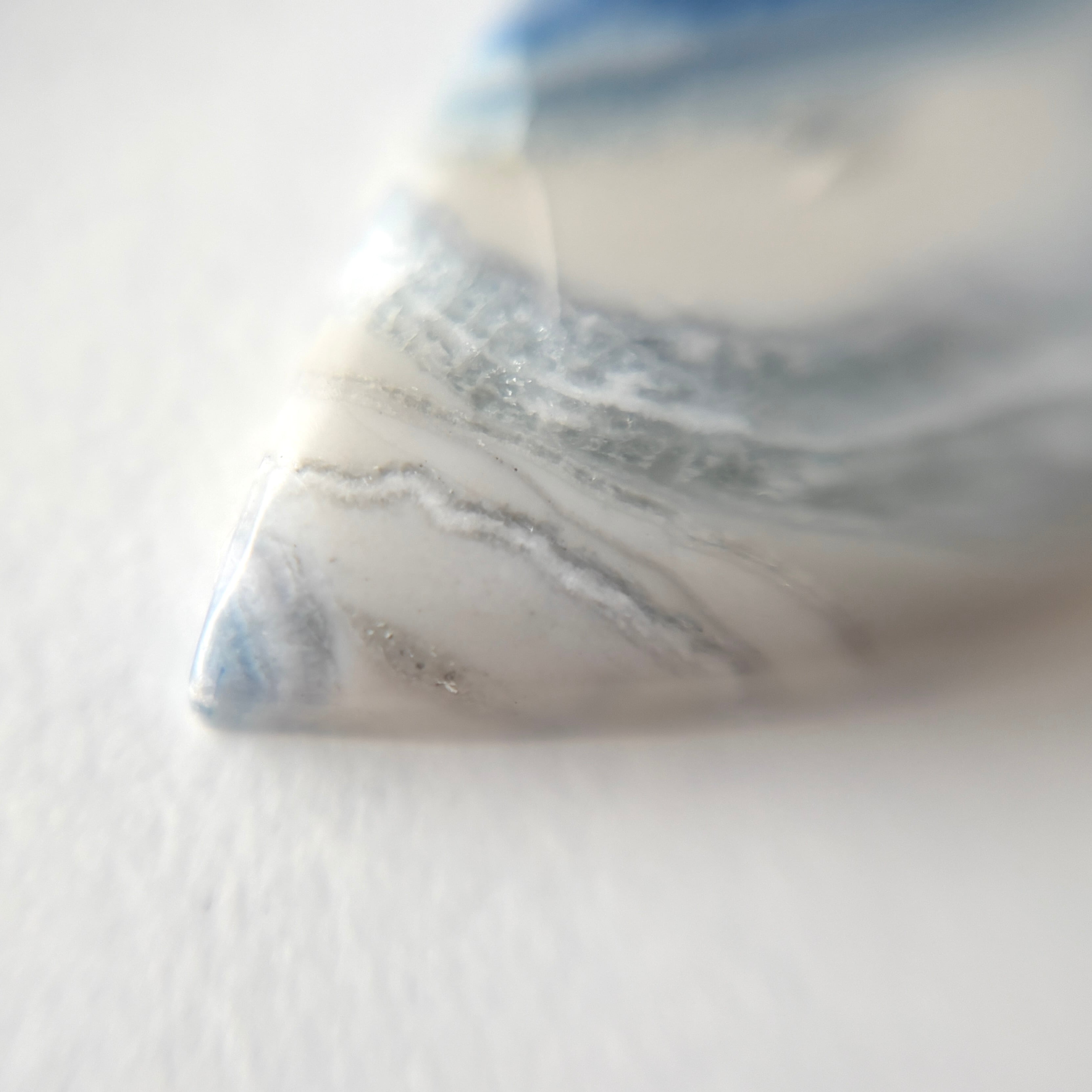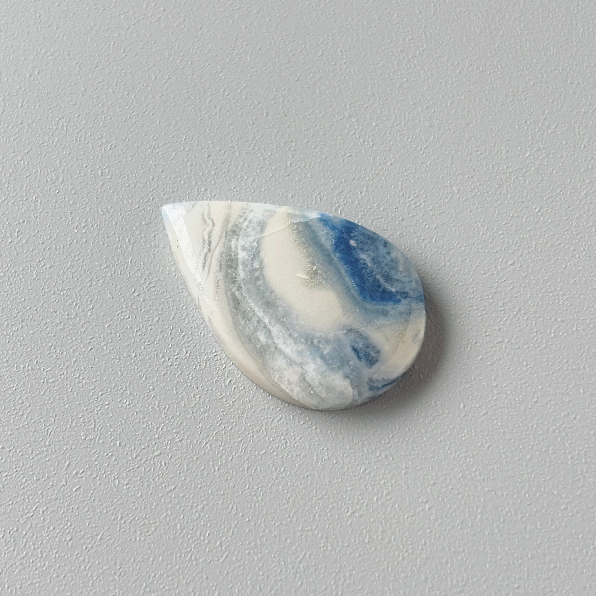 乳白色のクリーミーなシェーライトに、ブルーのドロマイトが入ったブルーシェーライト。シャリっとした結晶部分はキラキラ光を反射します。