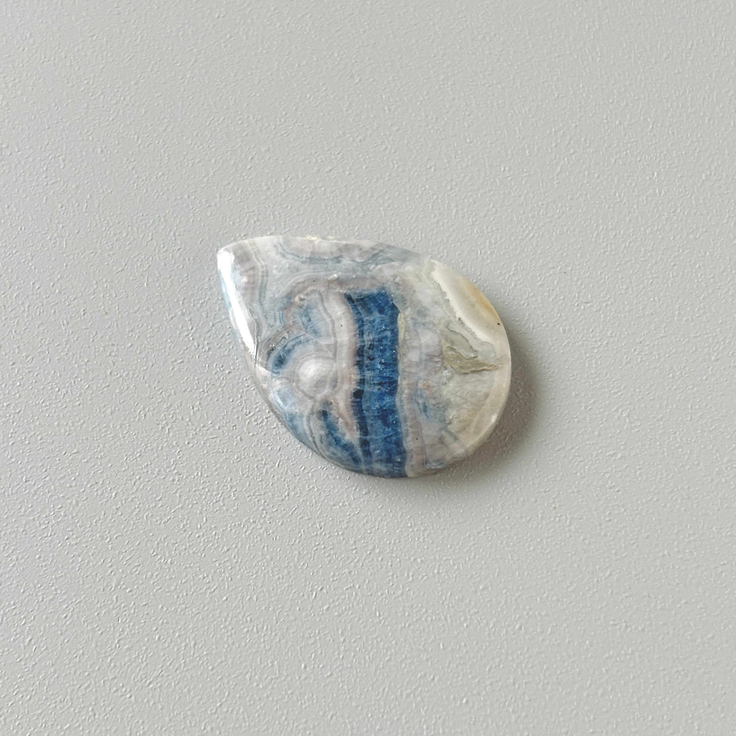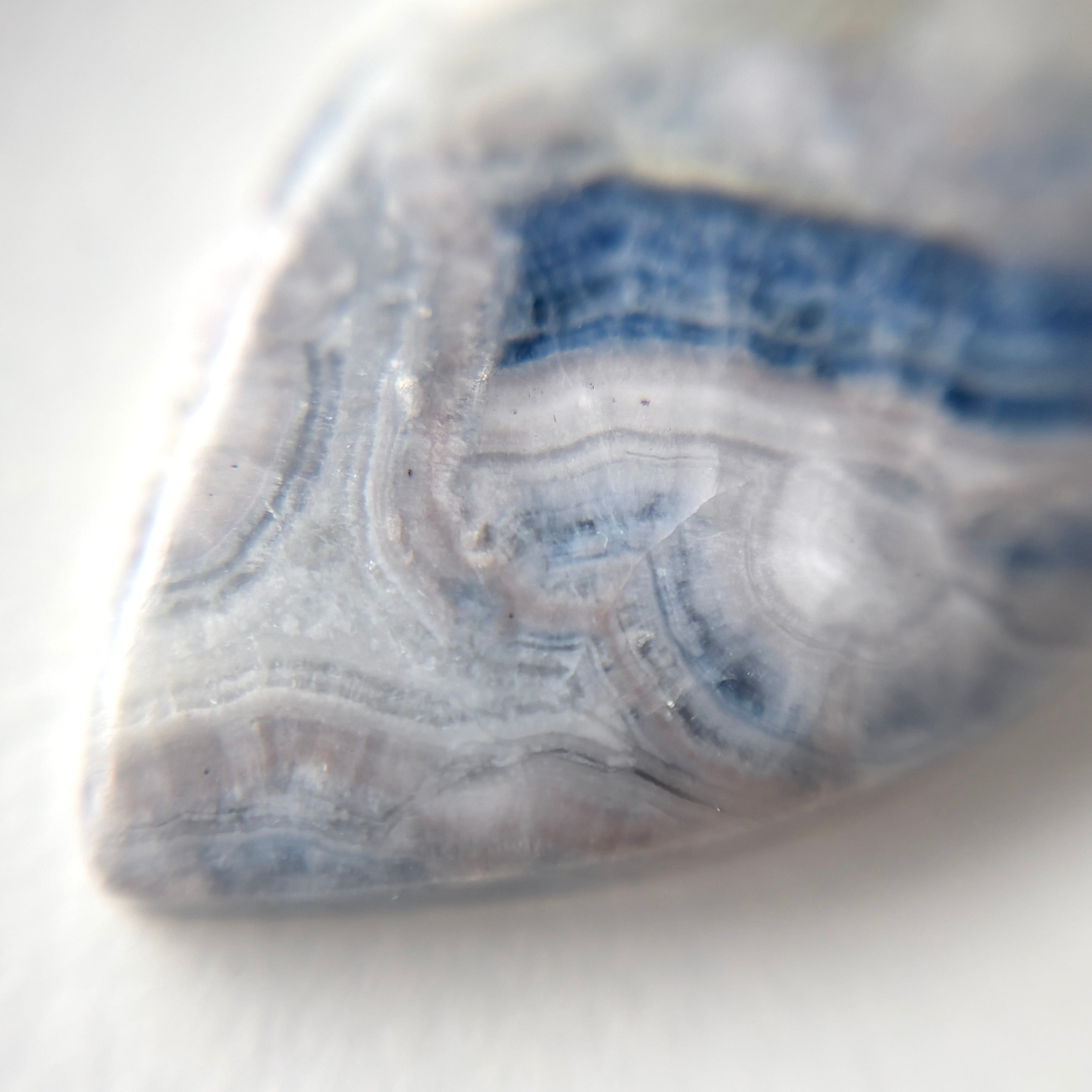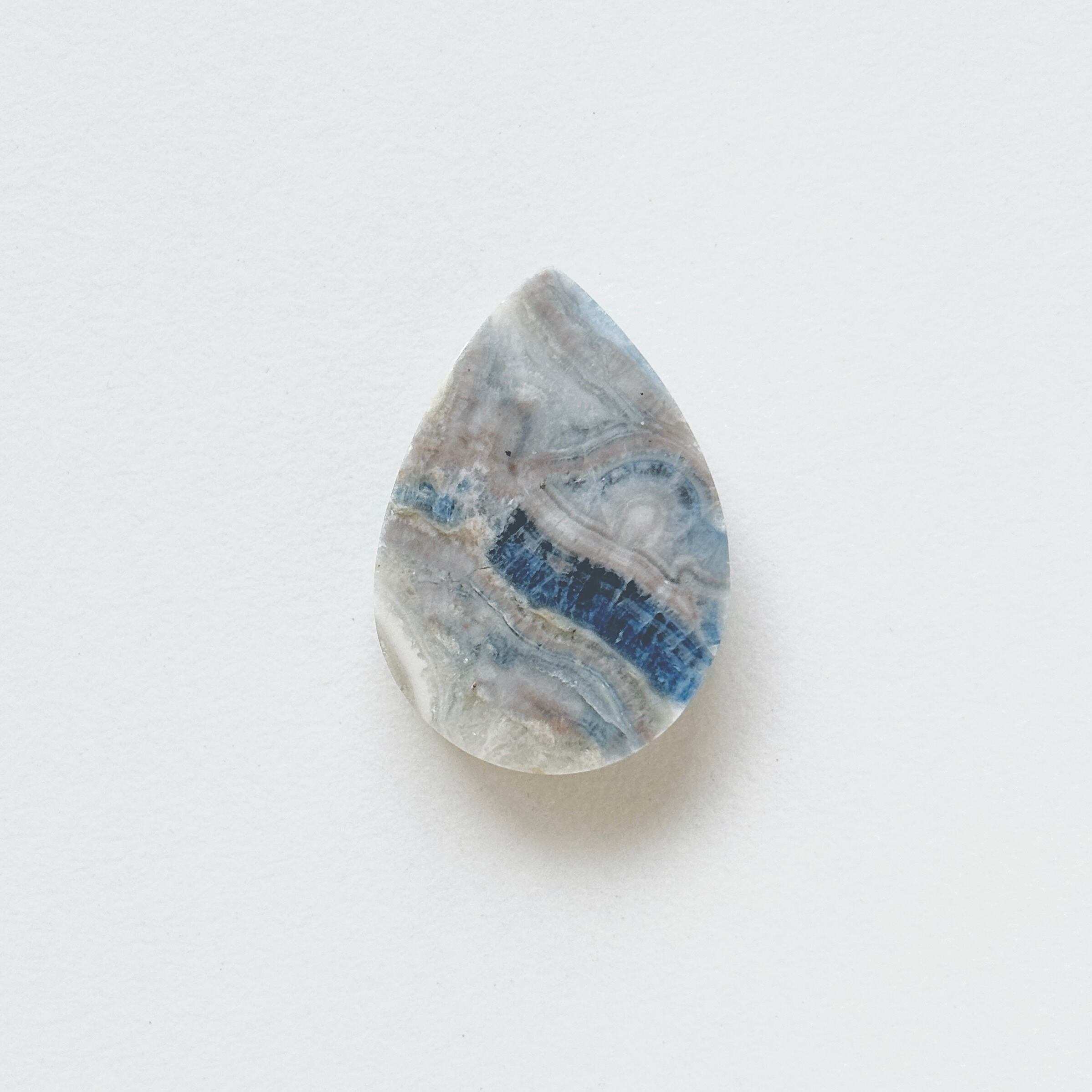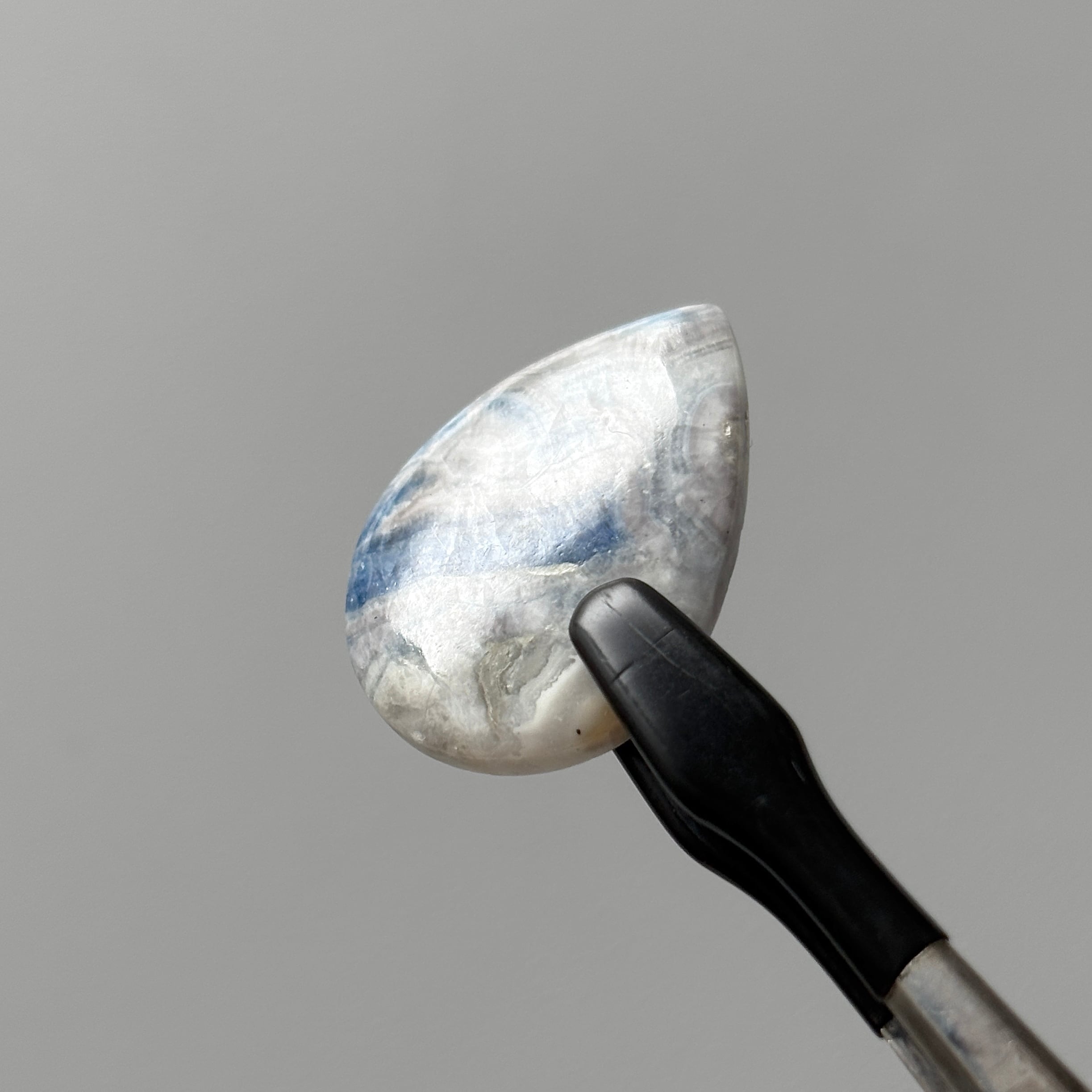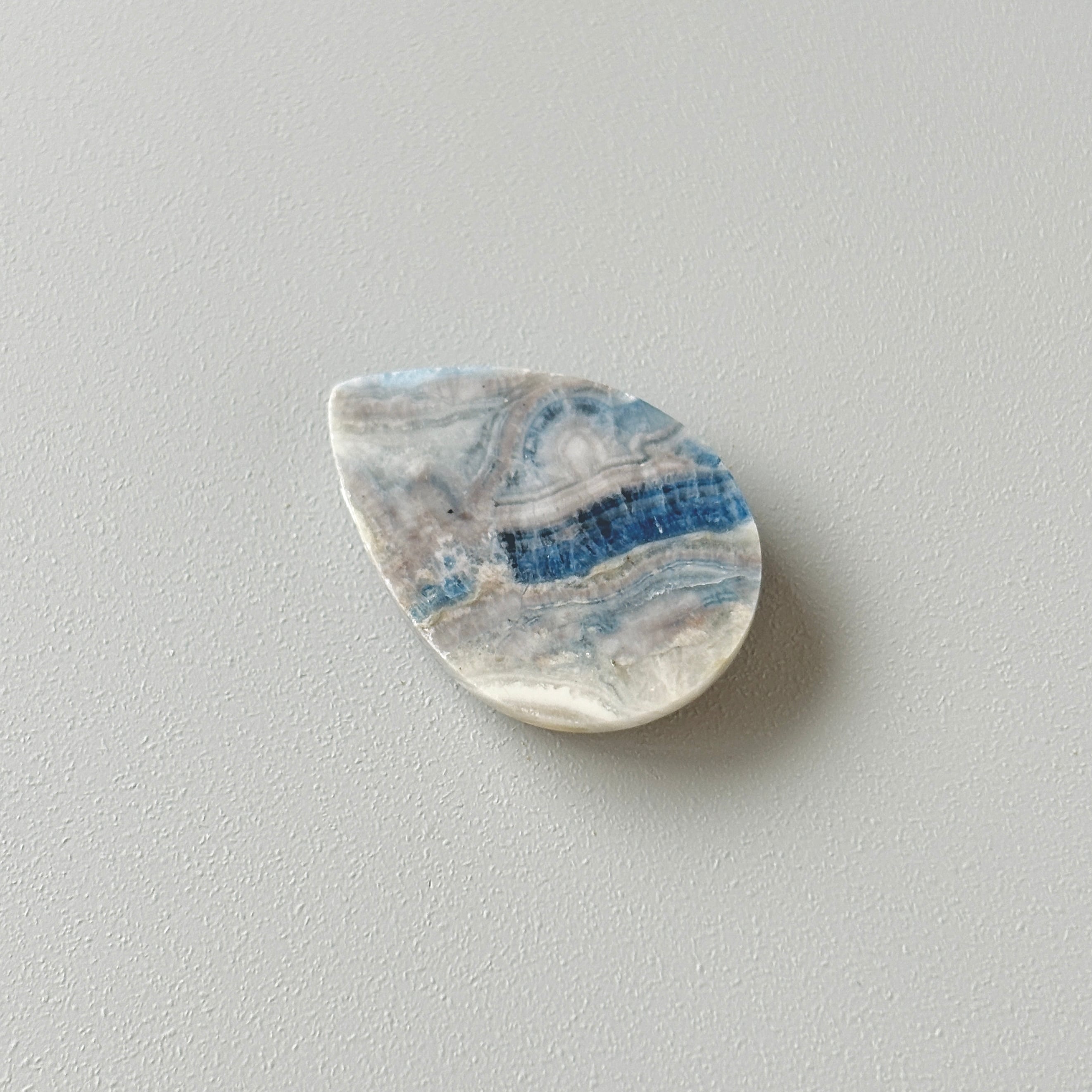 乳白色のクリーミーなシェーライトに、ブルーのドロマイトが入ったブルーシェーライト。シャリっとした結晶部分はキラキラ光を反射します。