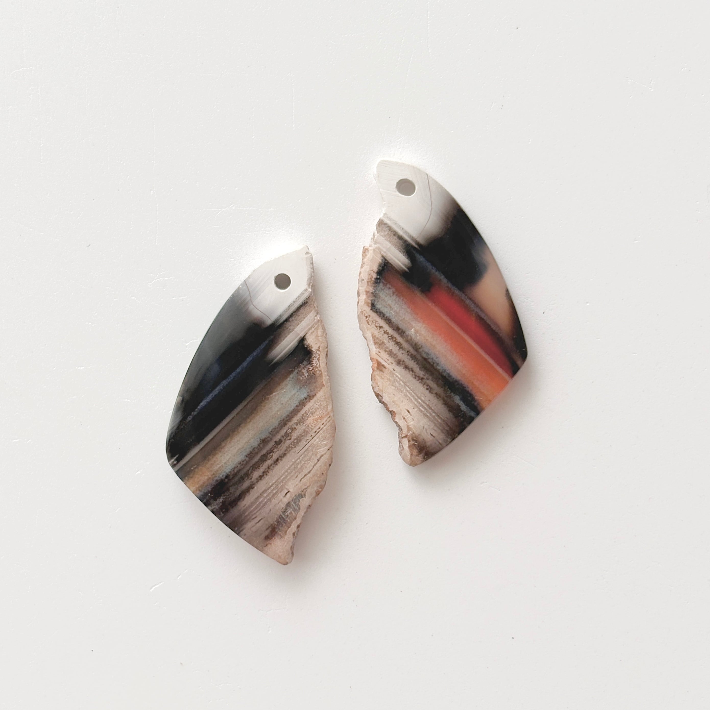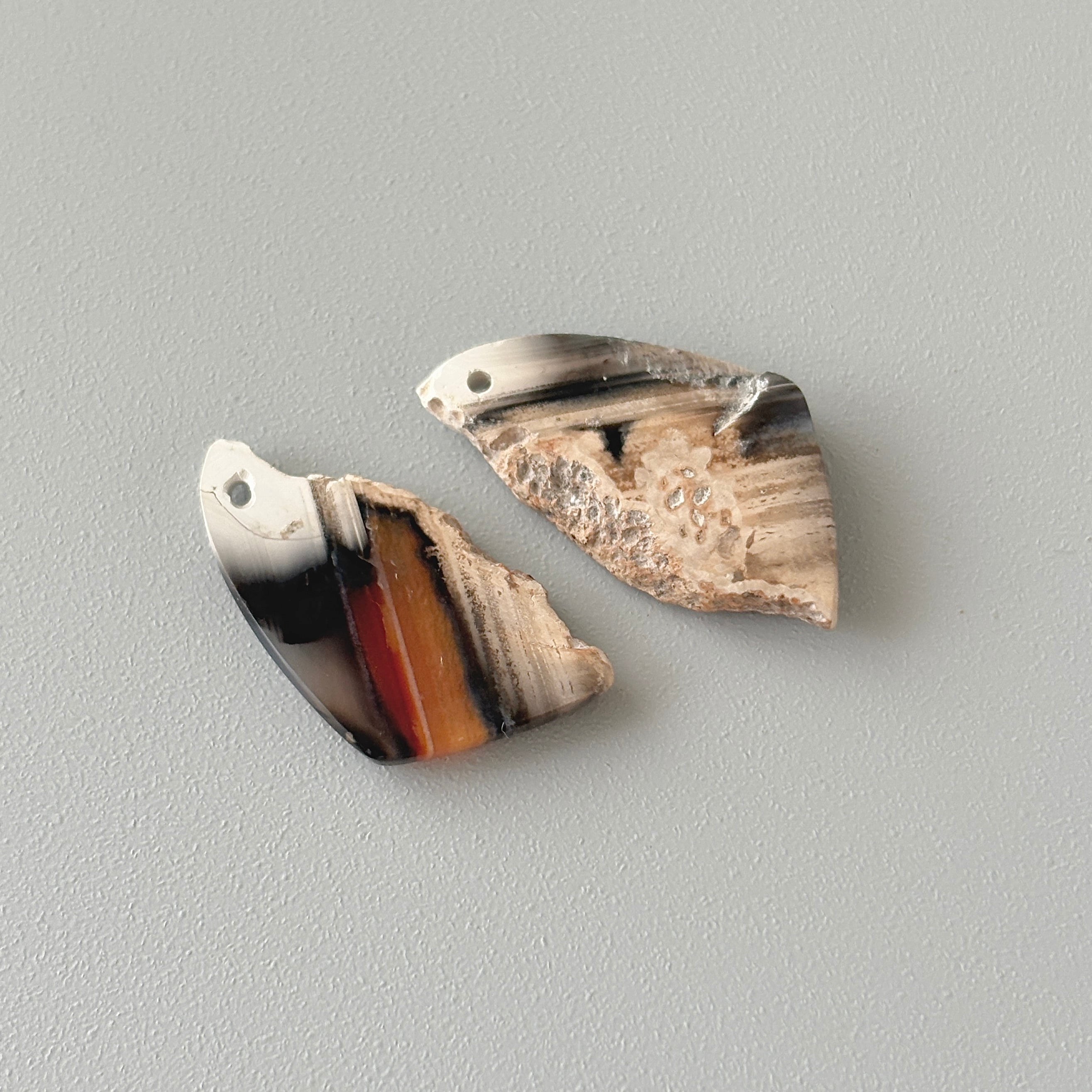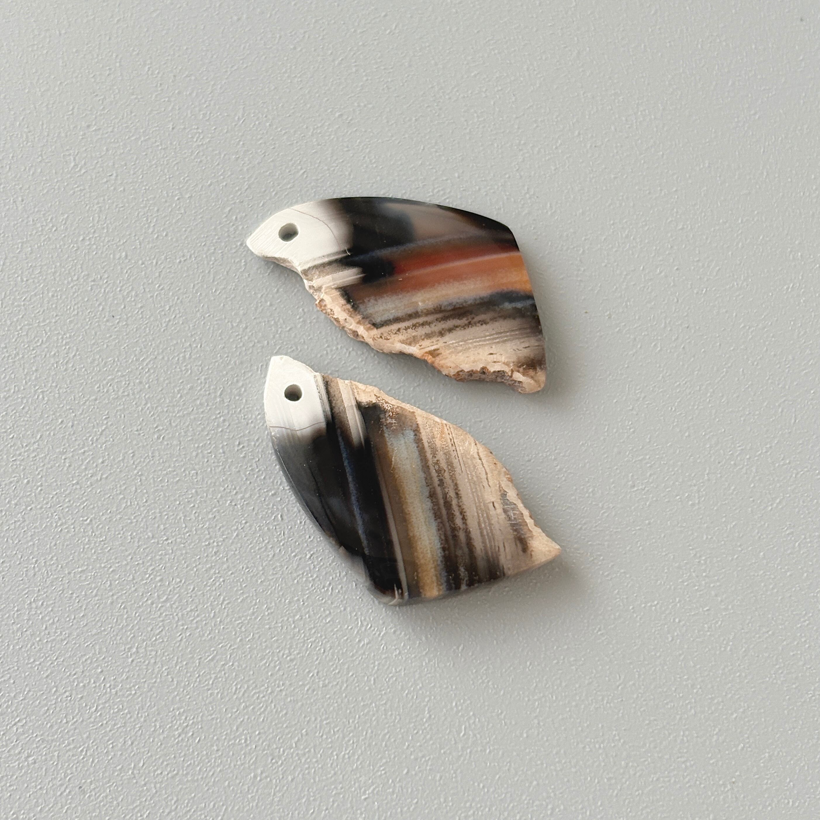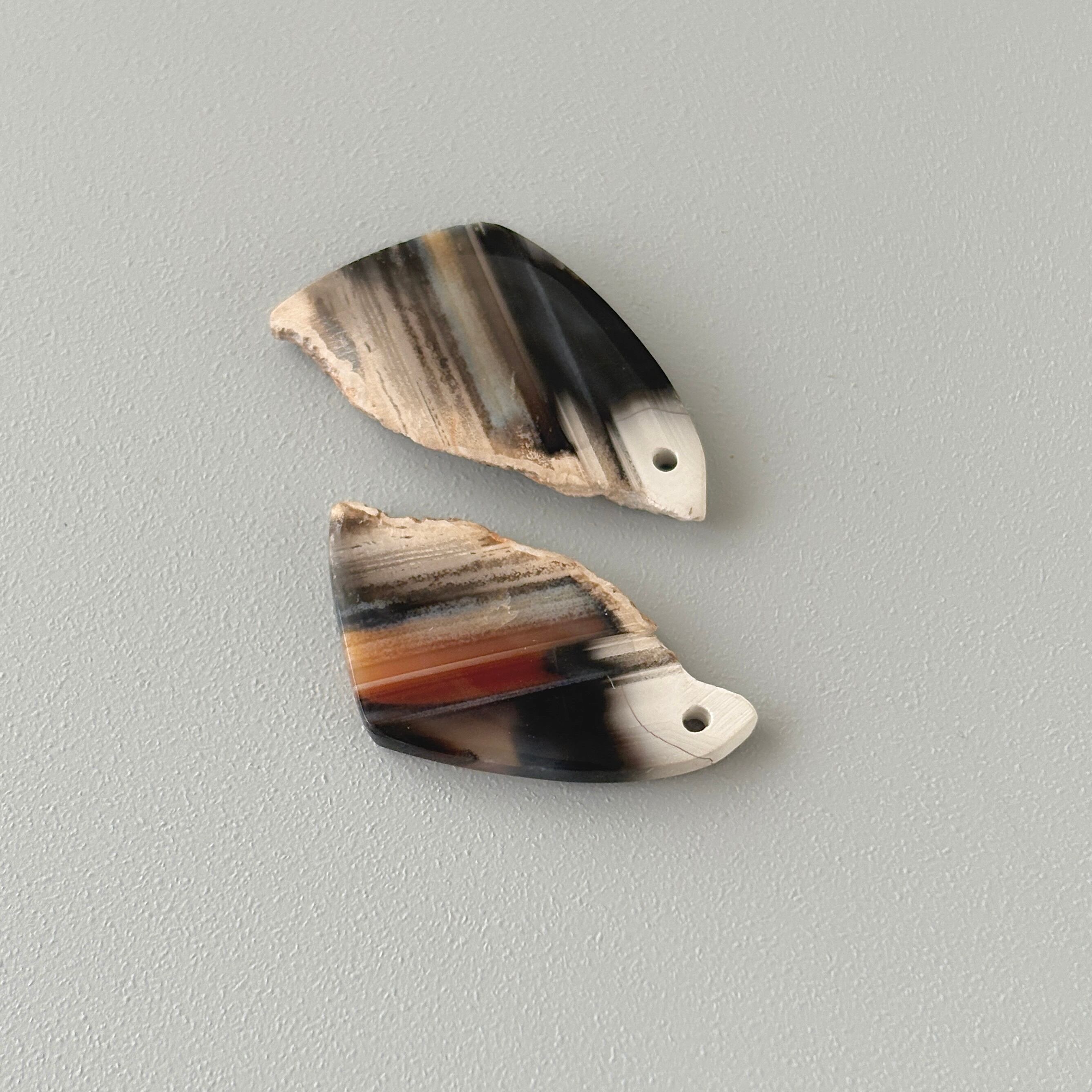 片方は元のカーネリアンらしい色味を残した縞模様があり、もう片方はシックなグレイッシュなカラーでアシンメトリーを楽しめます。