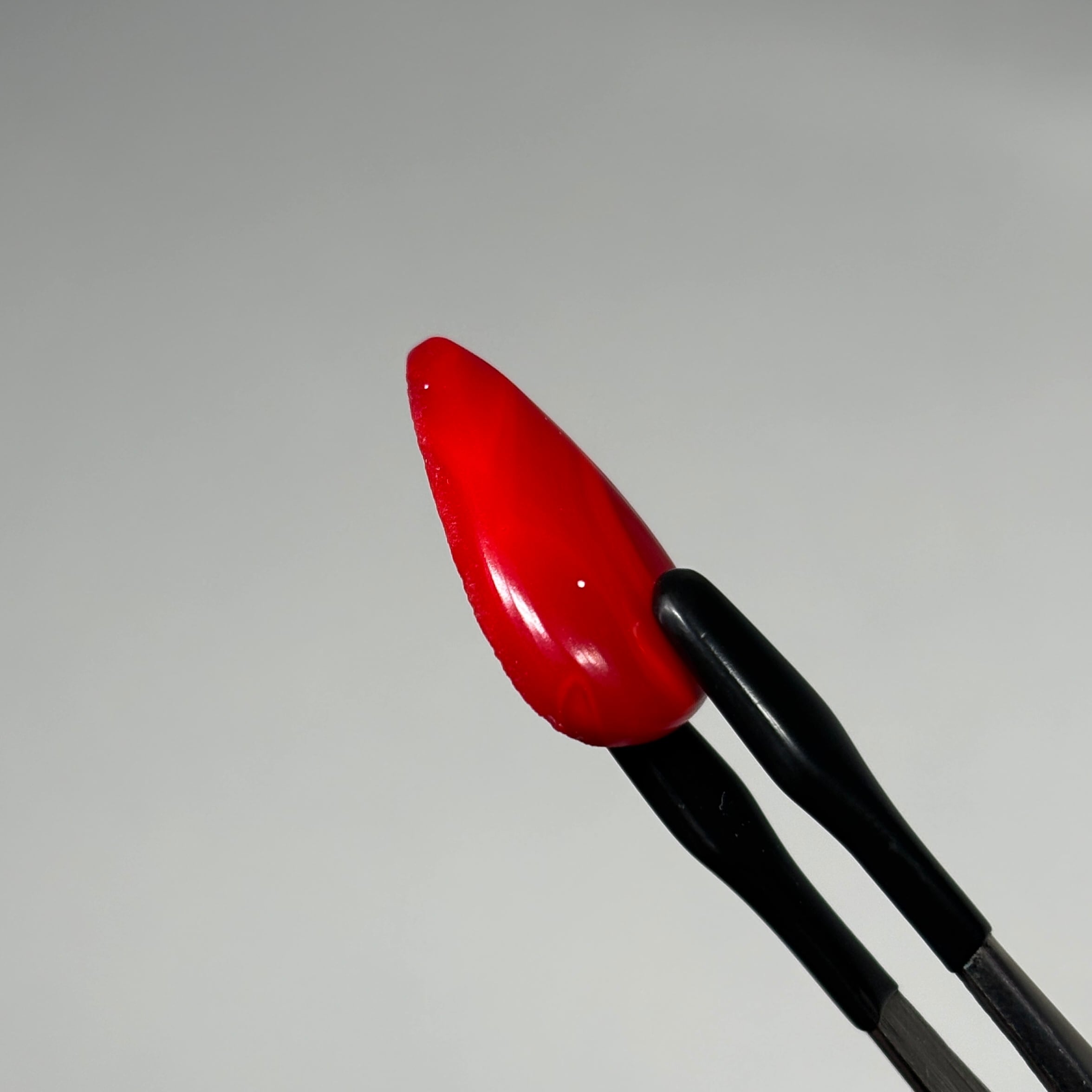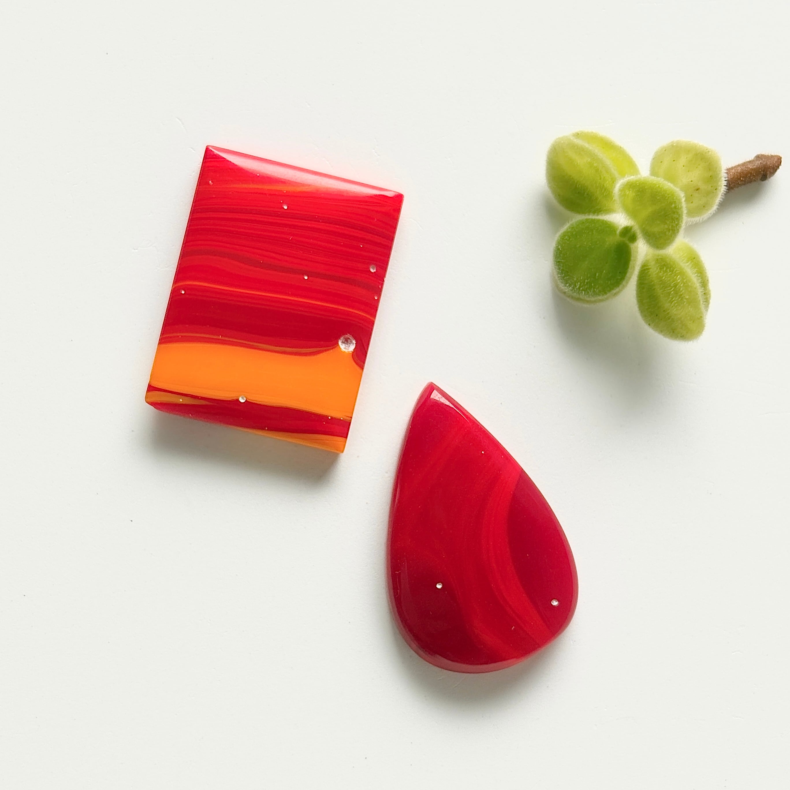 黄色や緑などの色、透明感のあるものなど様々あり、こちらは濃厚な赤とビビッドな赤のマーブル模様で、特有のくぼみの白いドットとあわせて浮遊感があります。