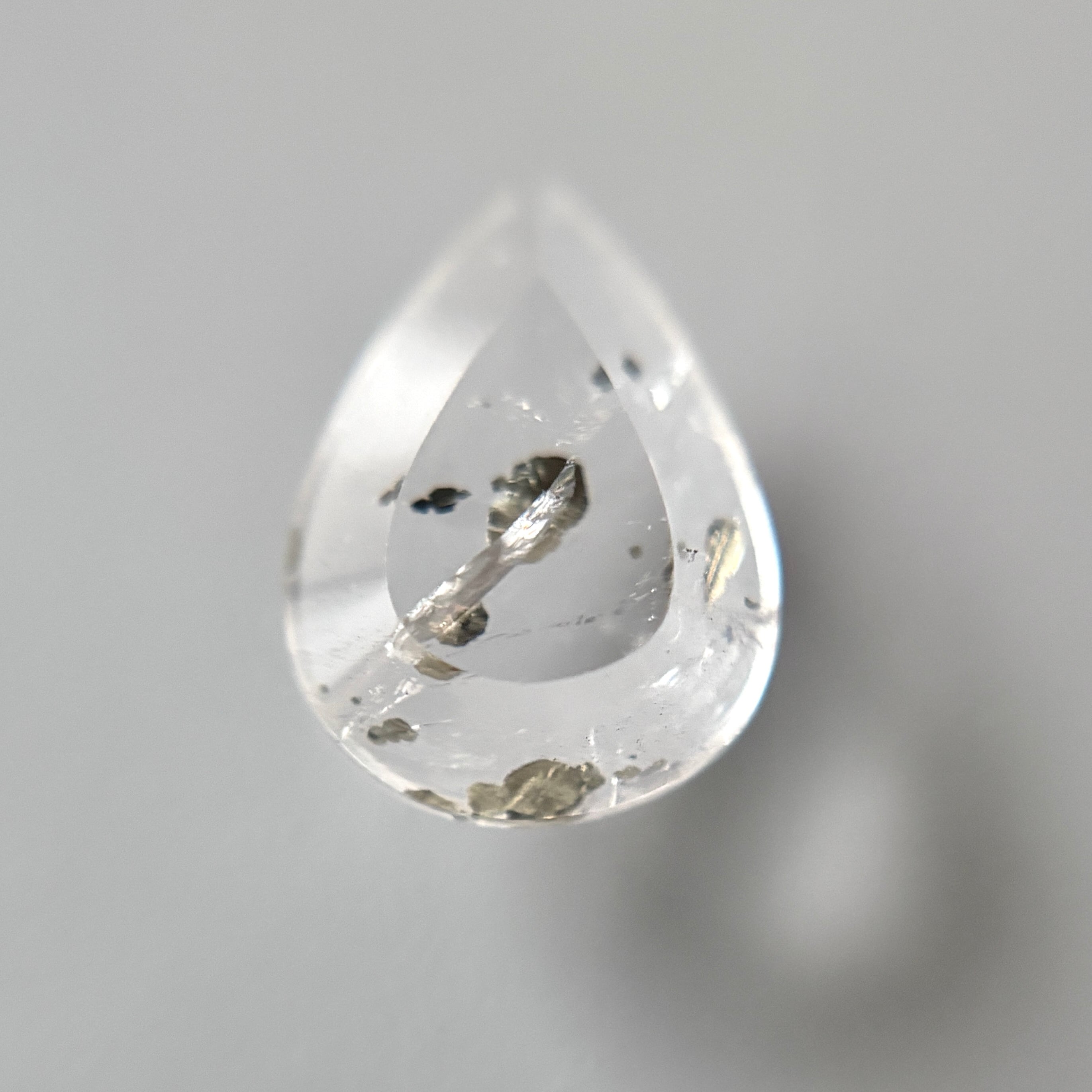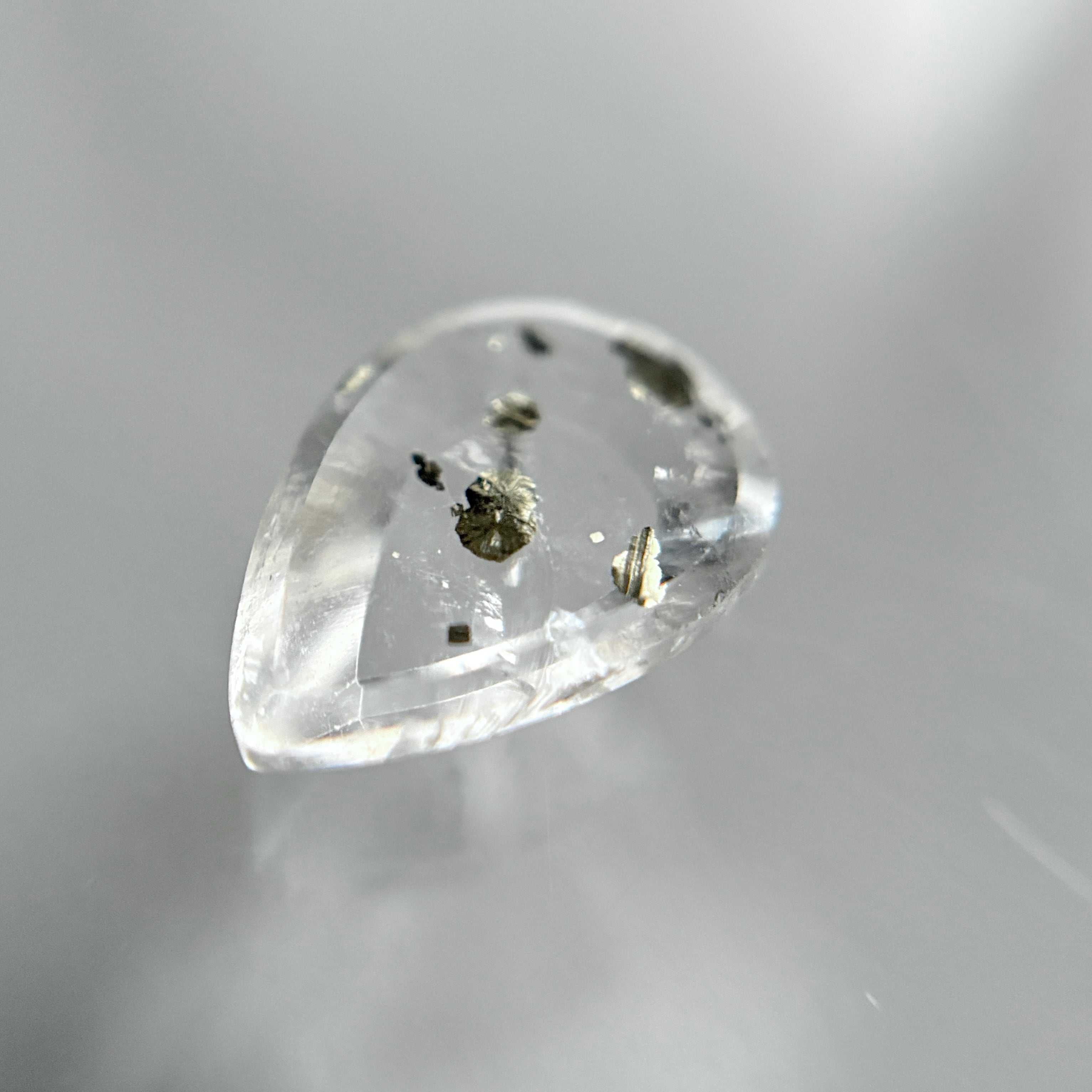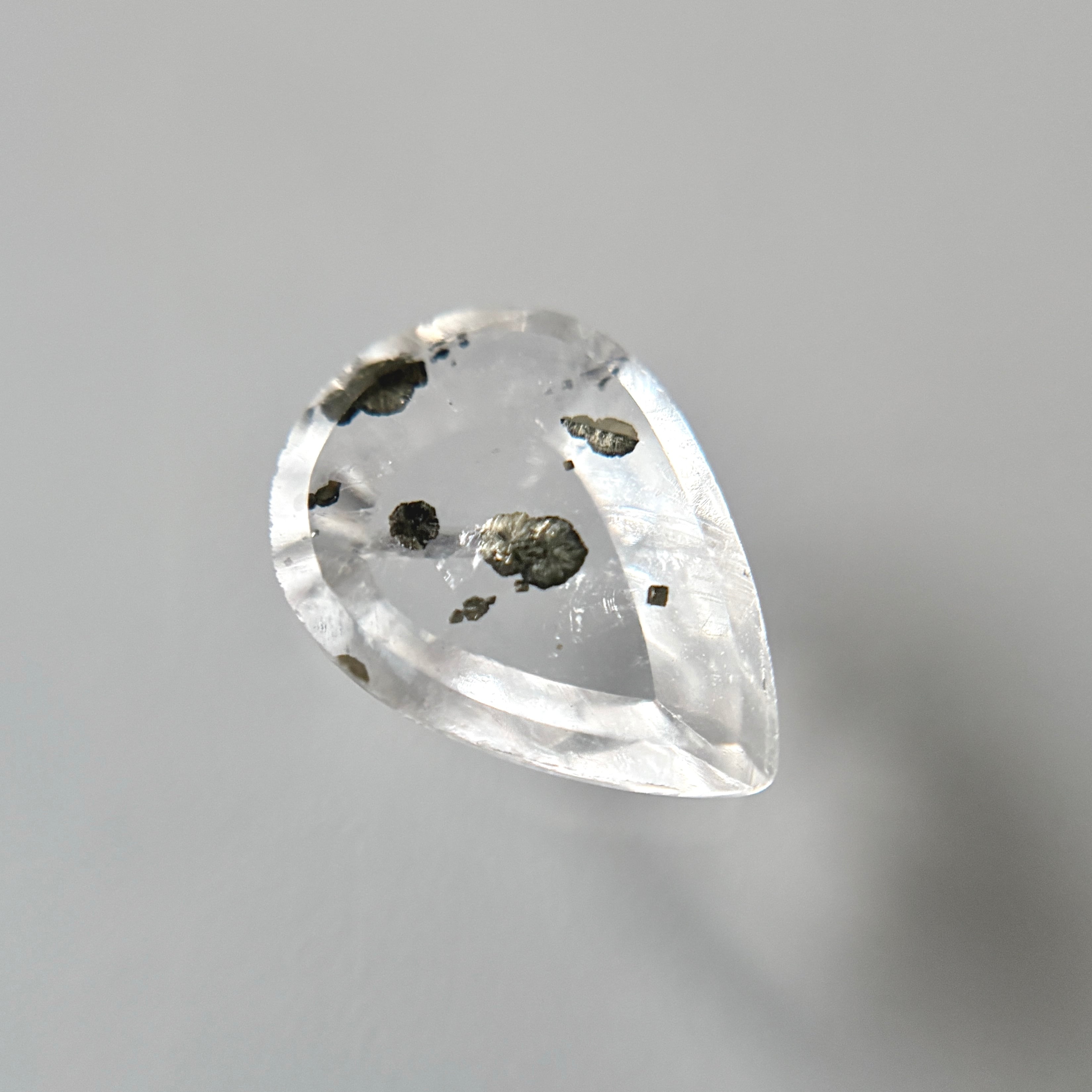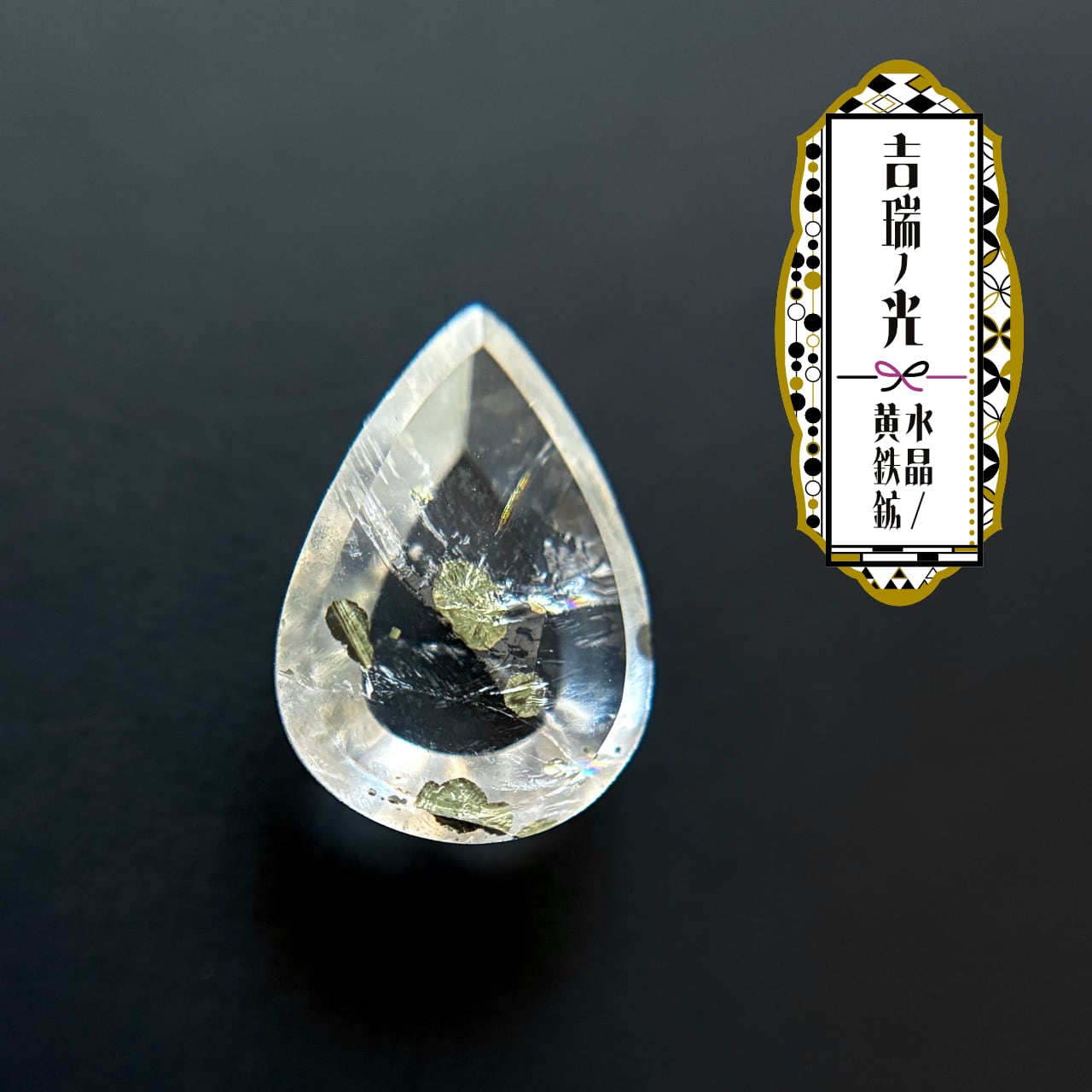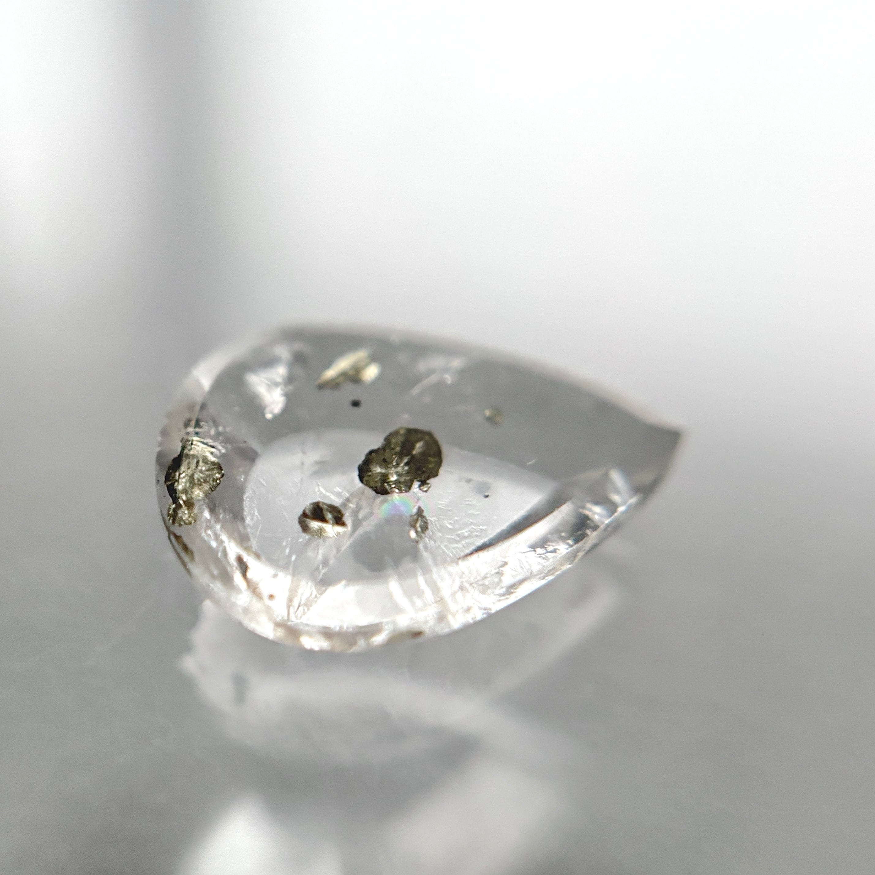 羽根のようなインクルージョンに虹が差し込むパイライトインクォーツです。