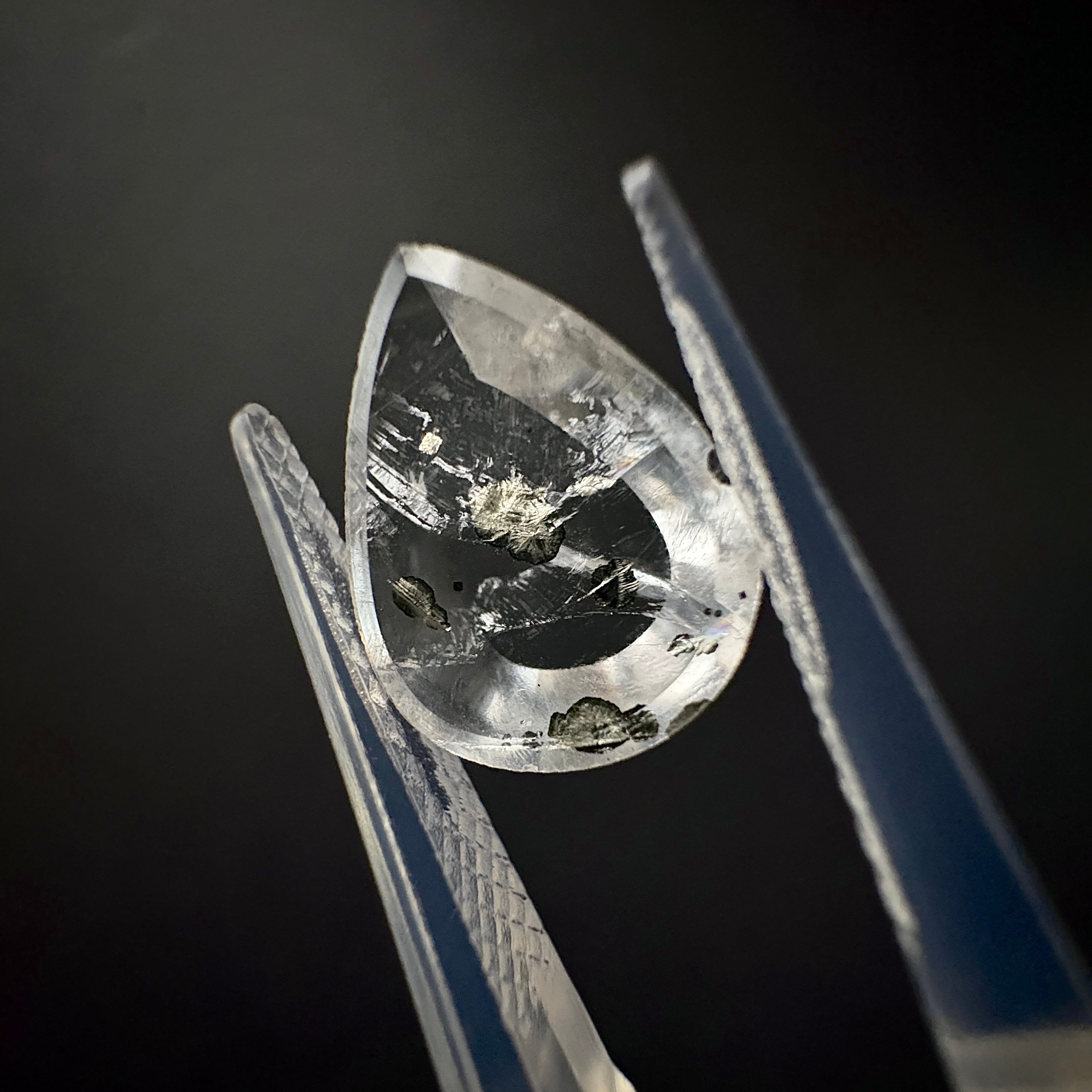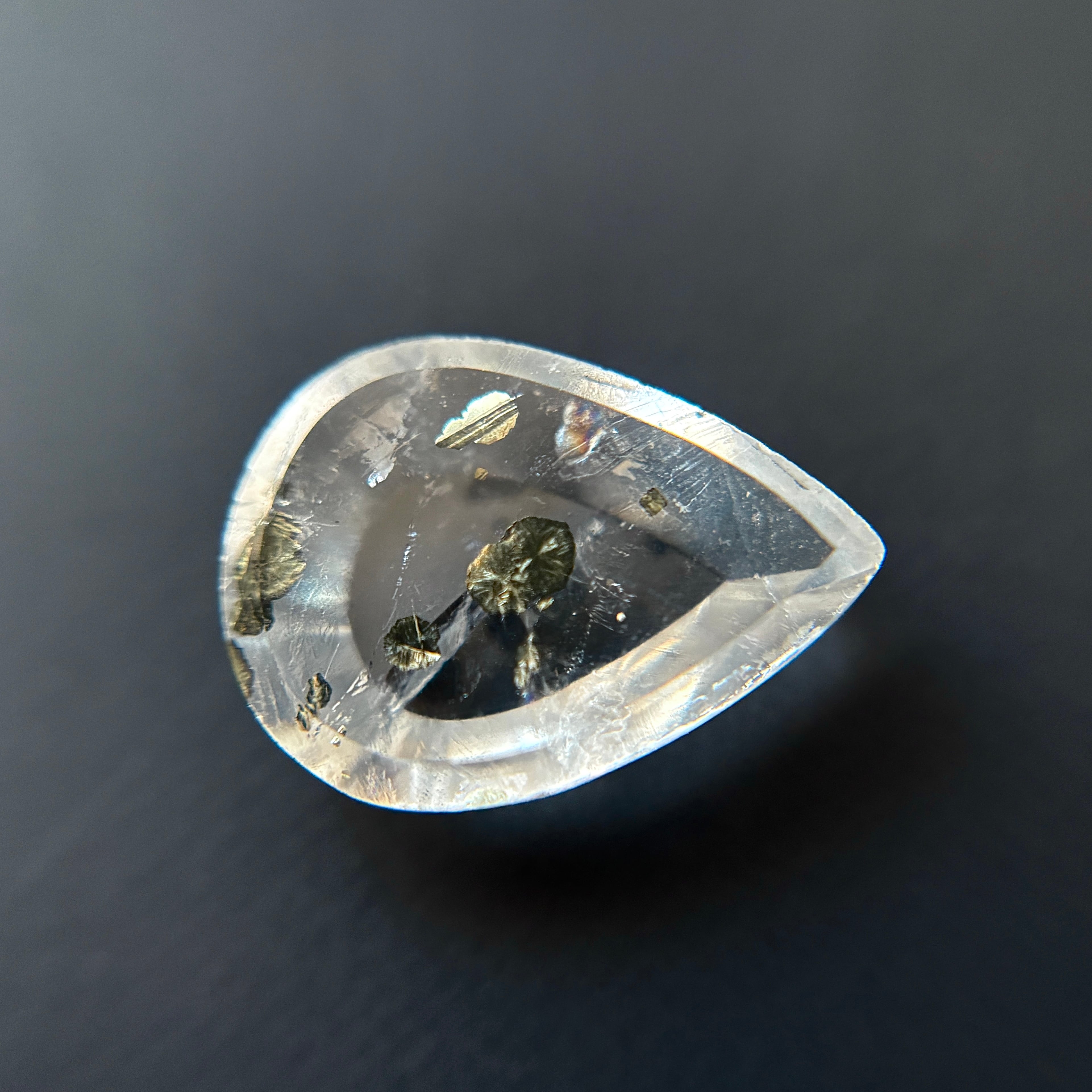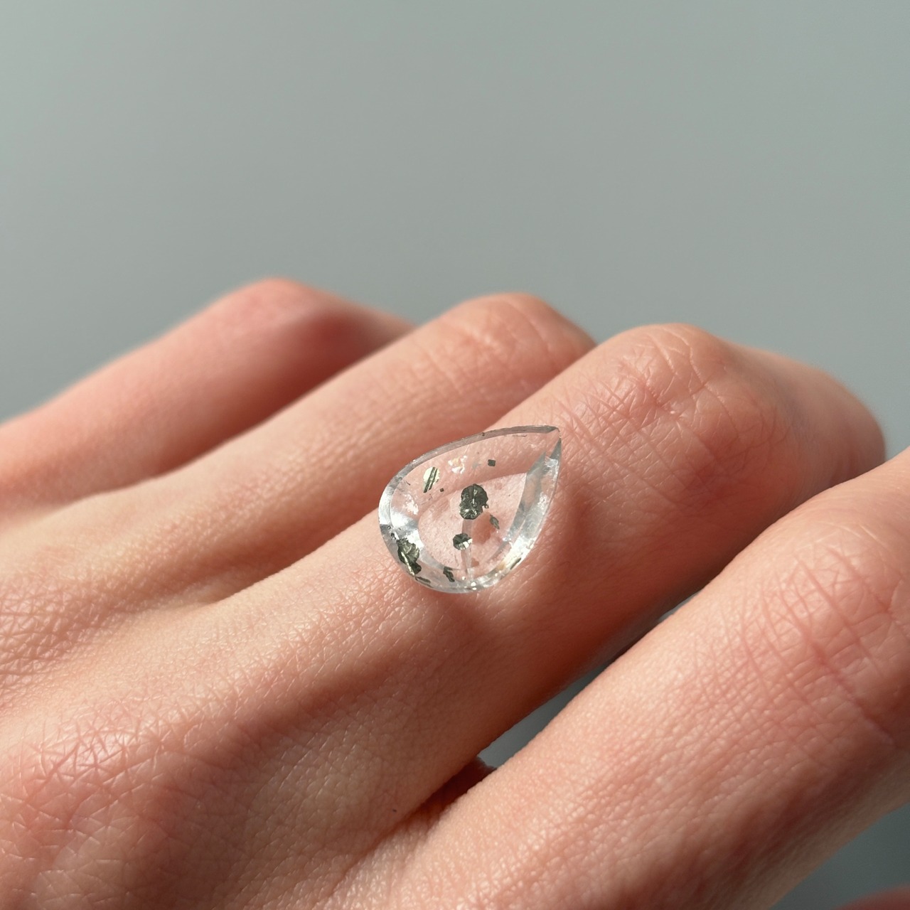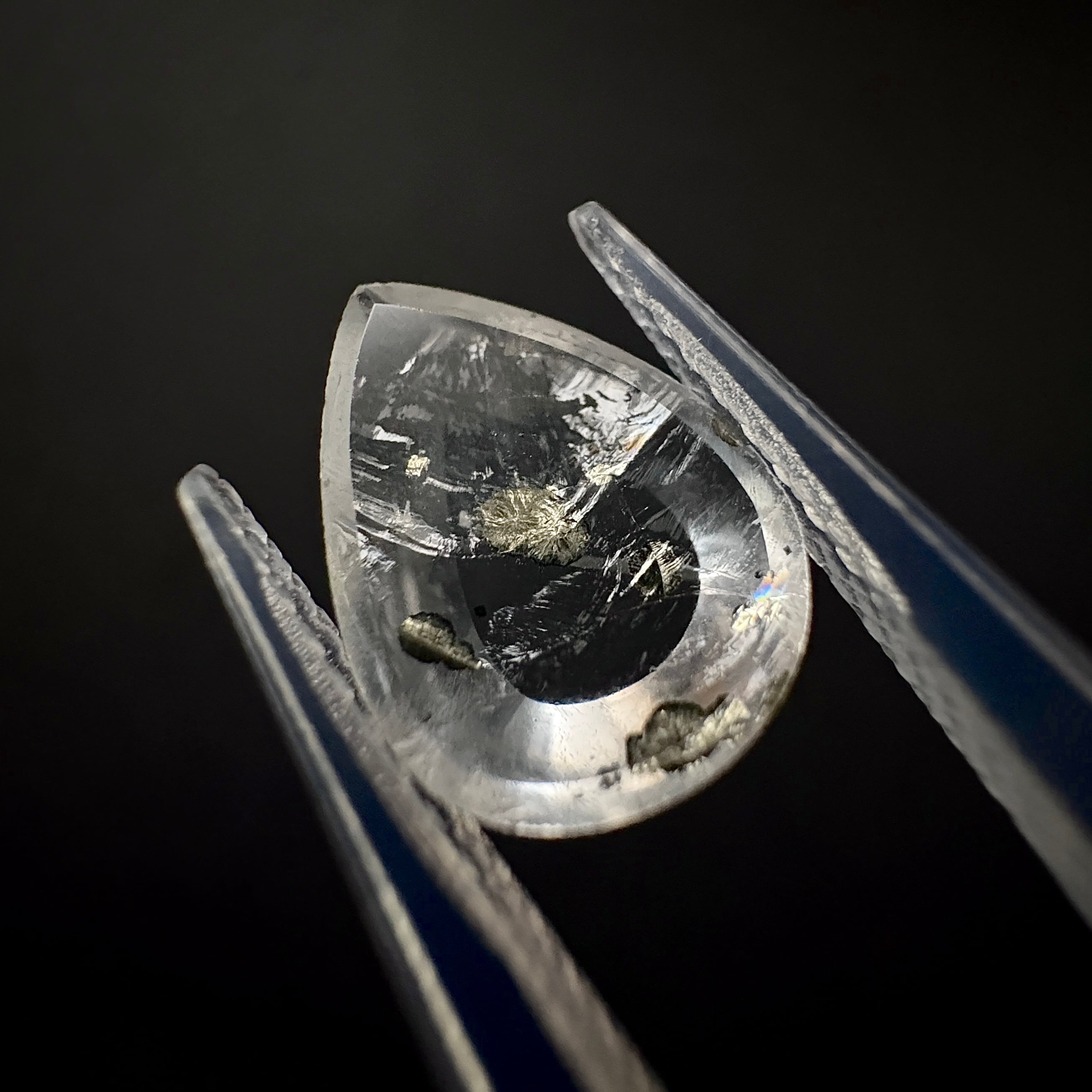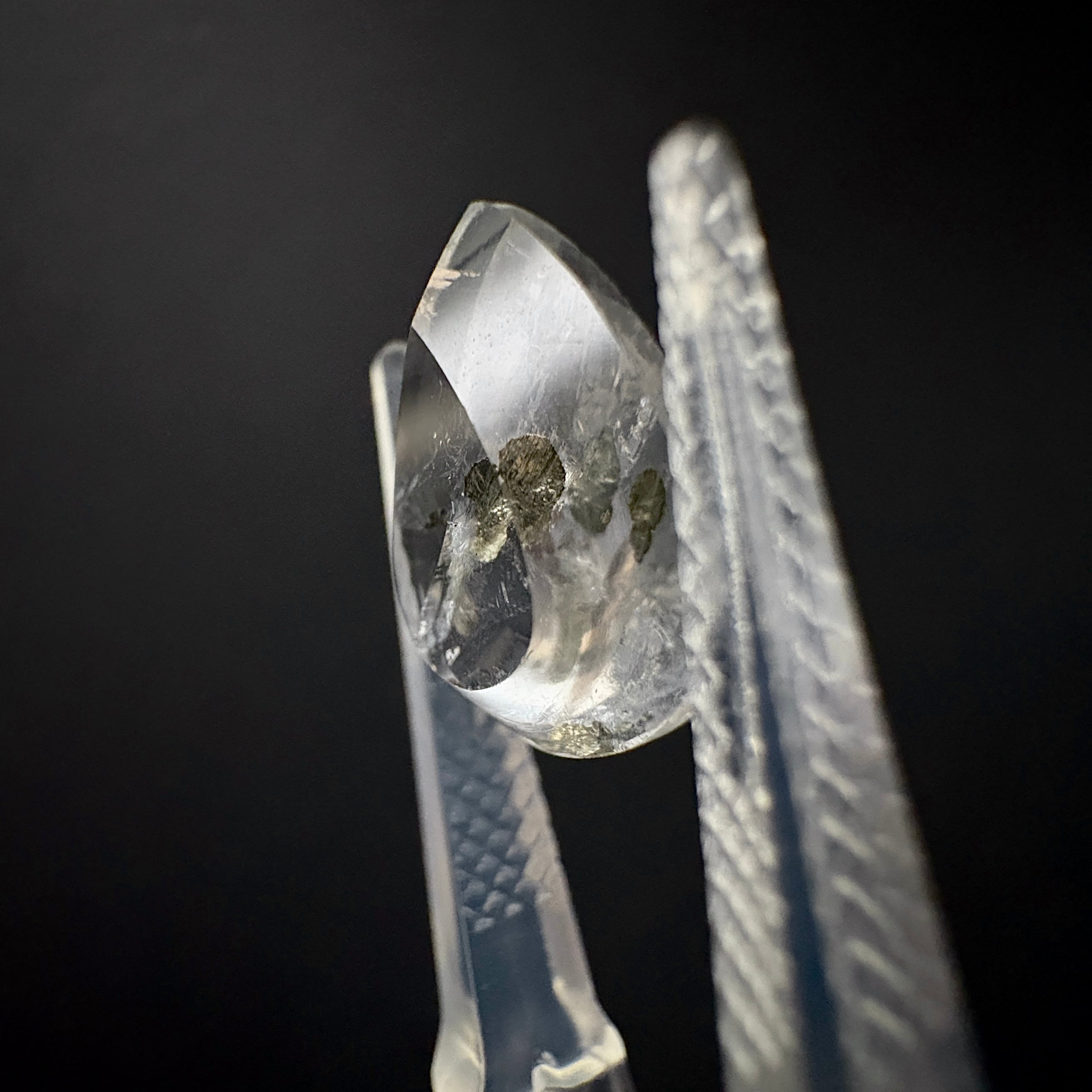 羽根のようなインクルージョンに虹が差し込むパイライトインクォーツです。
