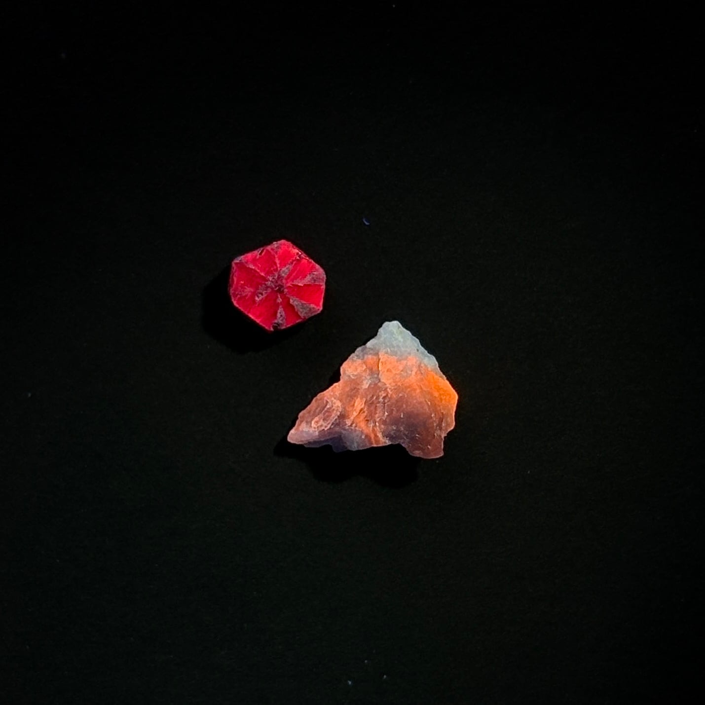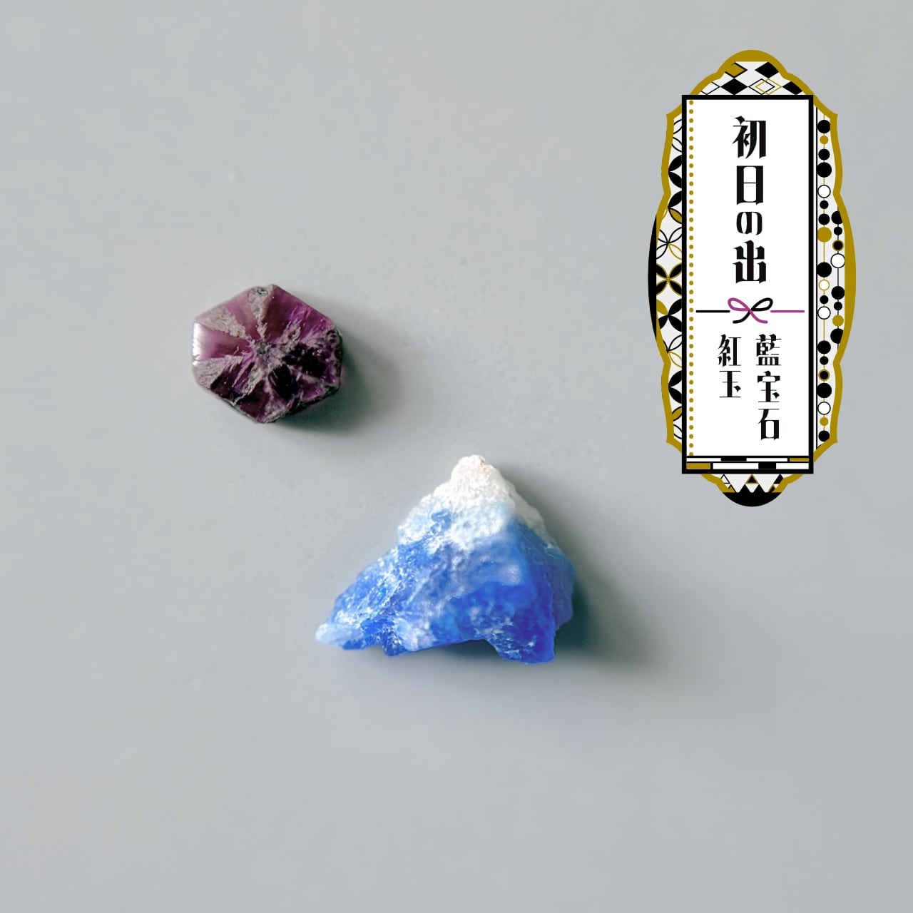 富士山に似た状態のアウイナイトの原石と、あかあかと輝く太陽のようなトラピッチェルビーを合わせて初日の出セットにしました。蛍光させた時の趣も良いです。