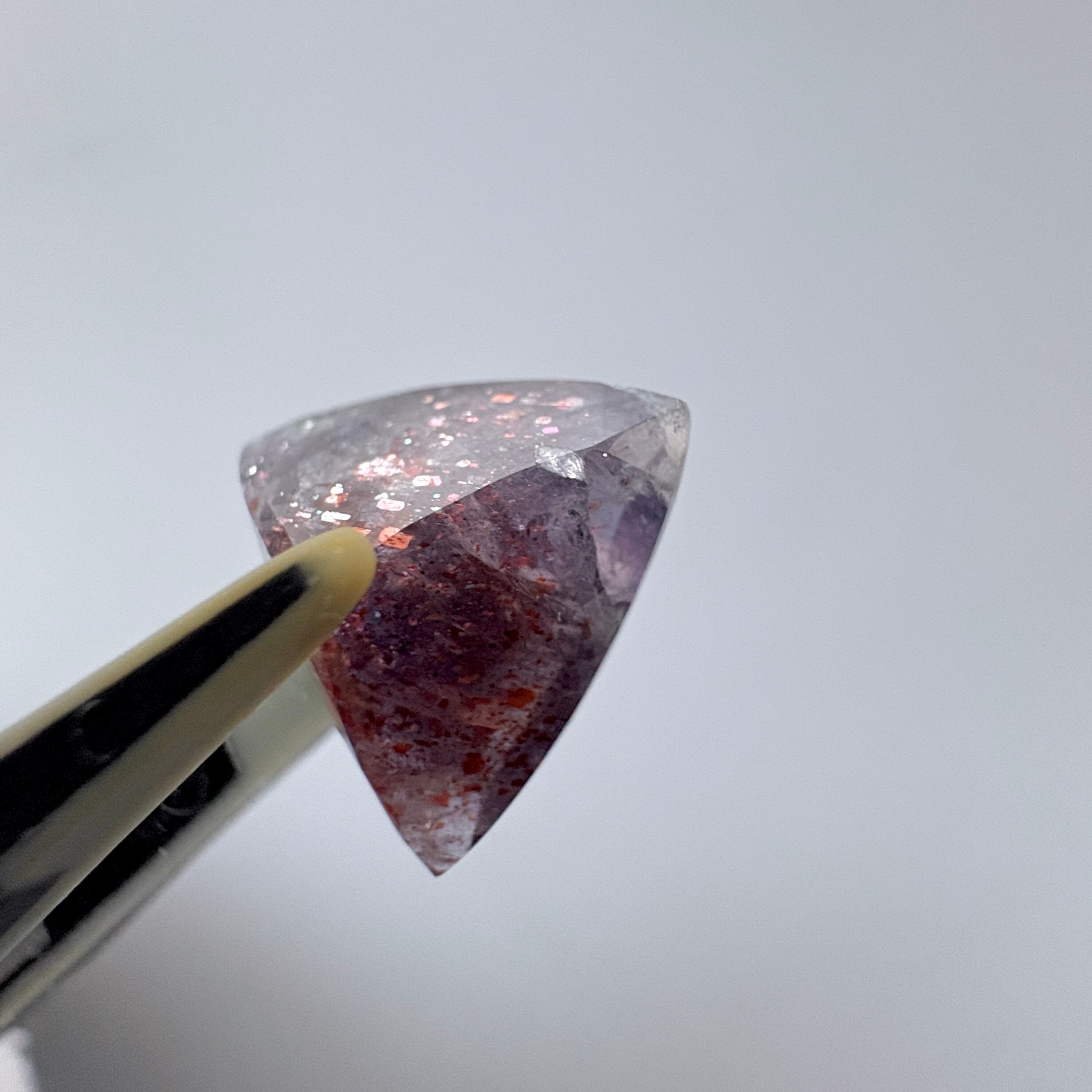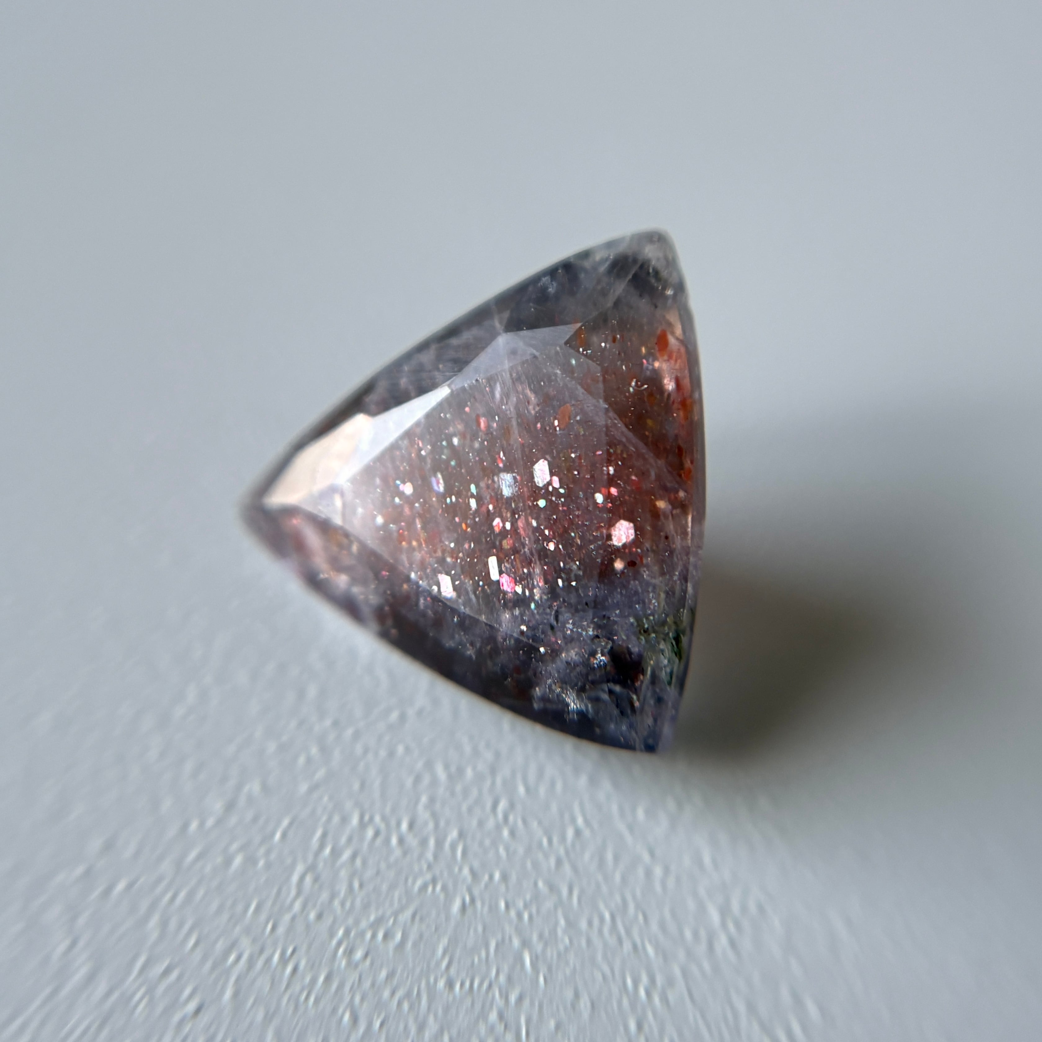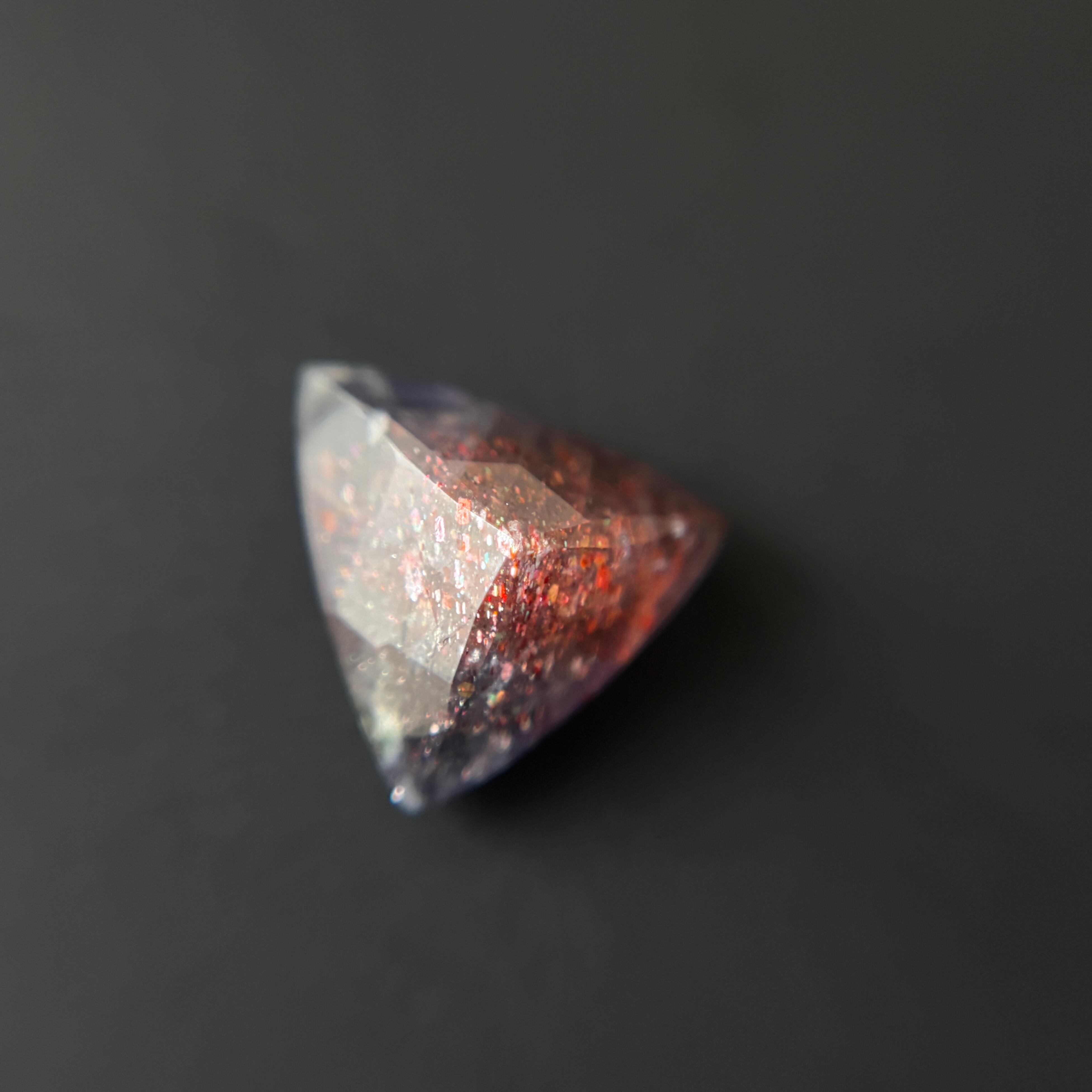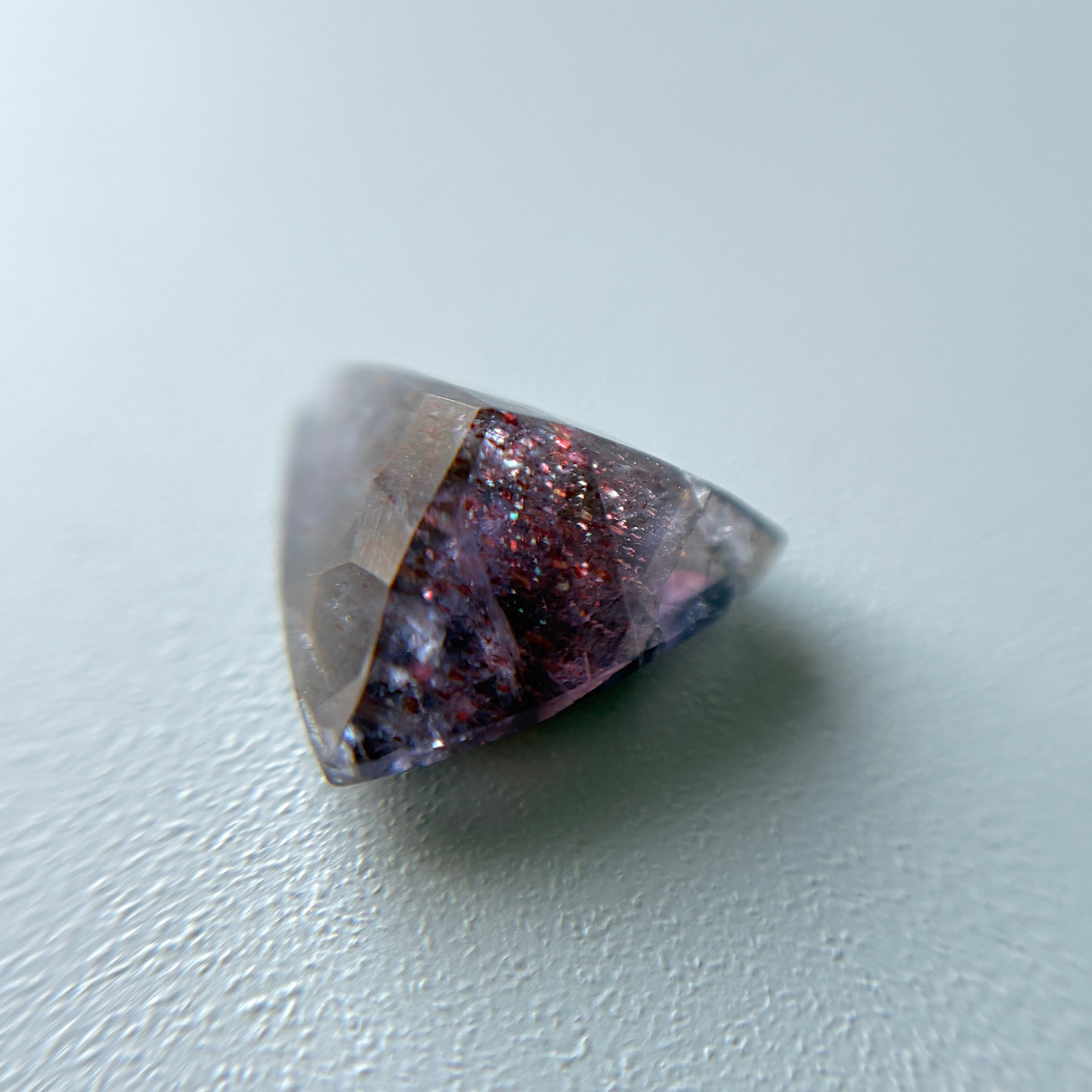 虹色のアベンチュレッセンスと赤い内包物のあるアイオライトです。