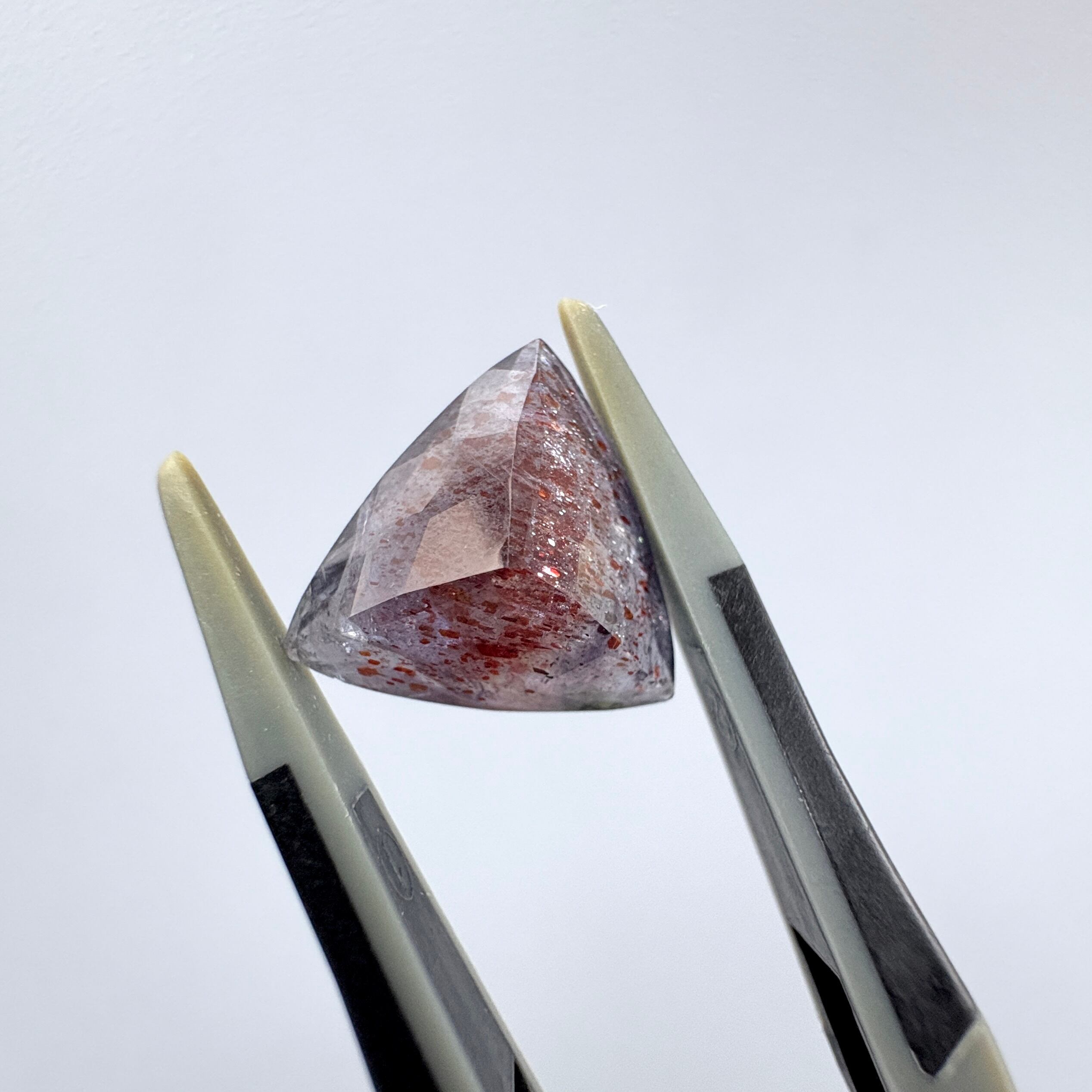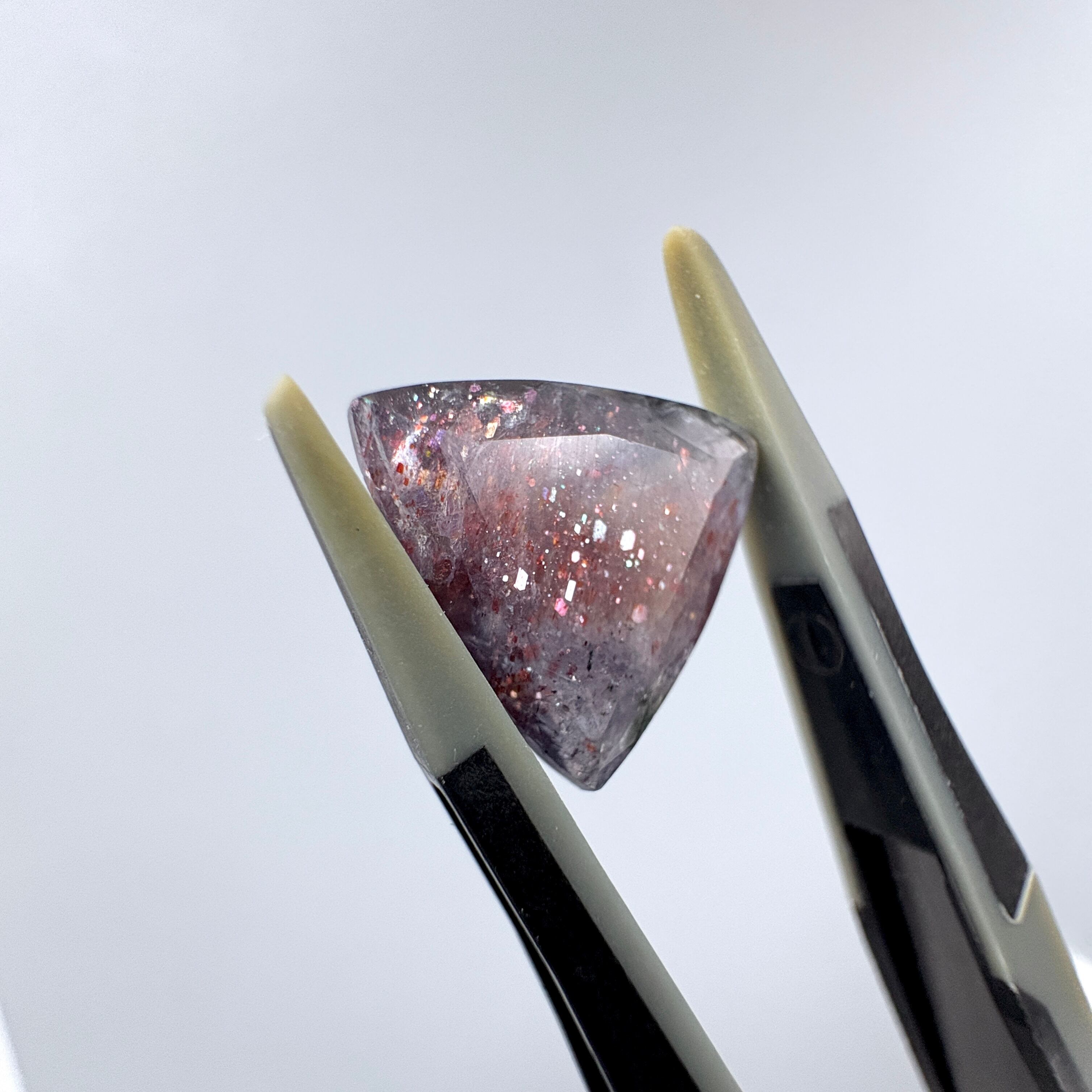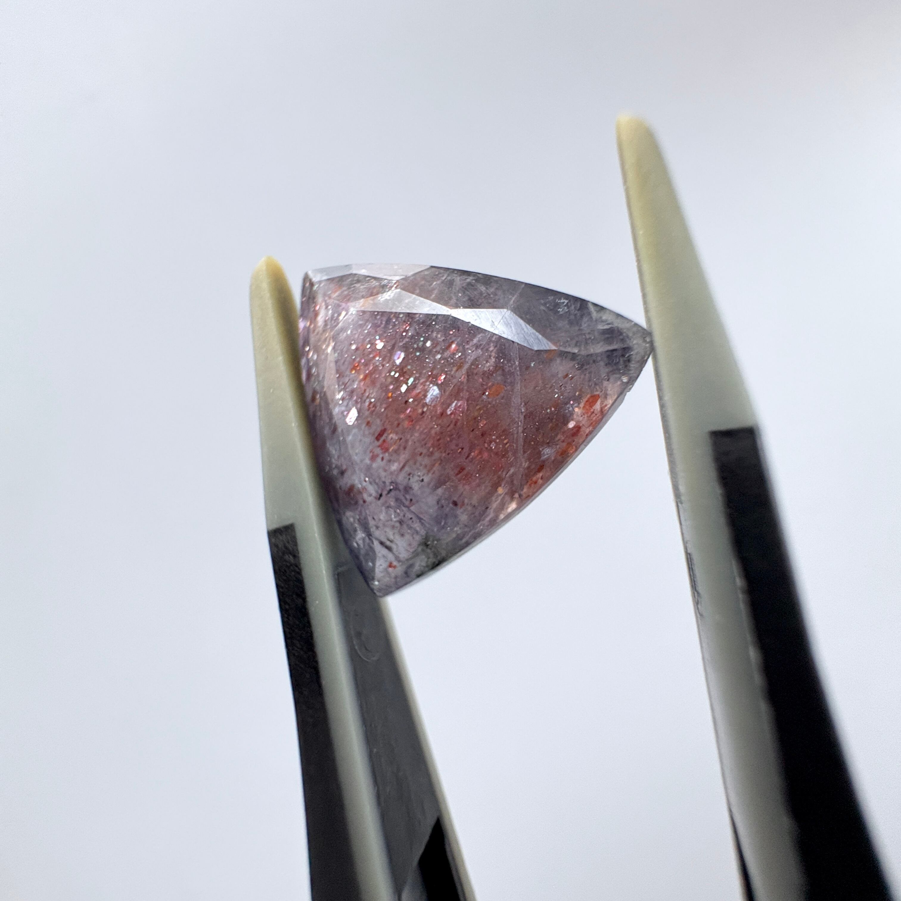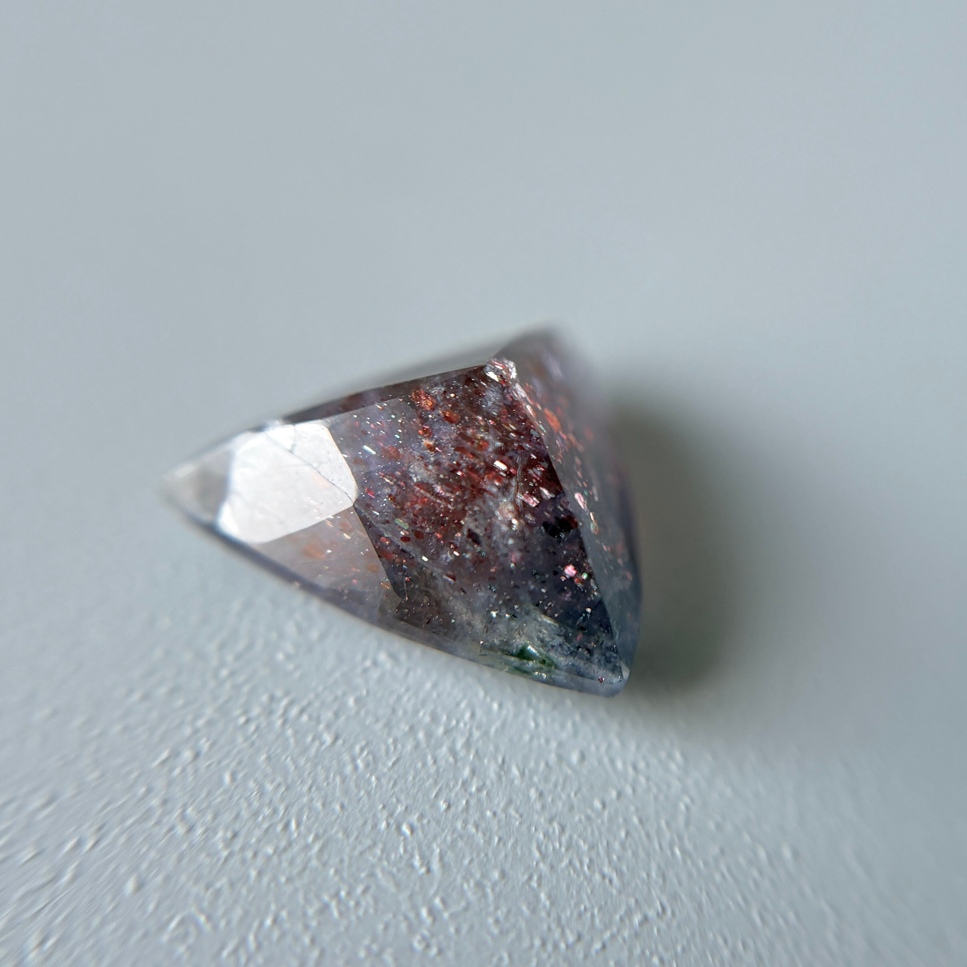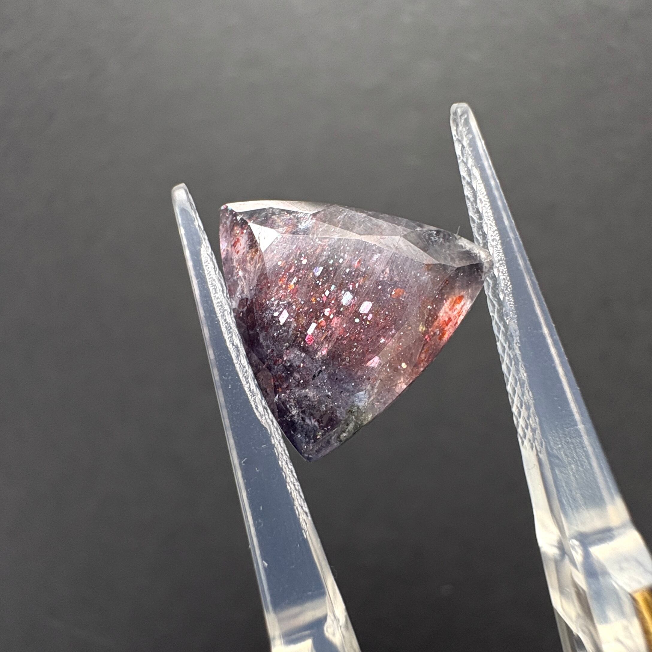 虹色のアベンチュレッセンスと赤い内包物のあるアイオライトです。