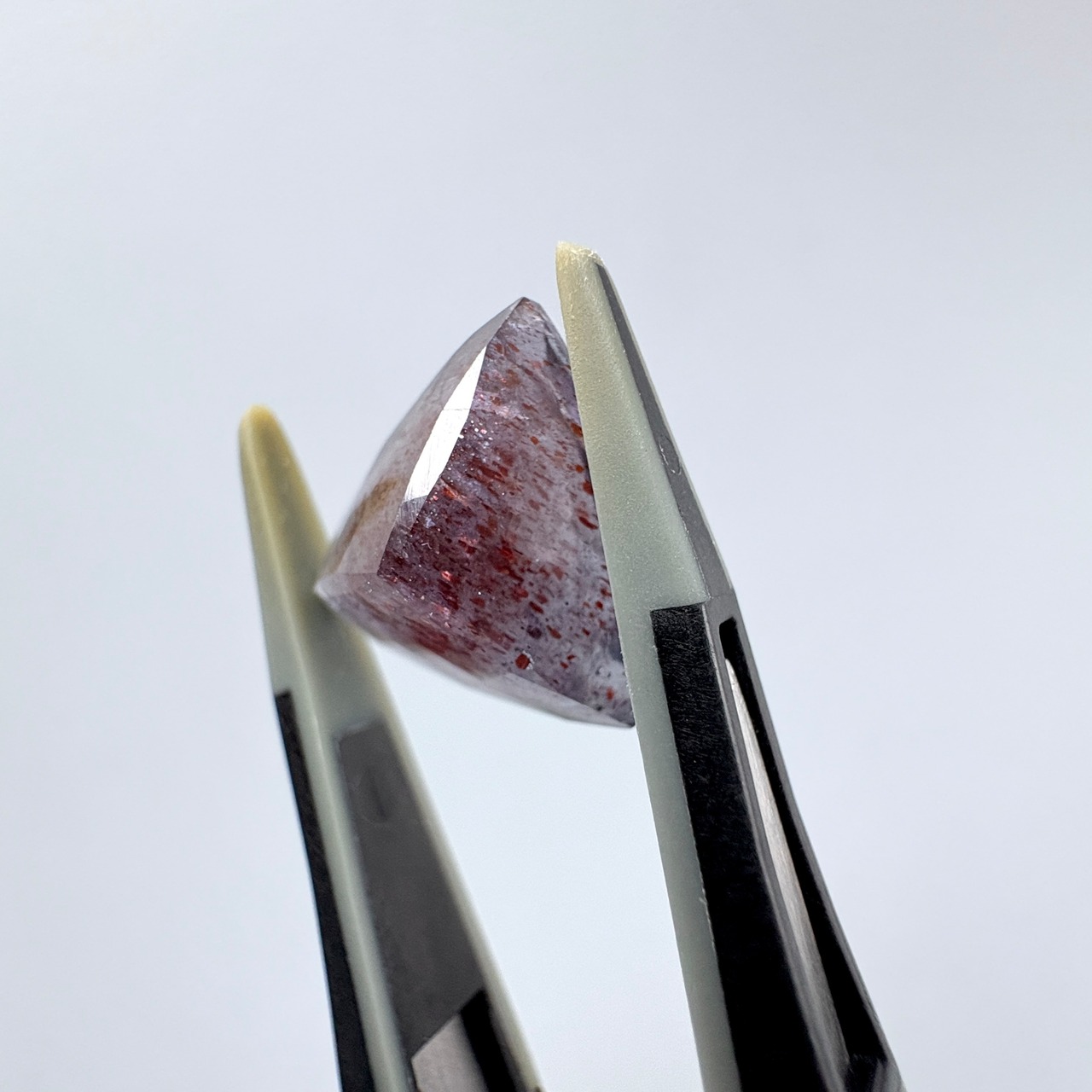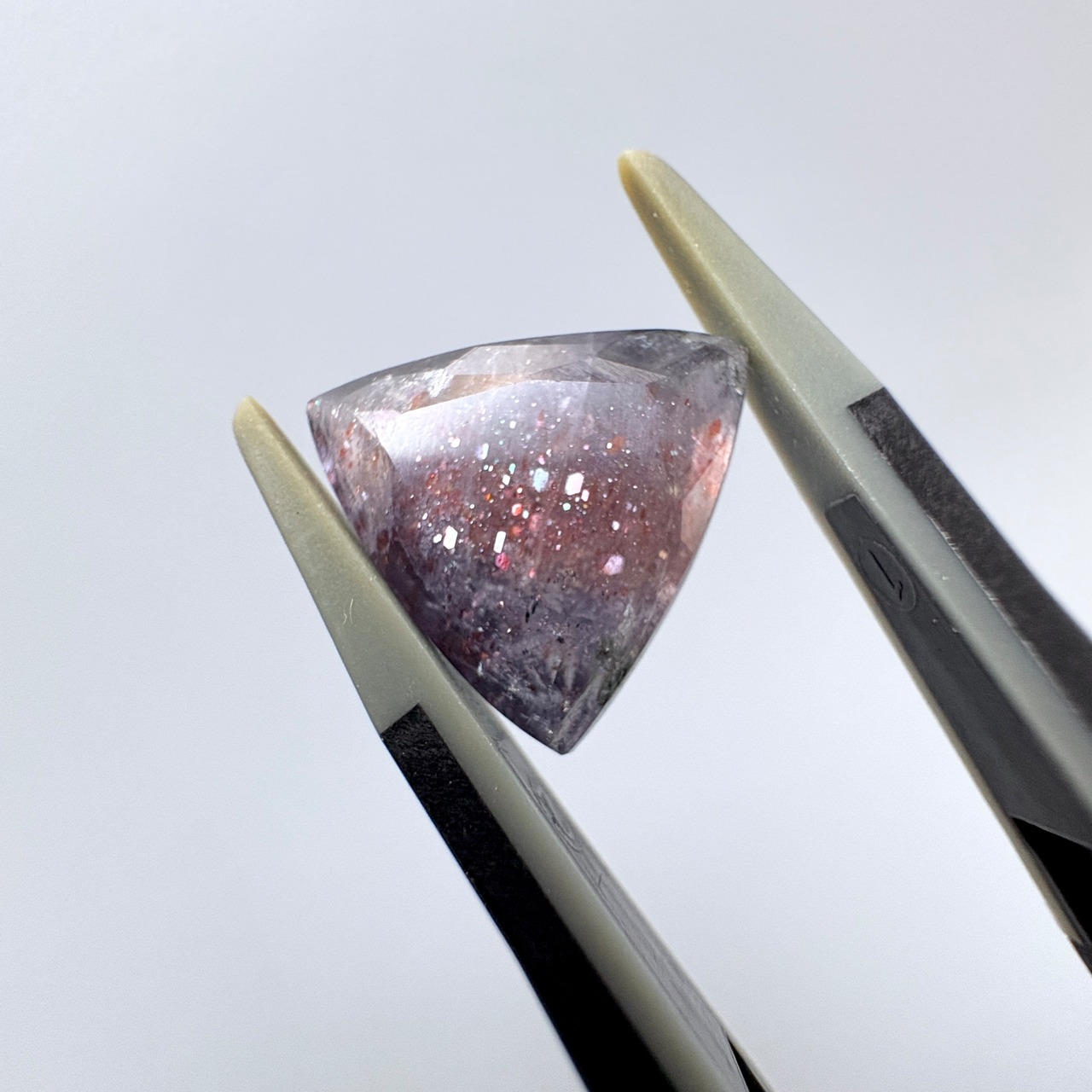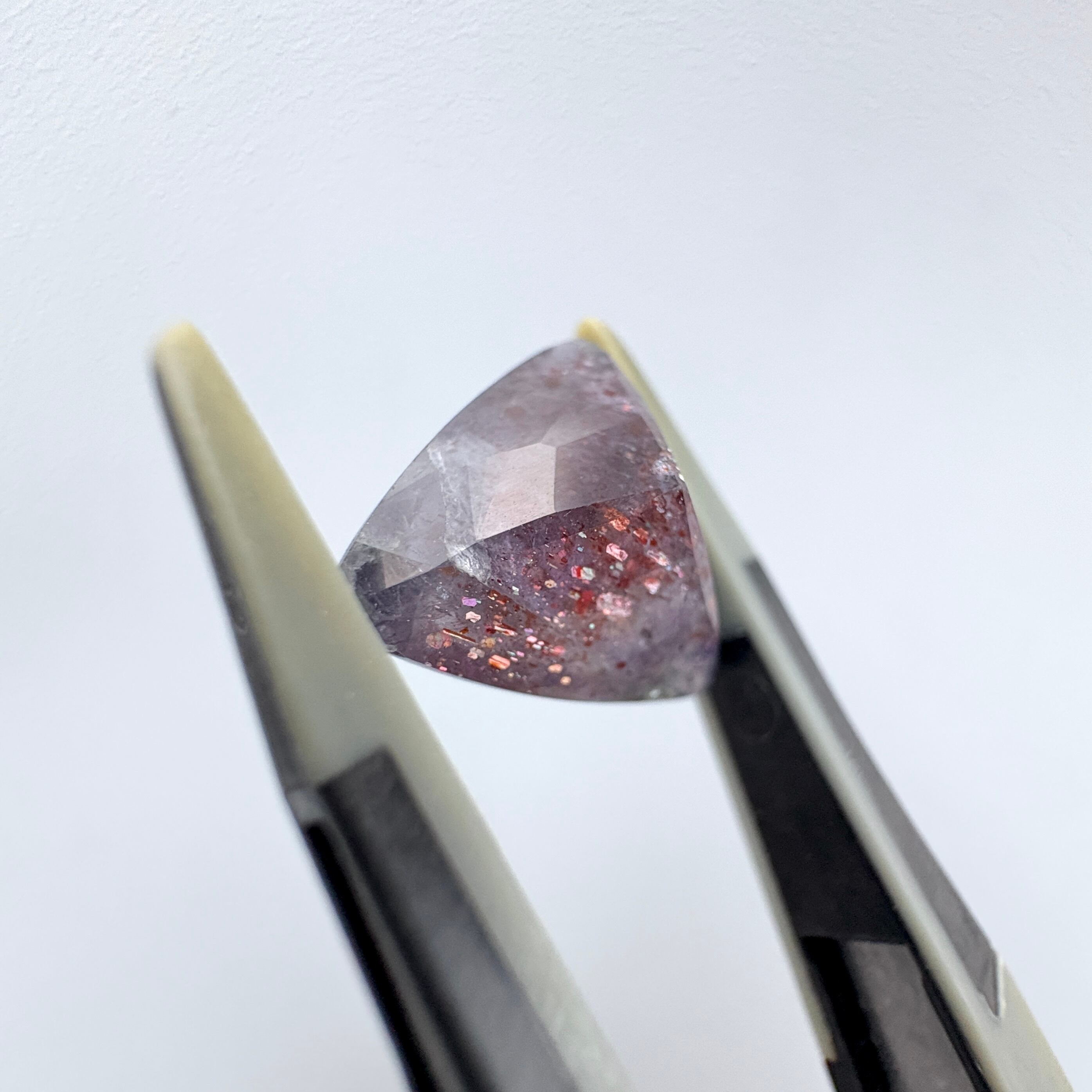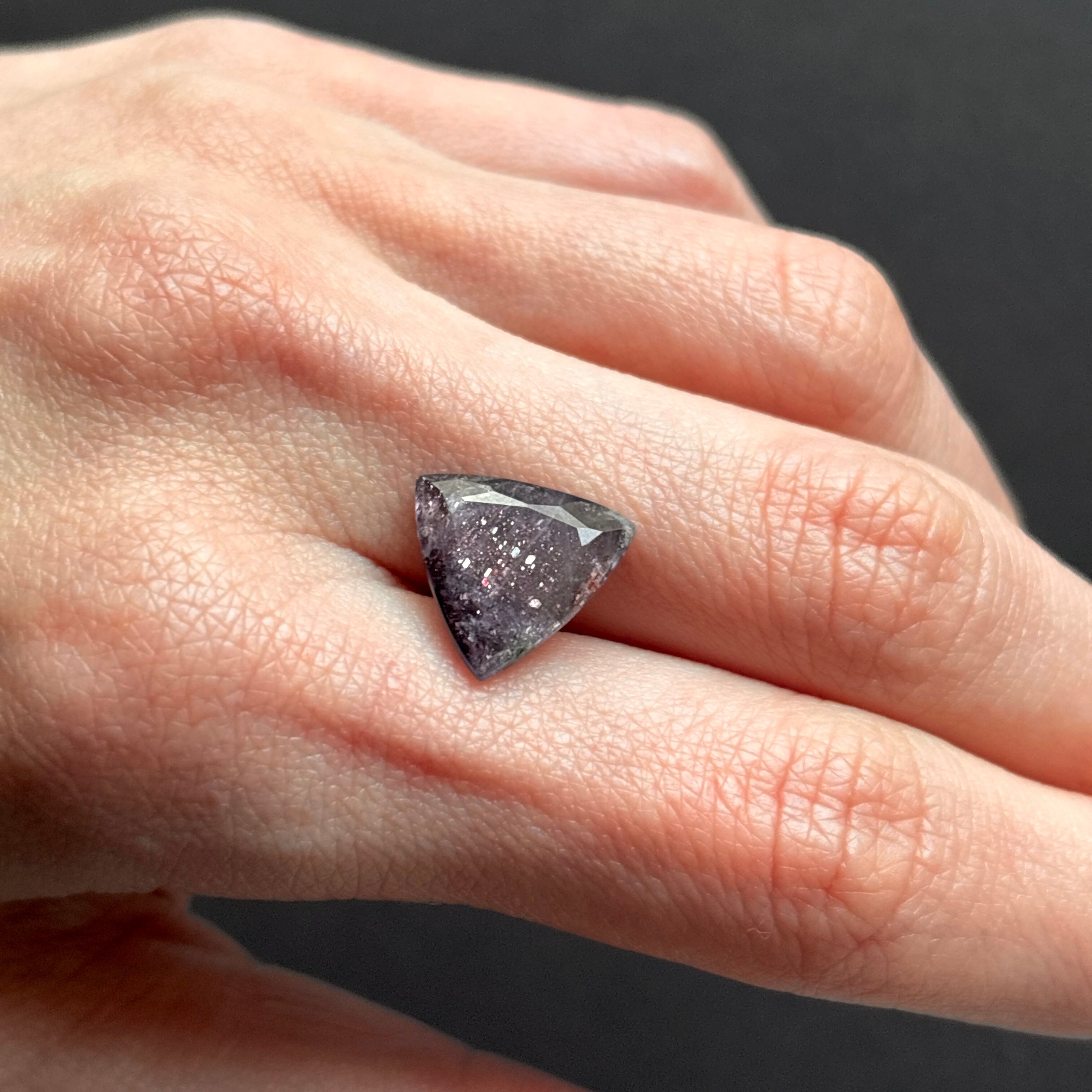 透明感のある淡いすみれ色で、5ct以上ある生地の中に煌めく内包物がつまっているのが見てとれます。
