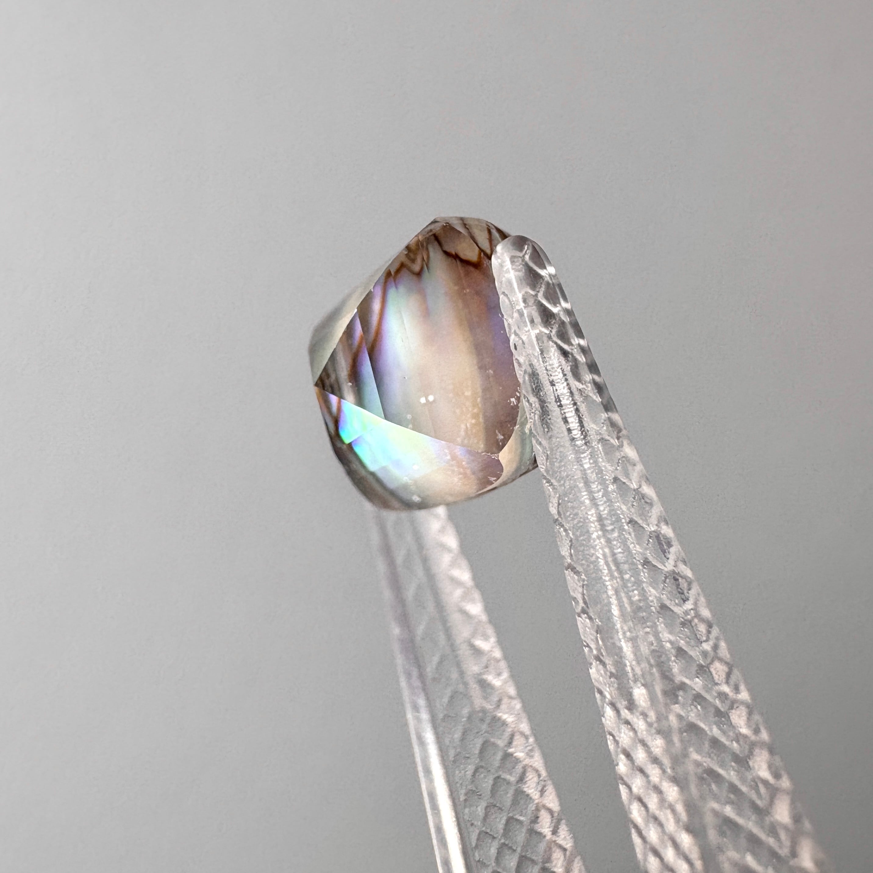 そのユニークな模様と多彩なイリデッセンスを水晶が吸いあげて輝きます。
