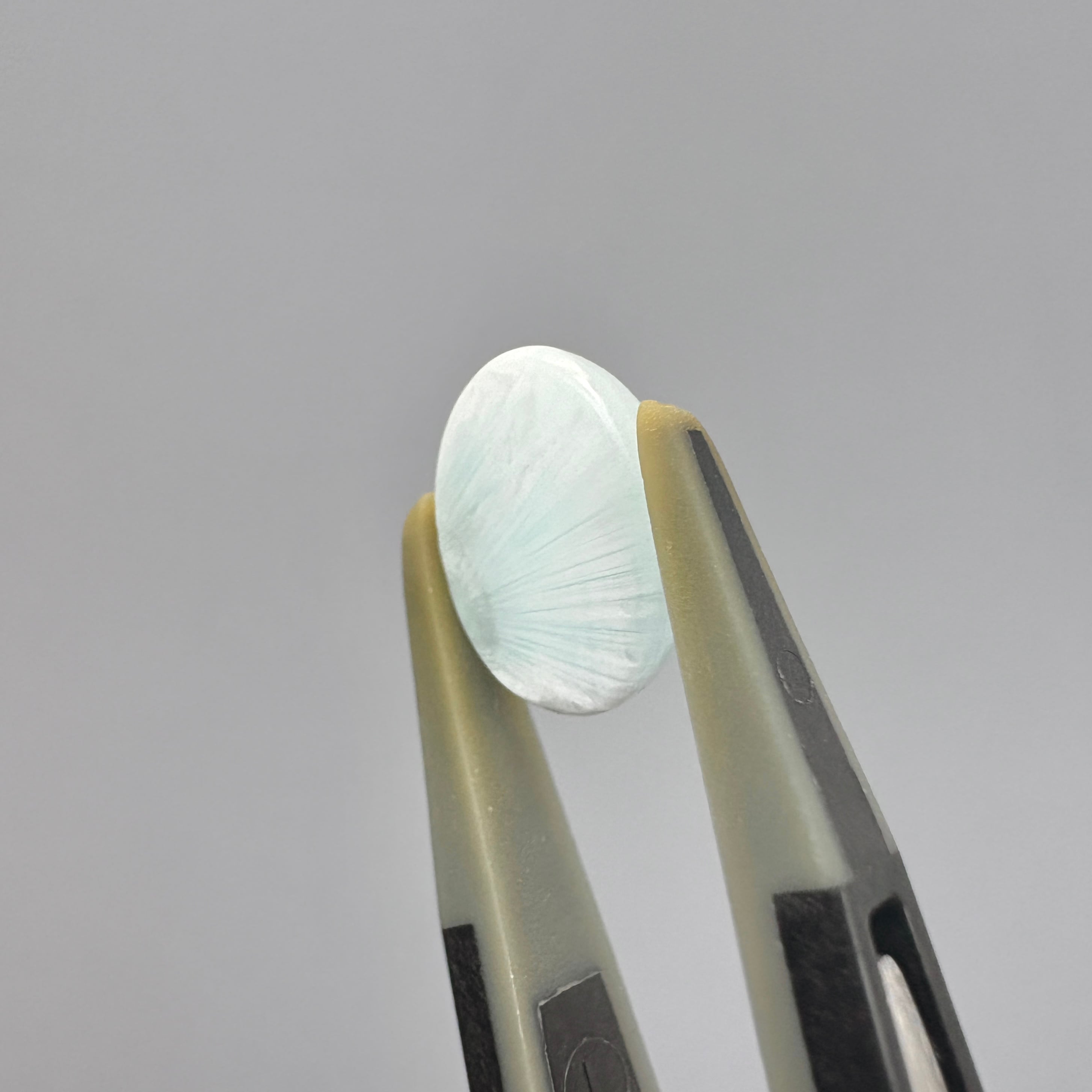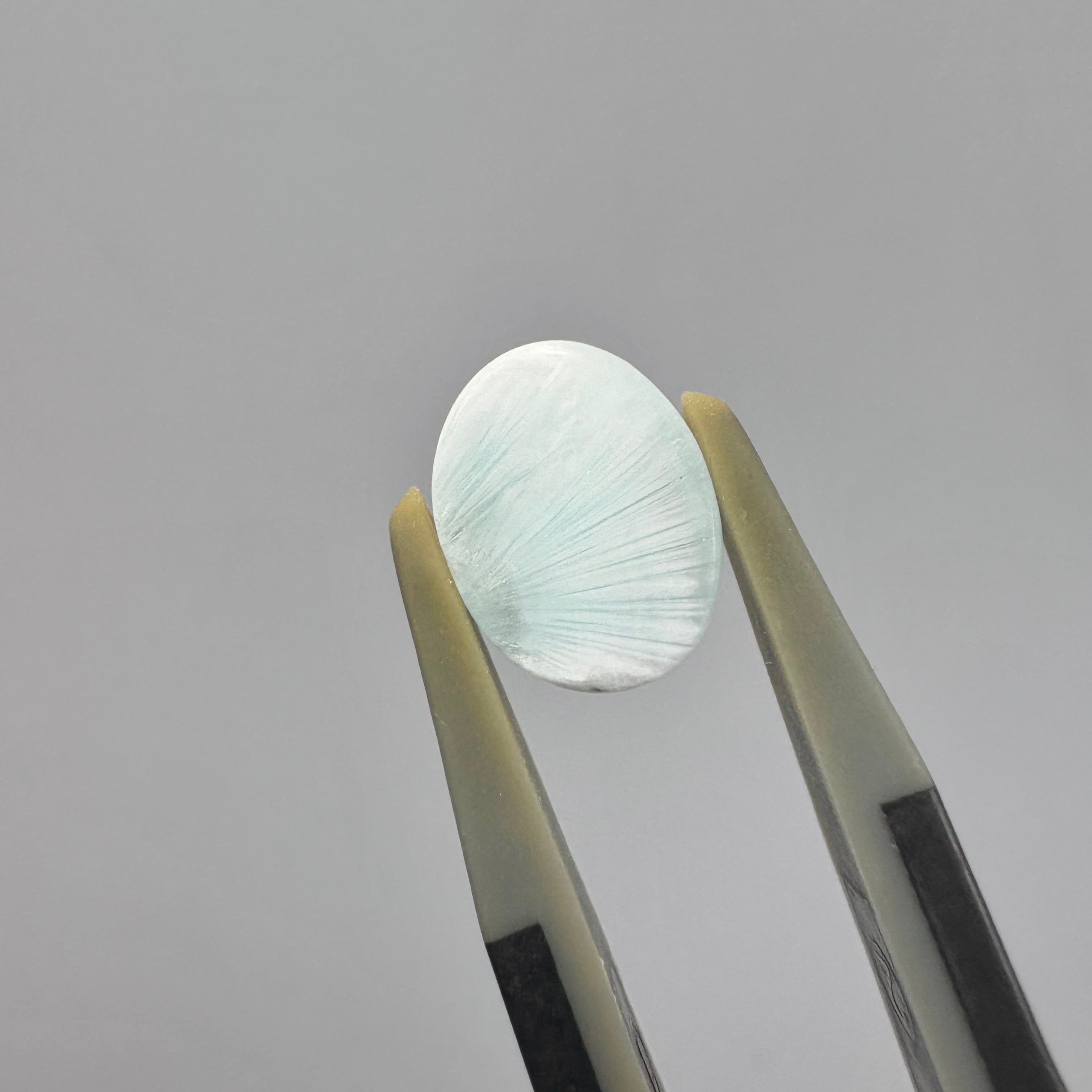 繊維状の結晶が全面に広がり、とくに裏面は整った扇状のラインが見られます。やや透け感もありますが全体的にミルキーで甘そうです。