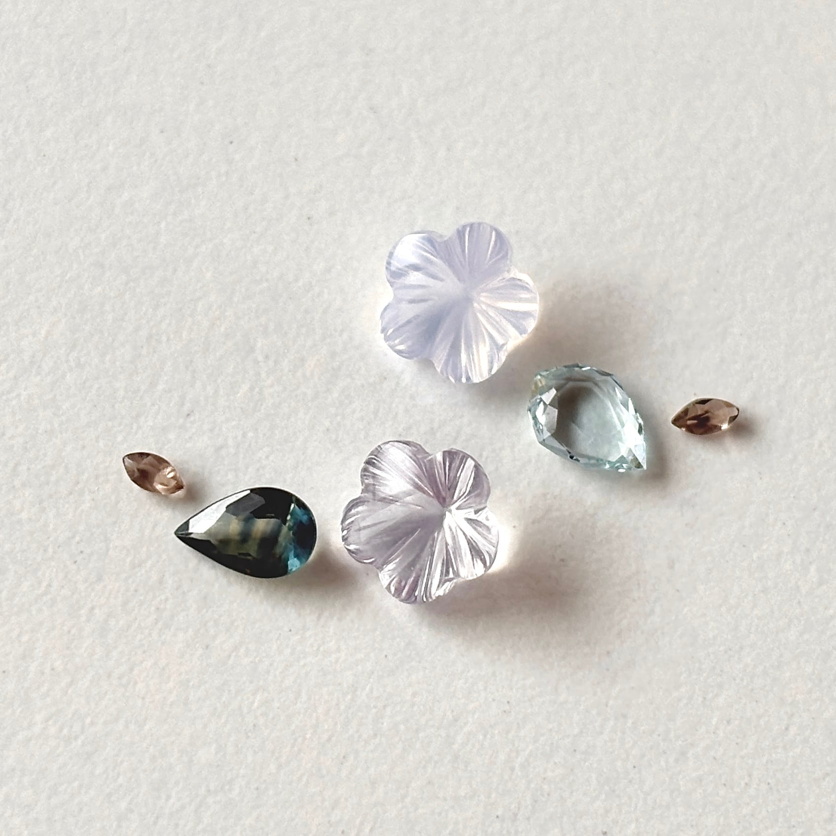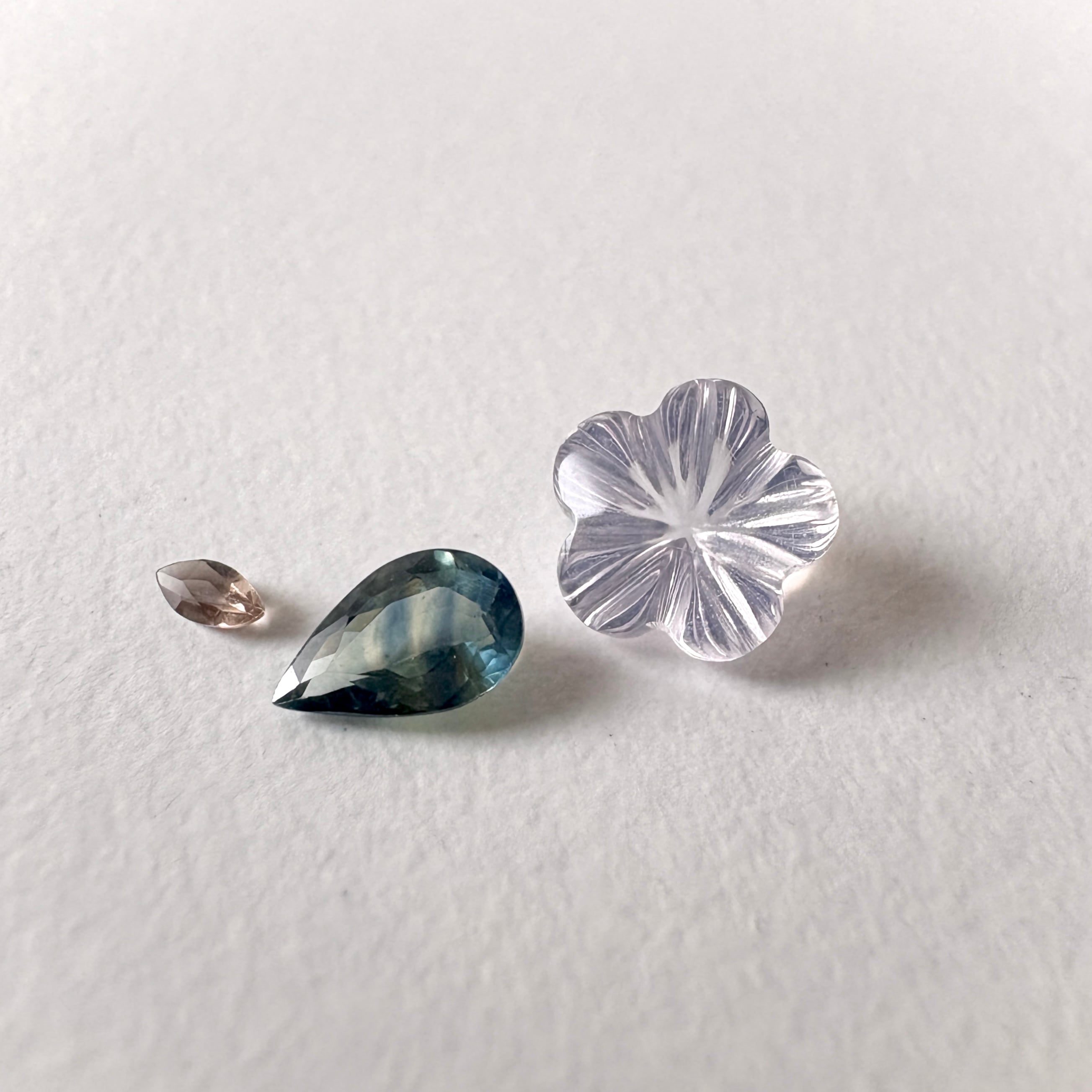 フラワーカービングのラベンダークォーツ (スコロライト) とペアシェイプのサファイアを組み合わせてお花見セットにしました。スモーキークォーツは枝です。