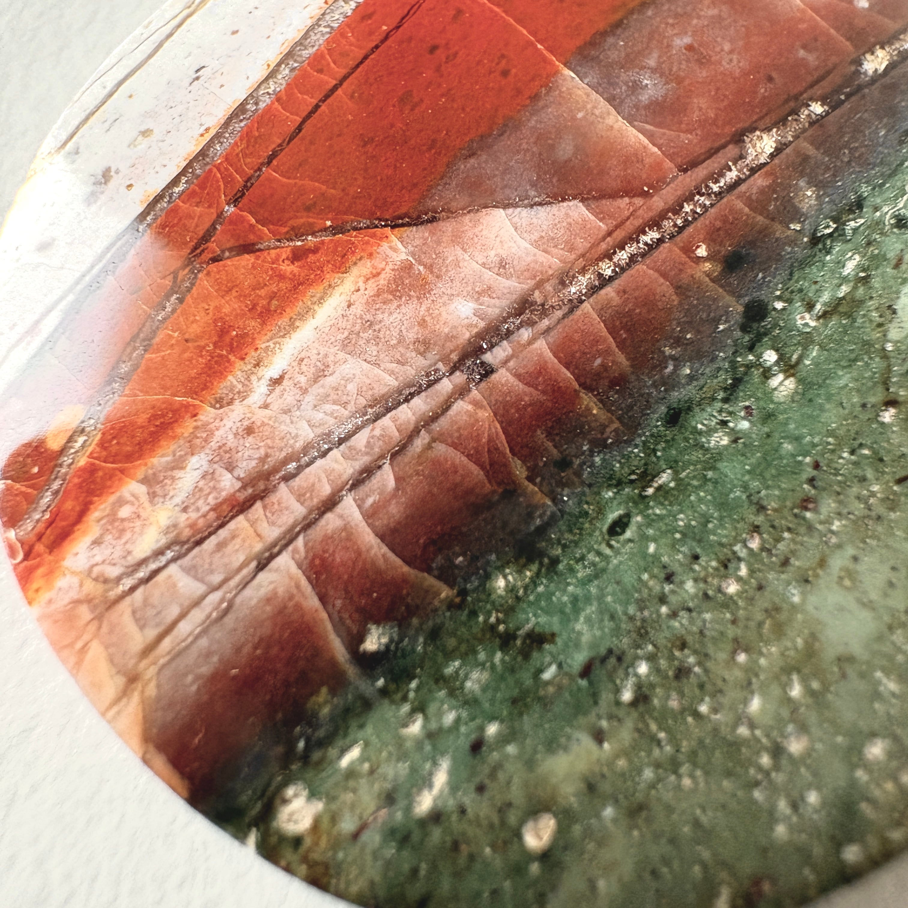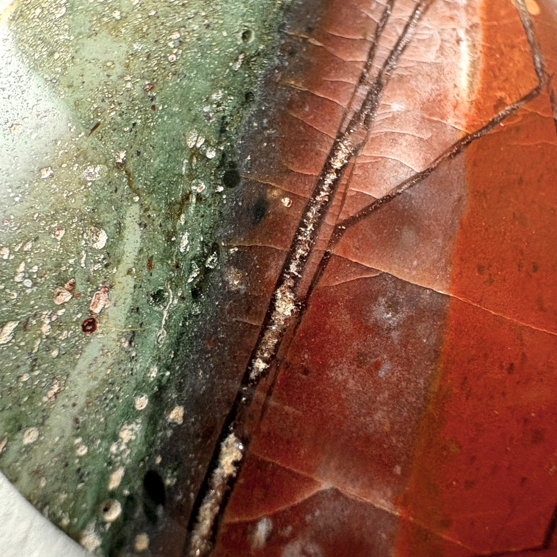 中央を横切るライン部分では結晶がきらきらし、陶器の貫入に似たヒビによって工芸品のように見えます。