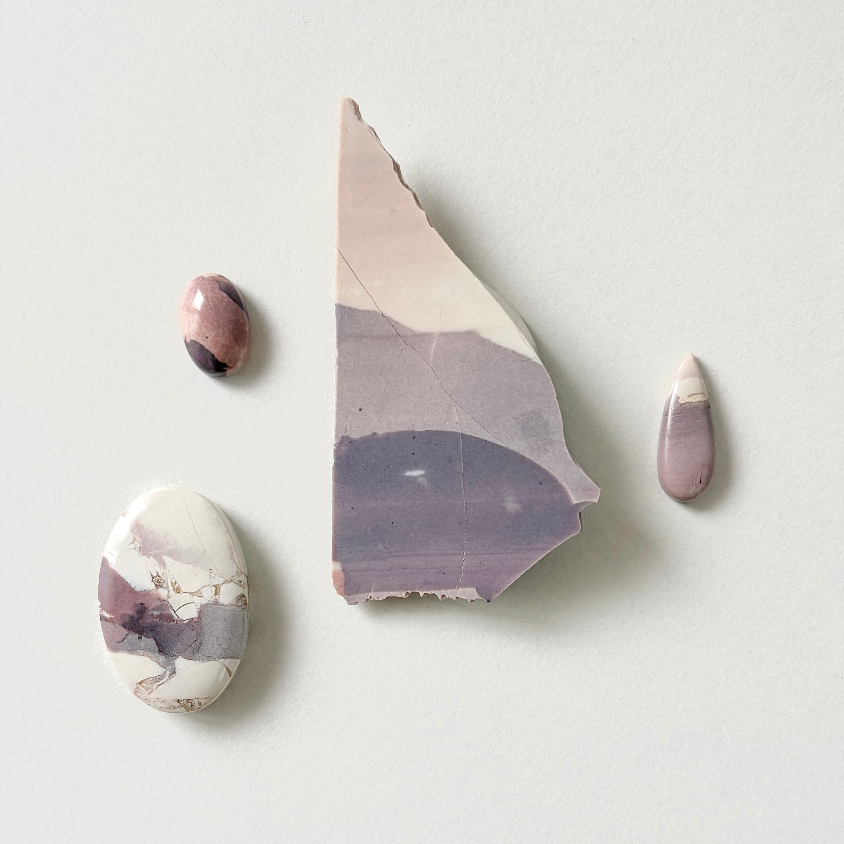 アメリカ・ユタ州でのみ産出される比較的新しいジャスパーです。彩度を抑えたパープルやピンク、白が基調で、無機質さと温かみが共存しています。