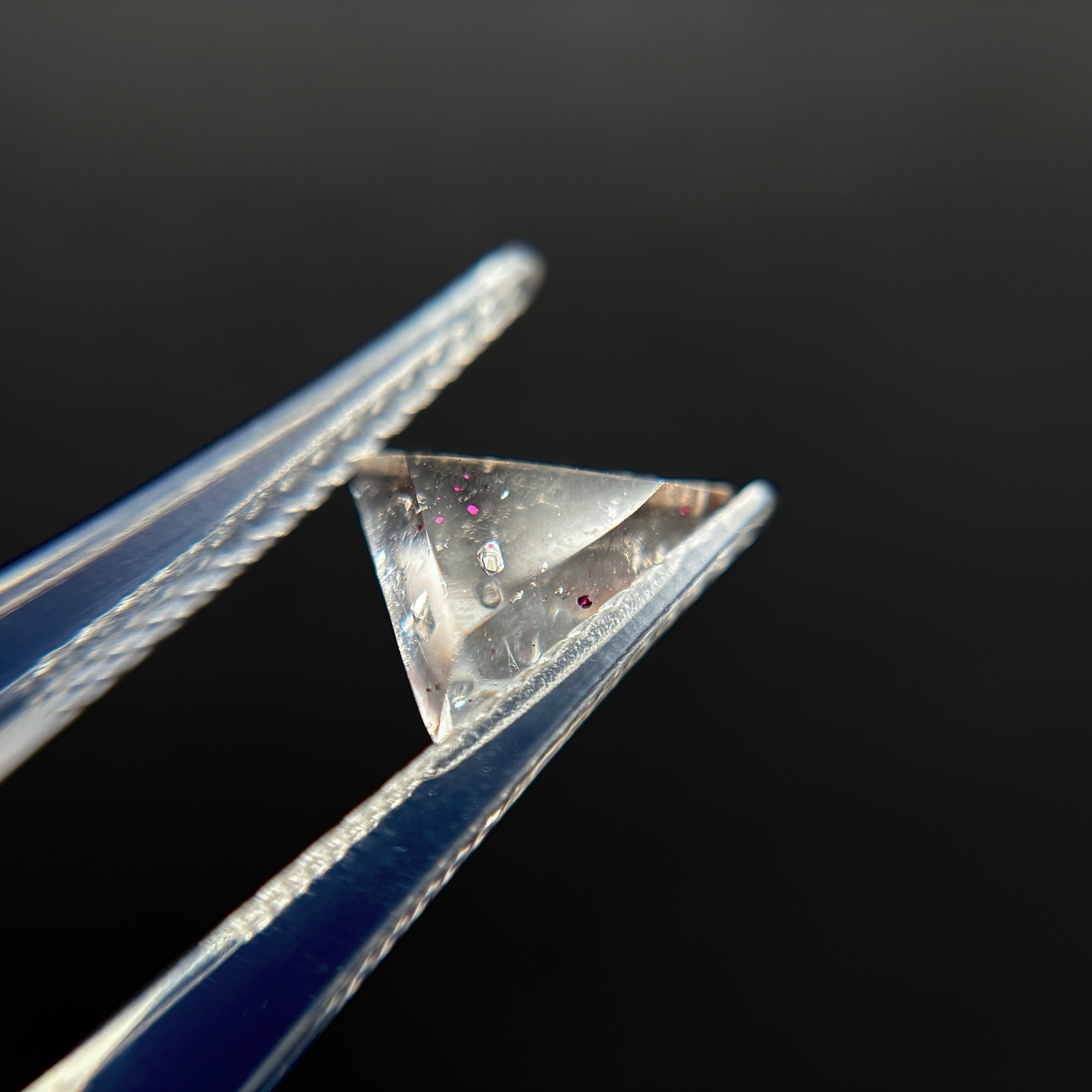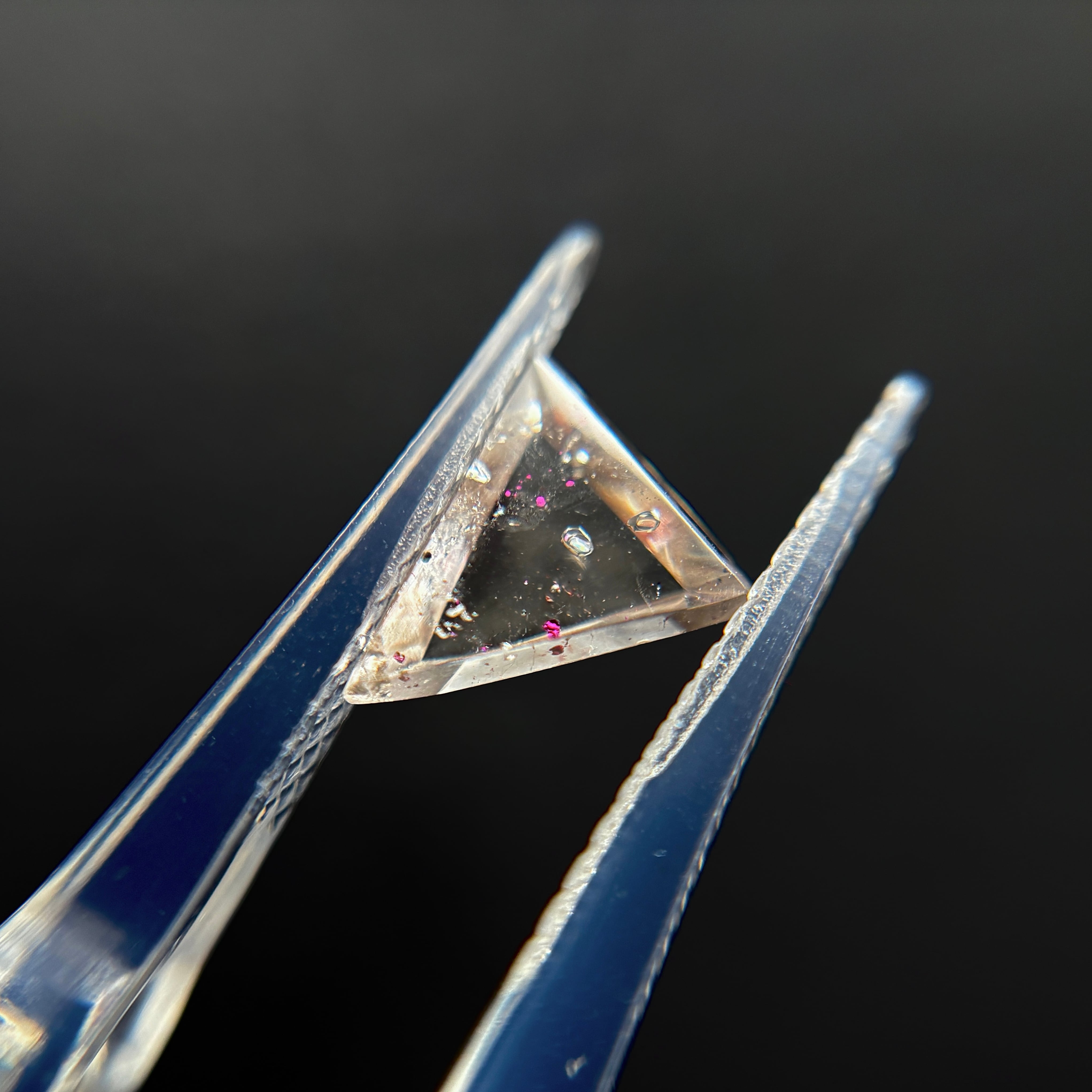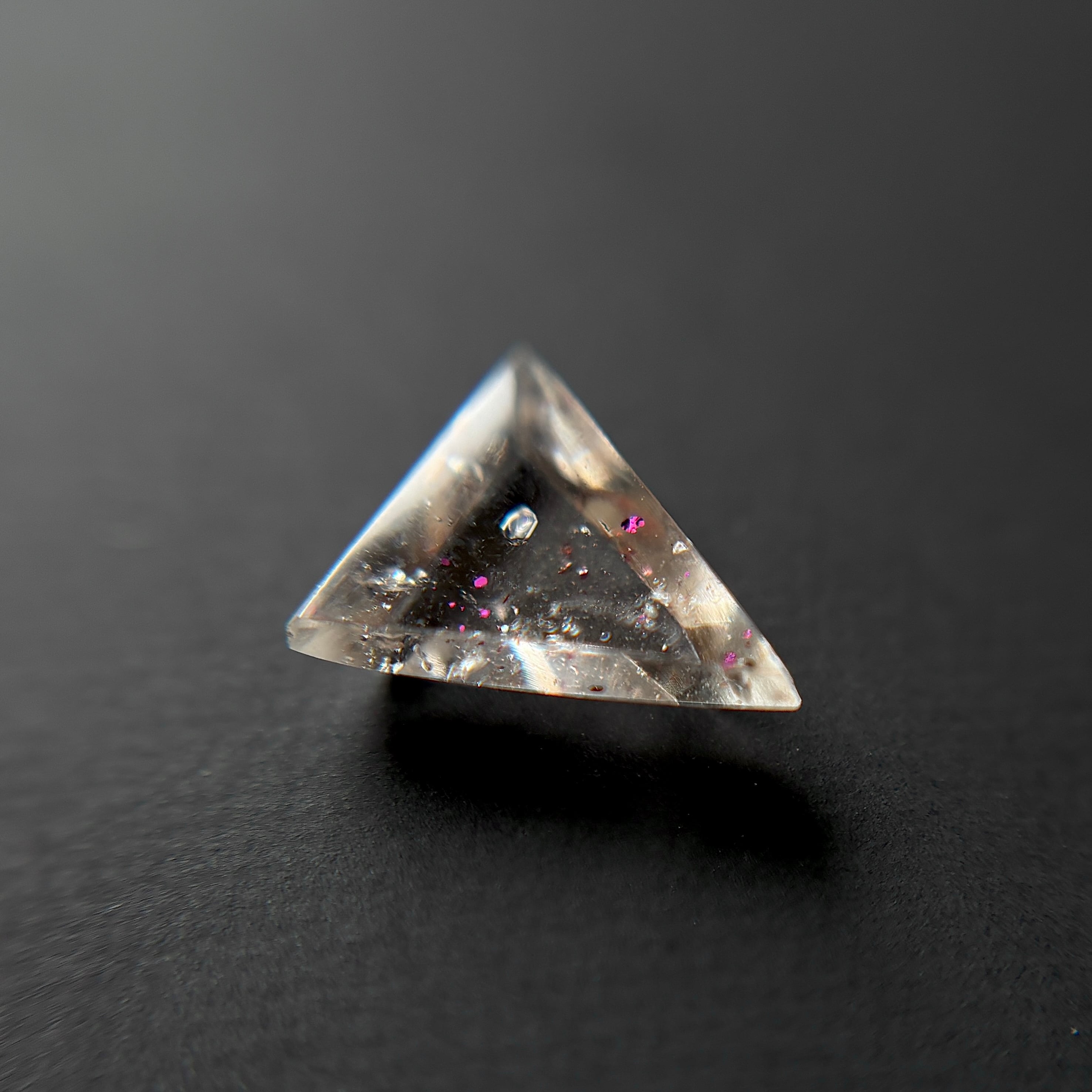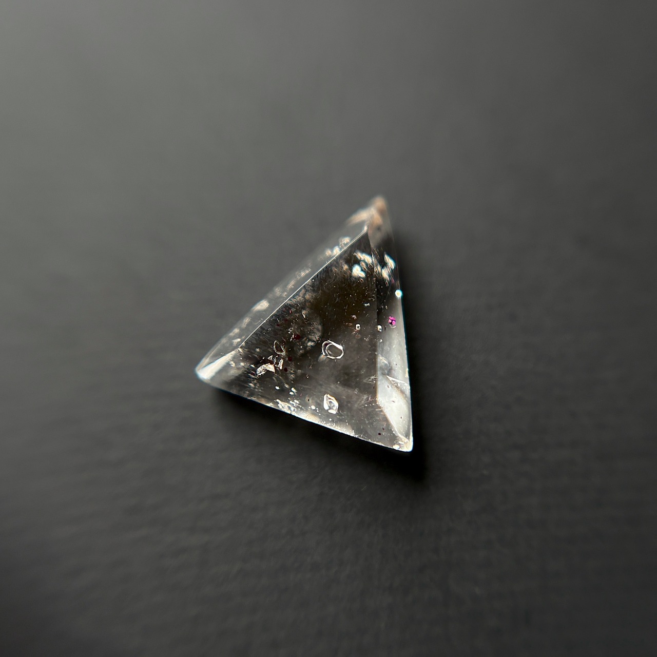 気泡のようなインクルージョンがいくつか入っており、至極澄んだクォーツの中でピンクの輝きとともに浮かんでいます。