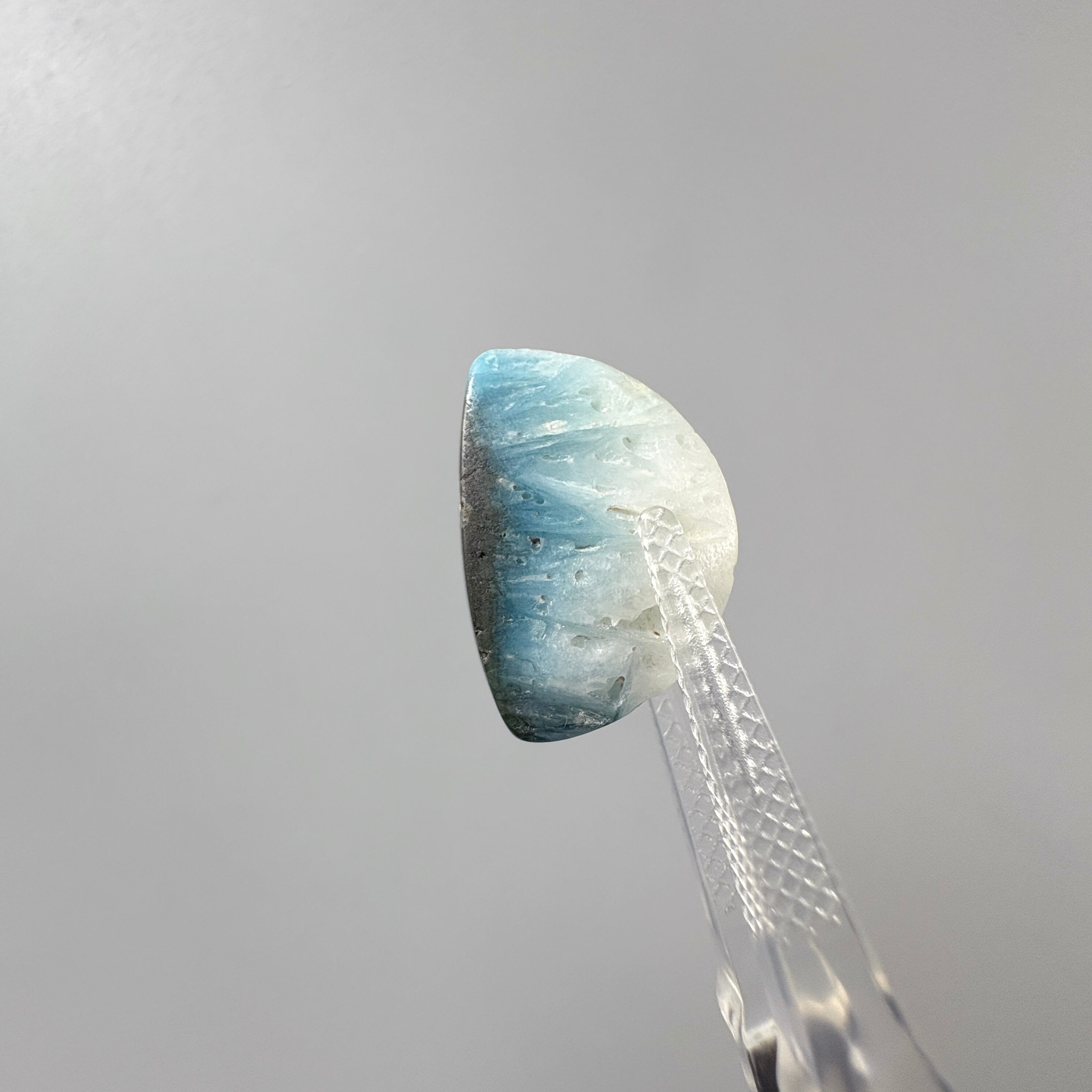 霜柱を思わせる形の結晶で時折隙間があり、ブルーのグラデーションに挟まれた白い部分は光を柔らかく通します。