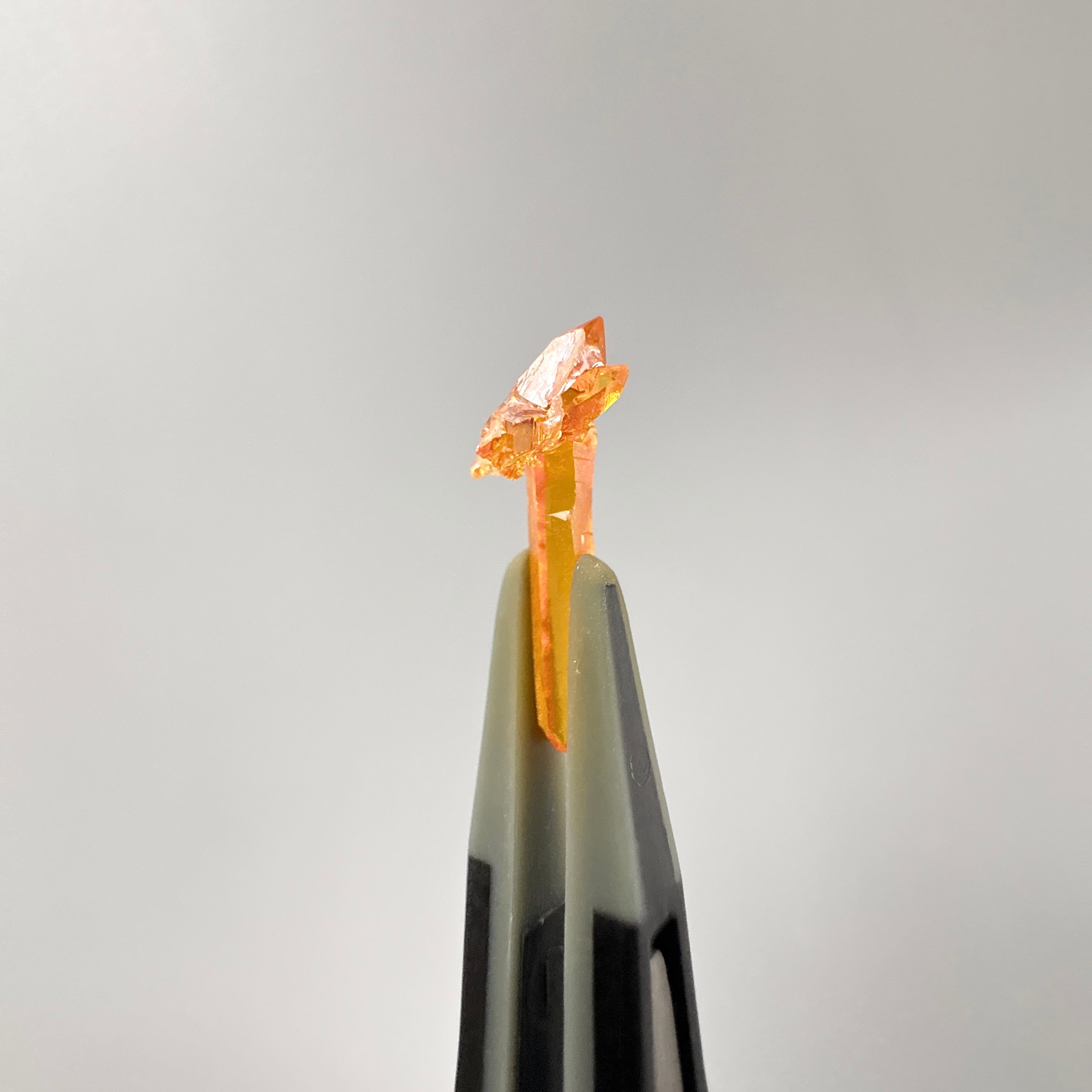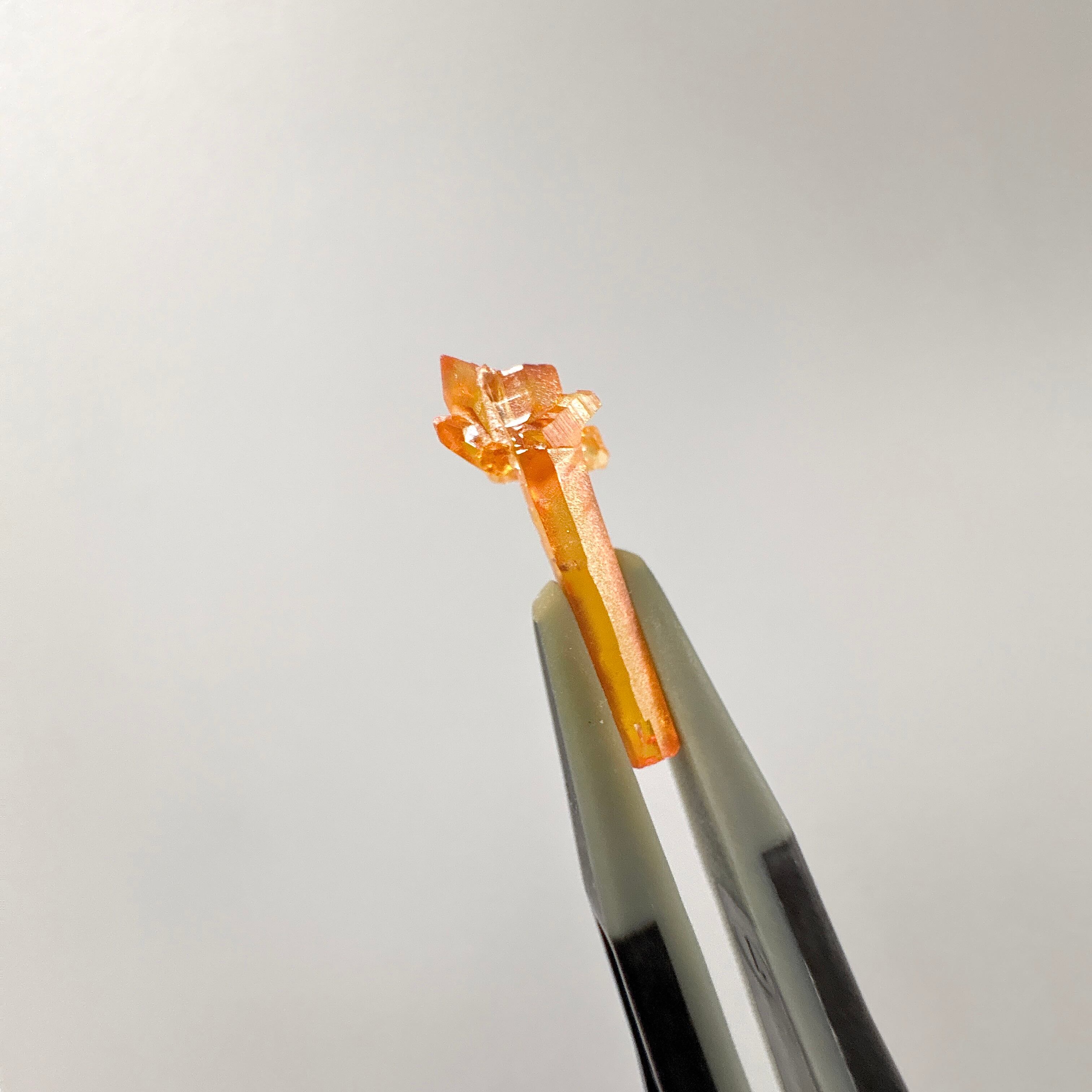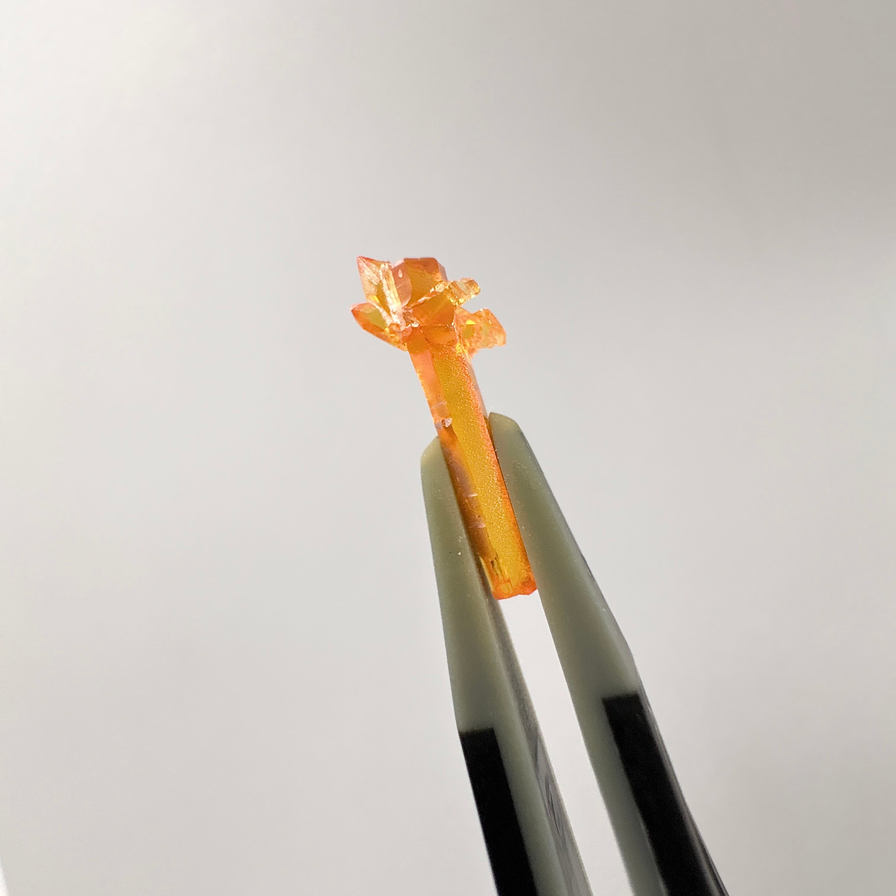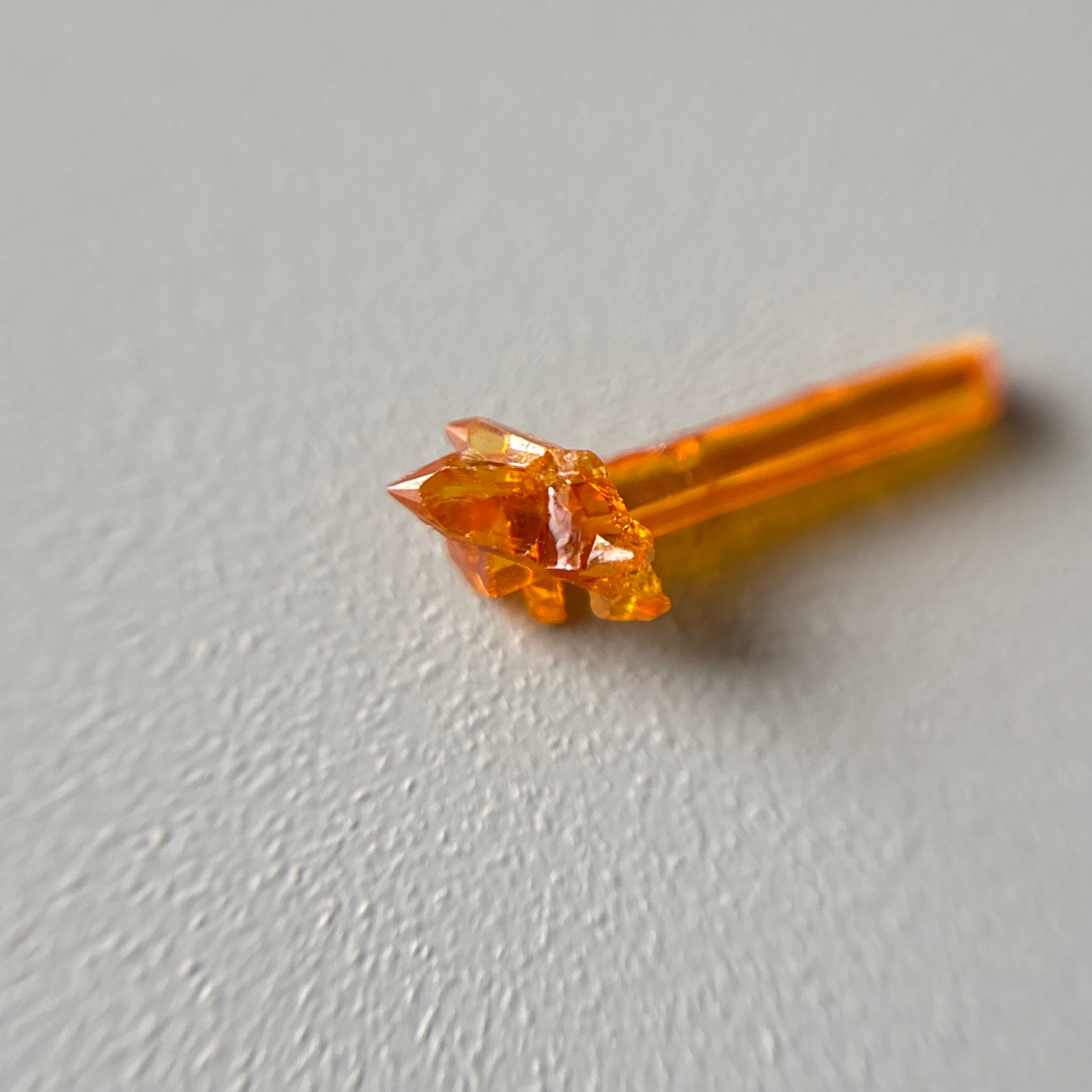 ジンカイトは、亜鉛を製錬する際に偶然出来たと言われる半人工石の結晶で、高い屈折率と分散率、蛍光性を持ちます。杖のような形です。