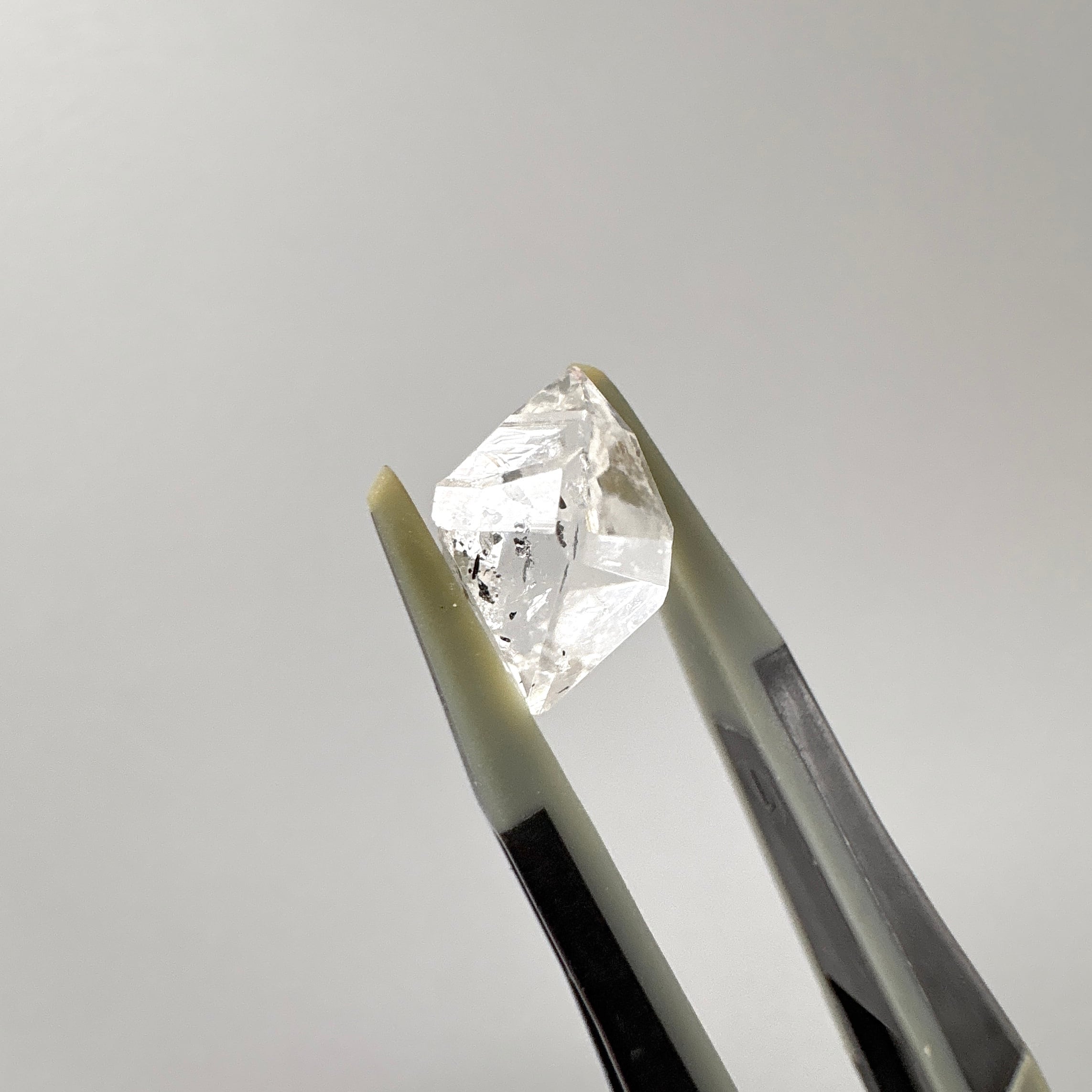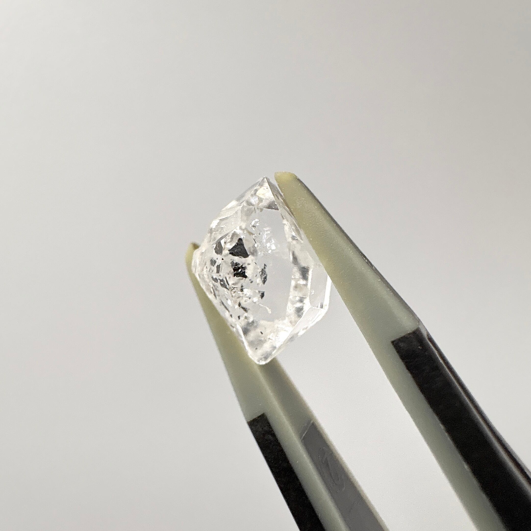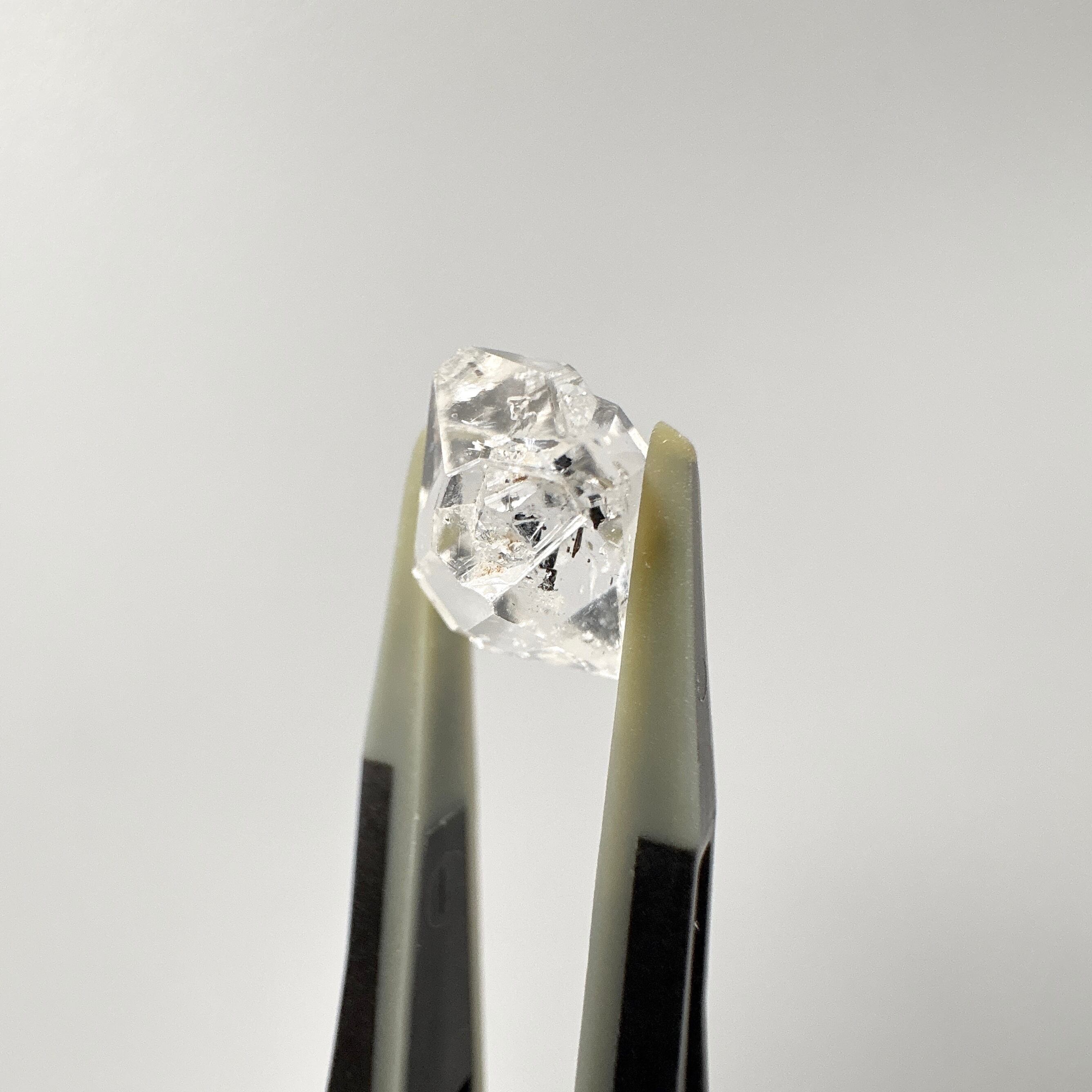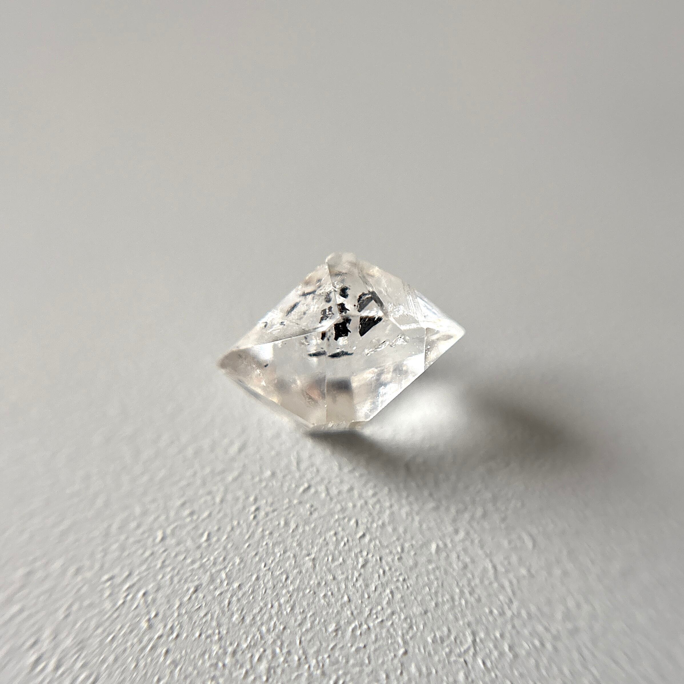 ハーキマーダイヤモンドは、きらきらの内包物と共に特徴的なグラファイトが浮かんでいて、表面の一部は別の結晶があったかのようなクレーター状になっています。