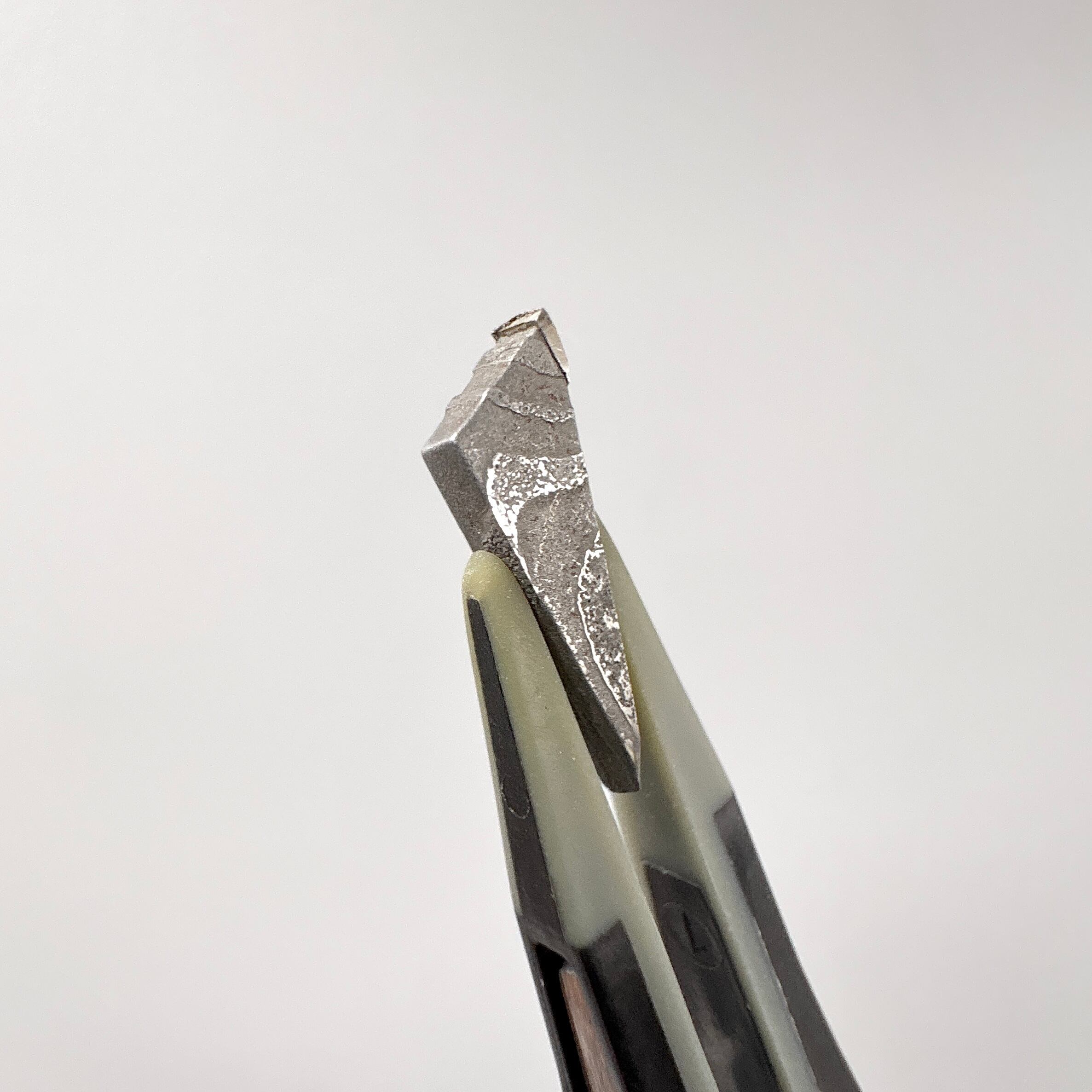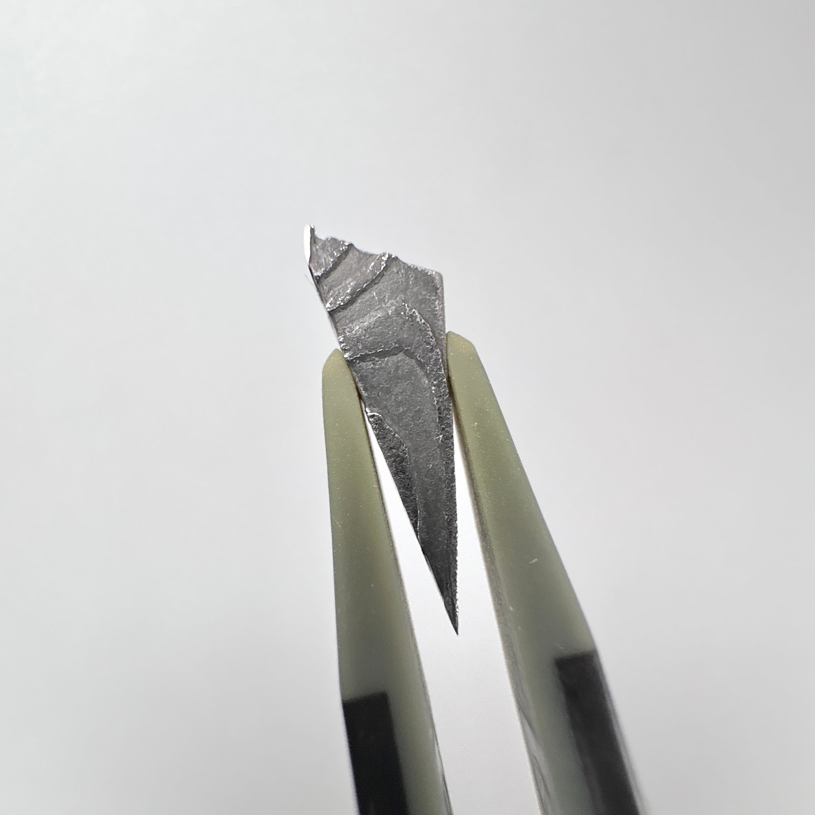ギベオン隕石ダマスカス鋼とは、ギベオン隕石と高炭素鋼を幾重にも折り重ねて鍛え上げた素材です。エッチング (酸腐食) を施すことで、鉄隕石のウィドマンシュテッテン構造とも違う、和モダンな波紋が浮き出ています。