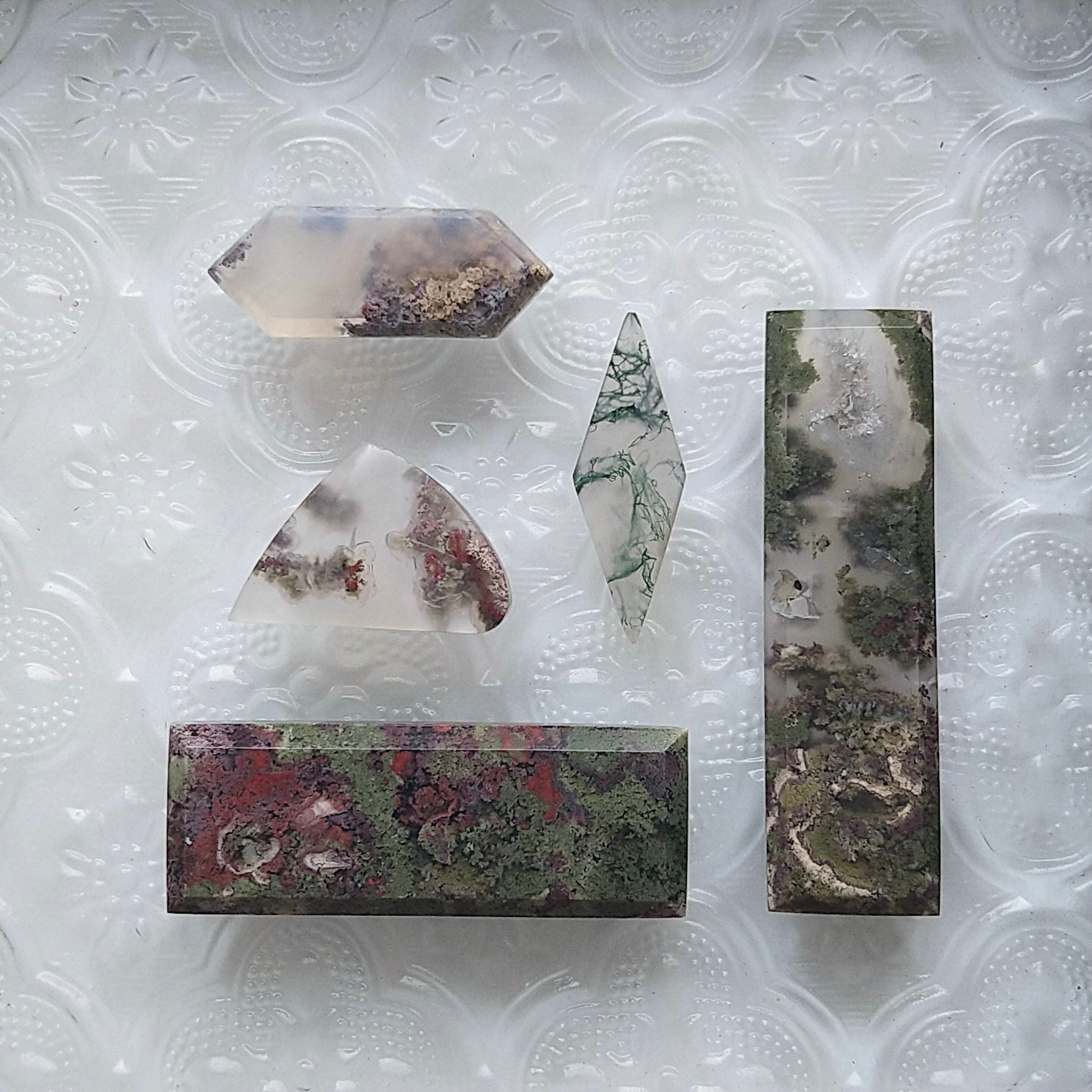 インドネシアでは様々な色のモスアゲートが産出され、深い緑だけではなく淡いピンクや緑、赤いものもあります。