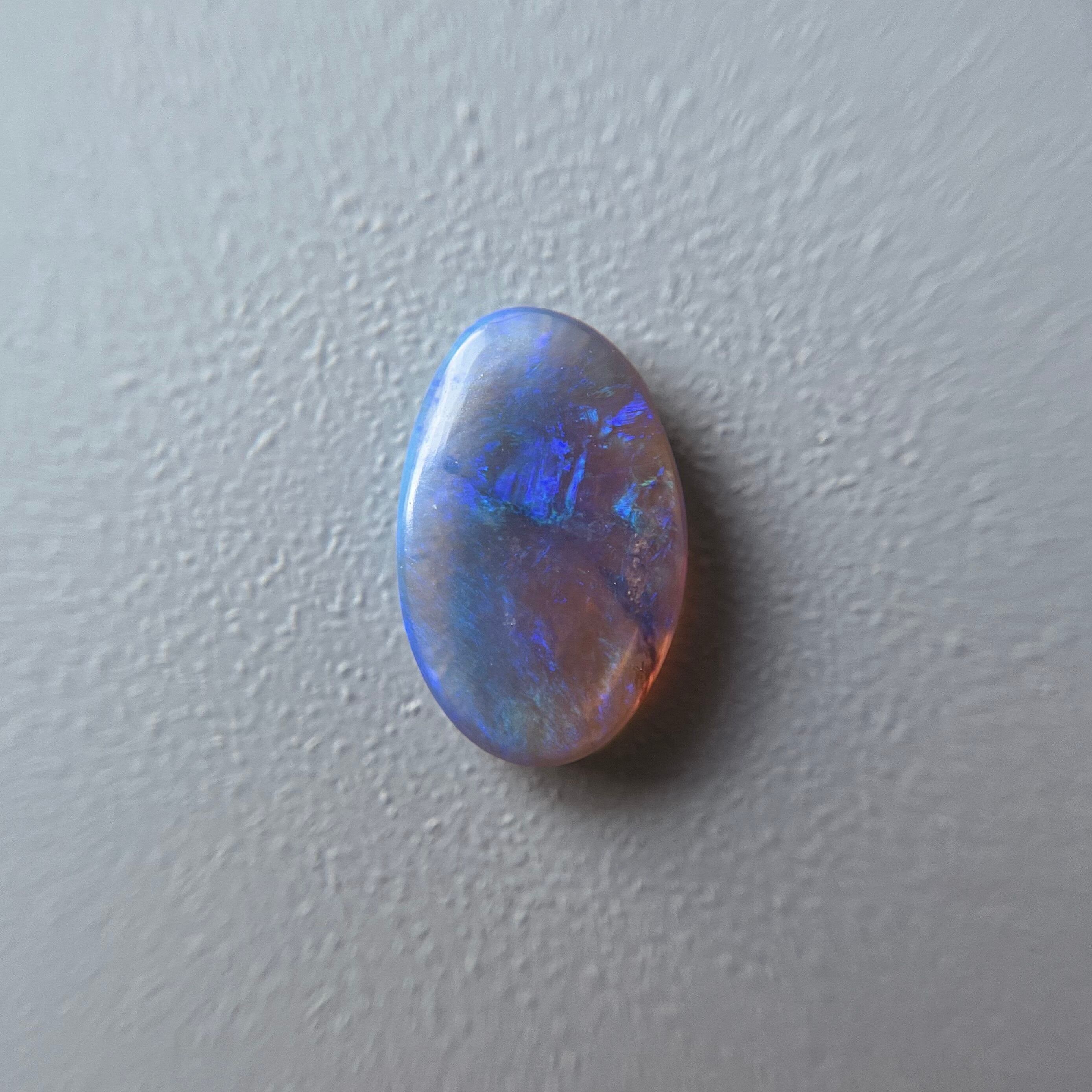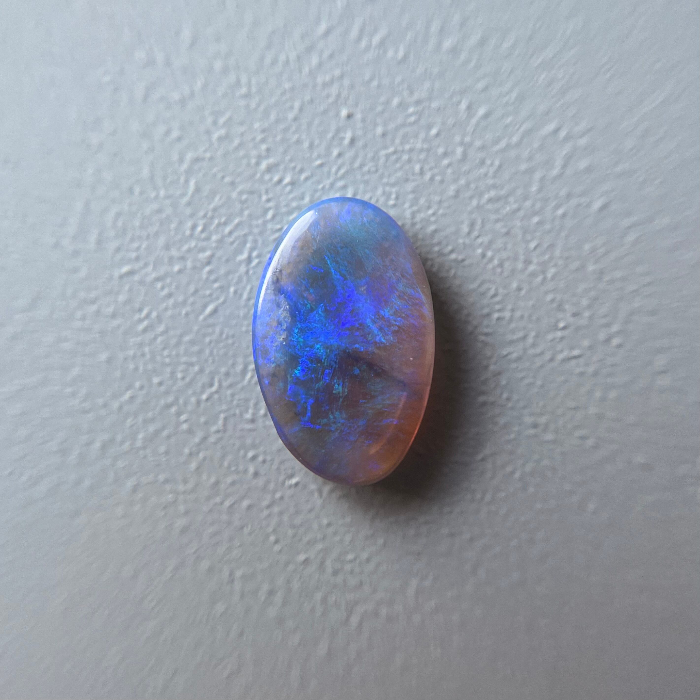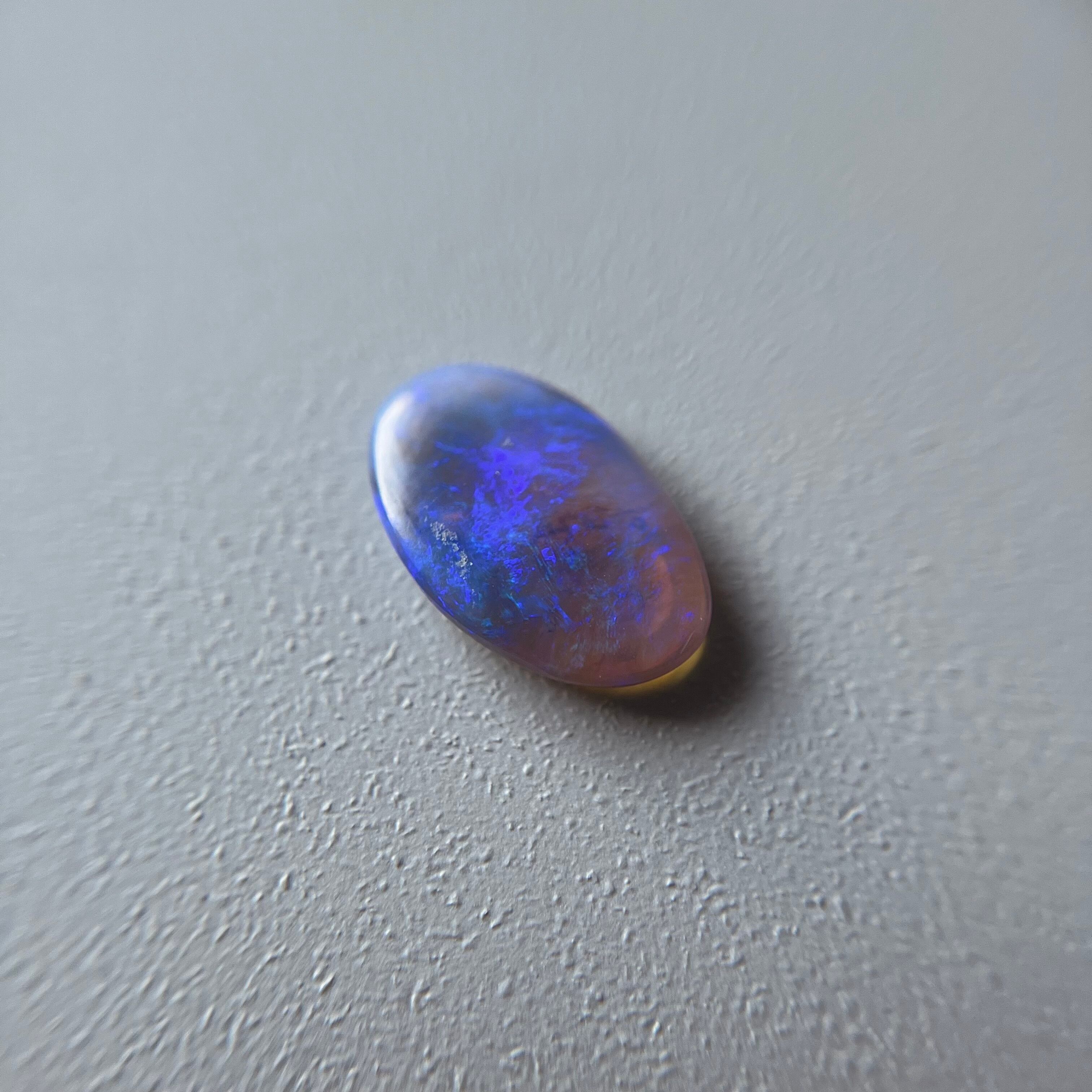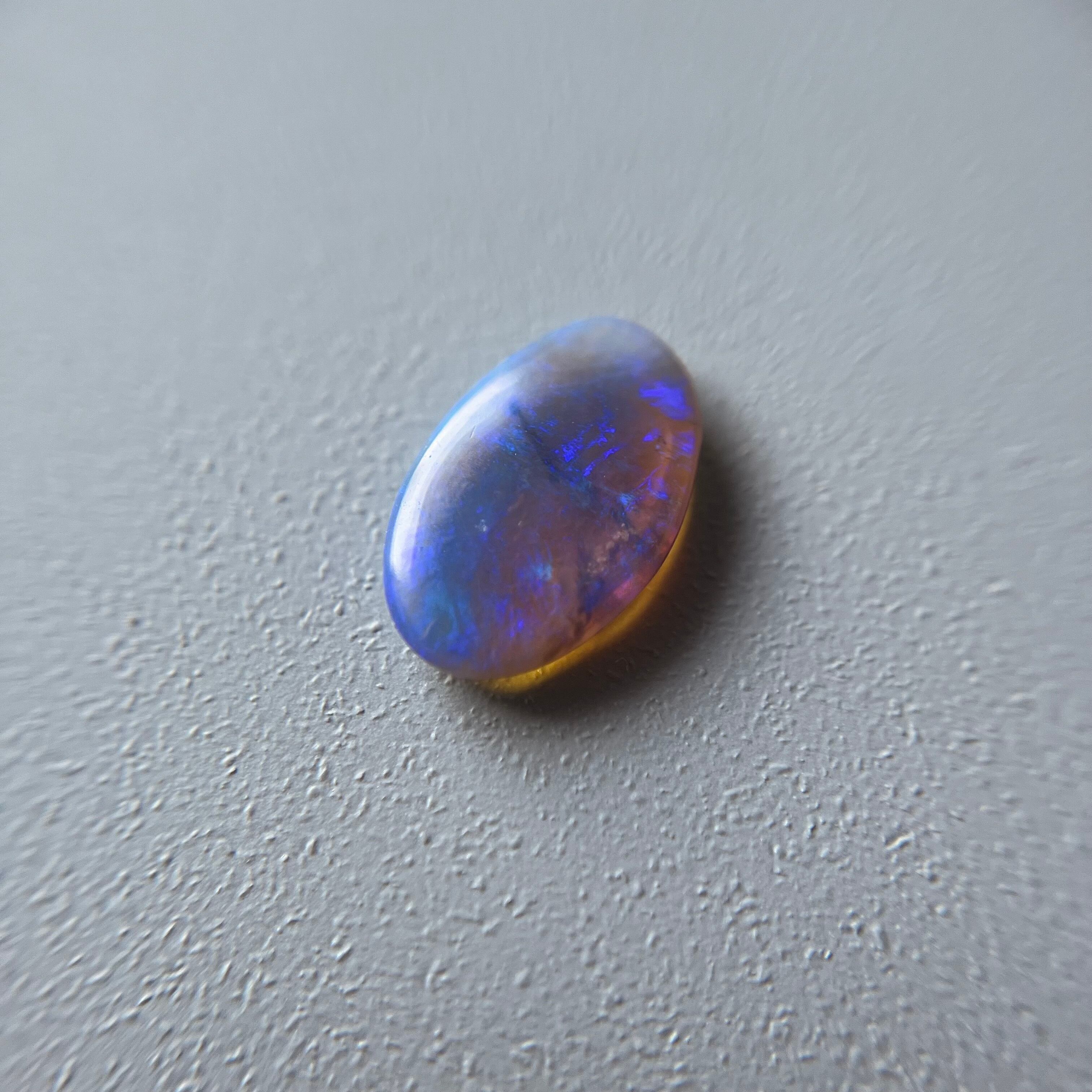 透明な深いオレンジにパープリッシュブルーの班がのるクリスタル系ブラックオパールです。
