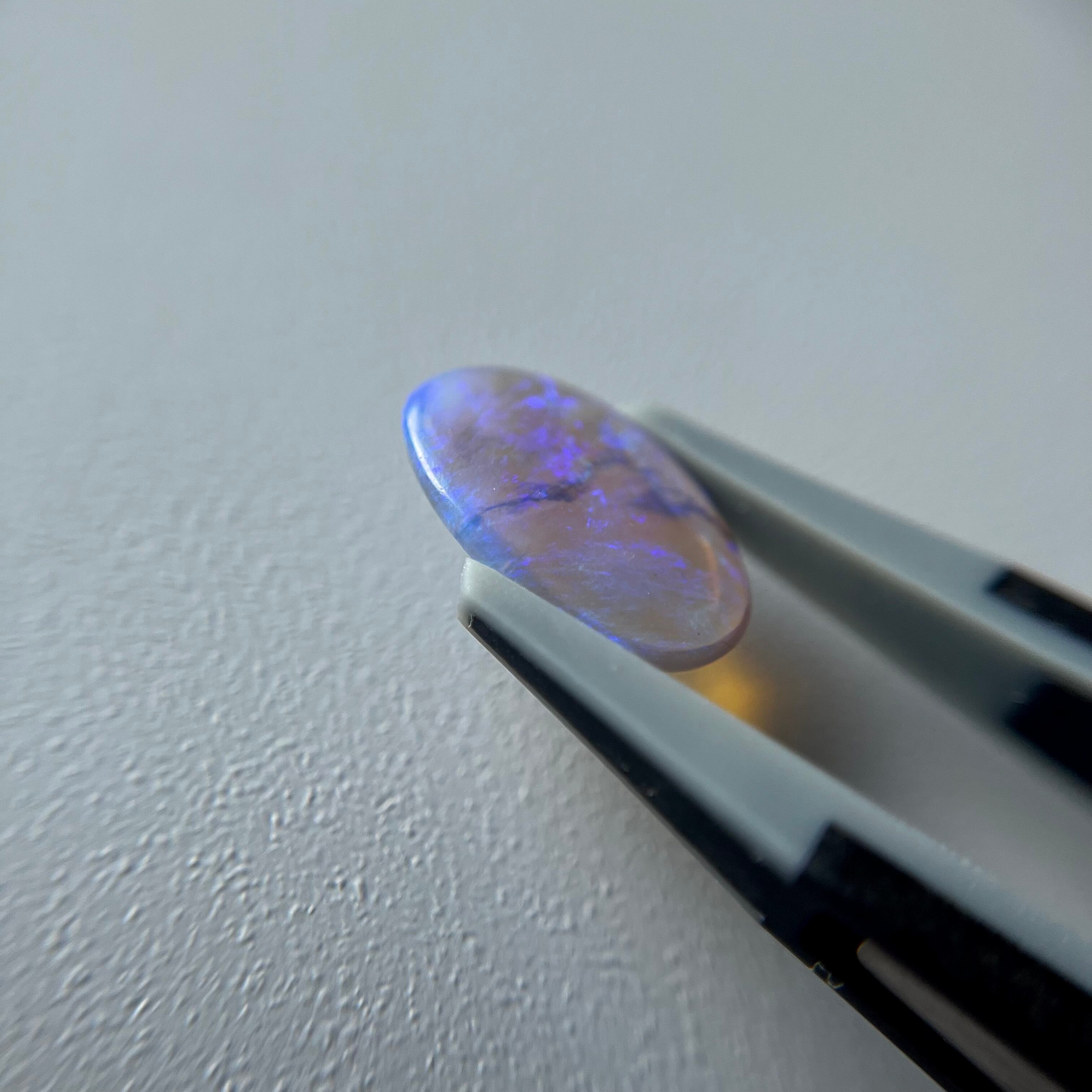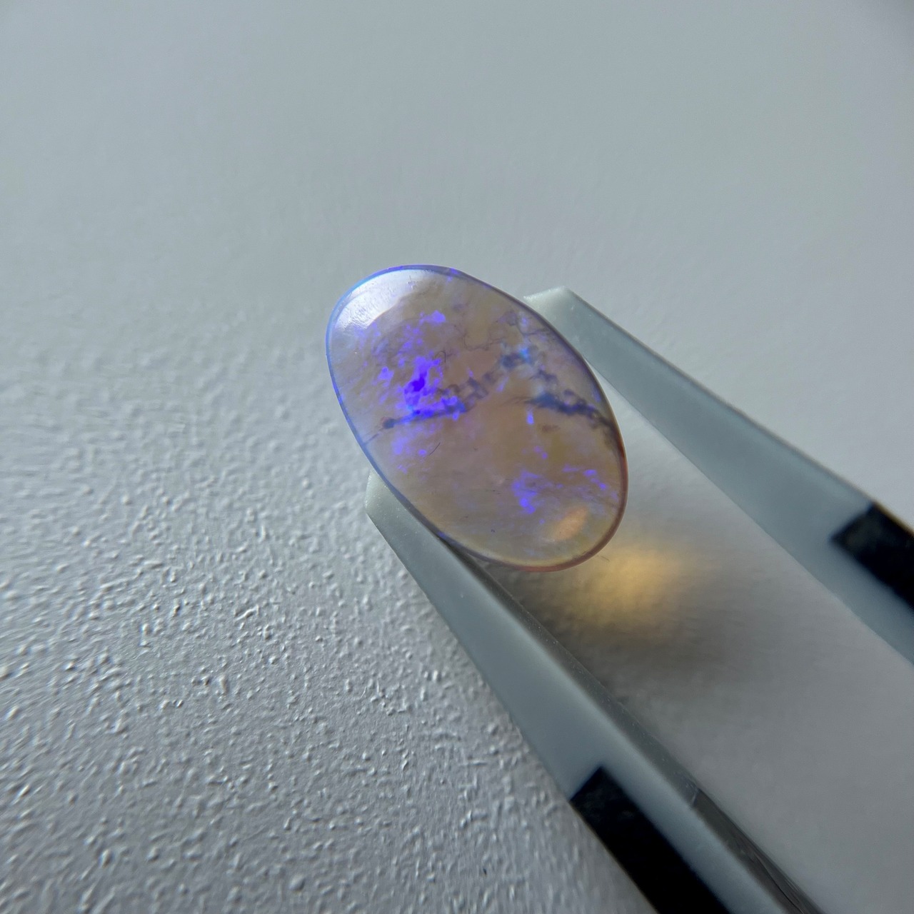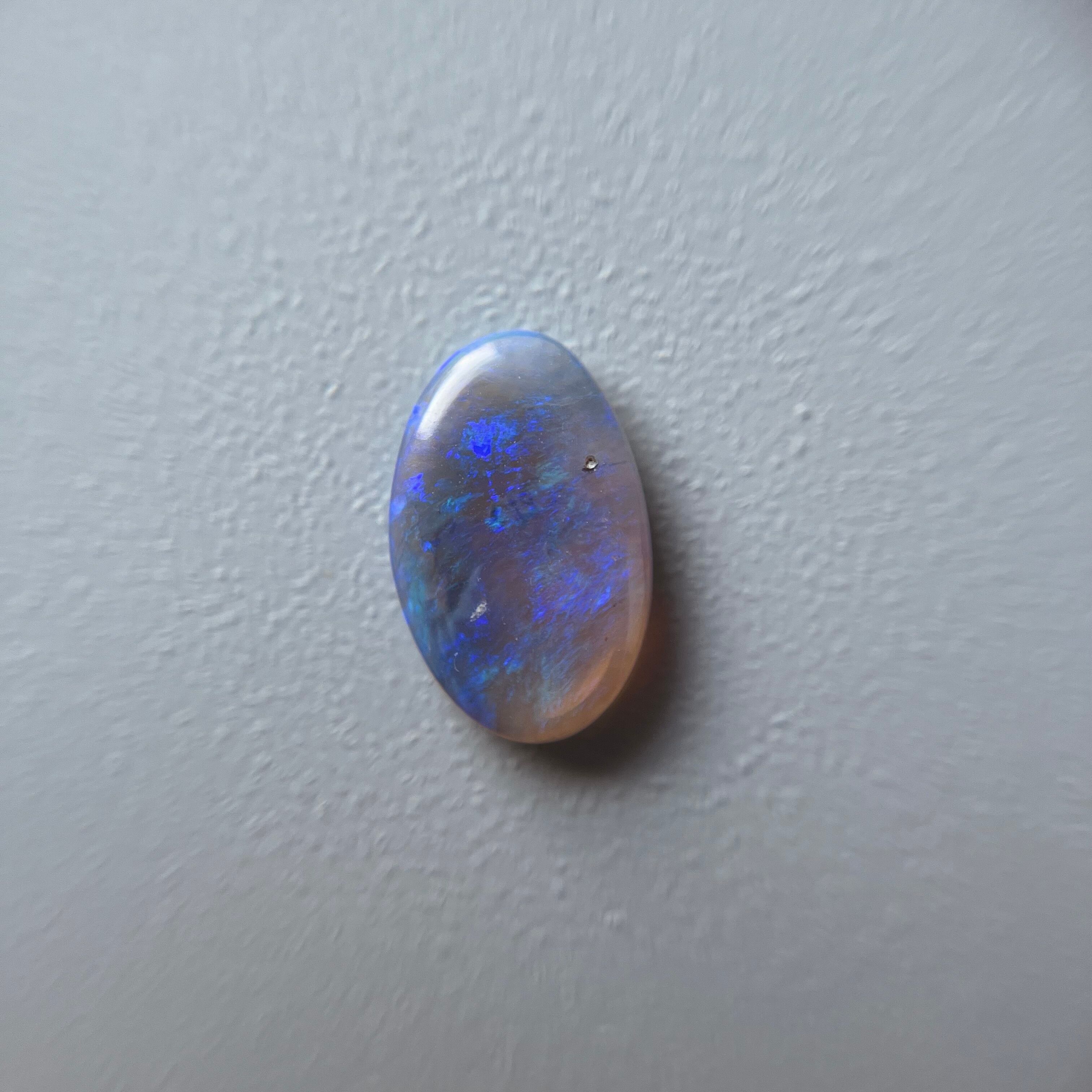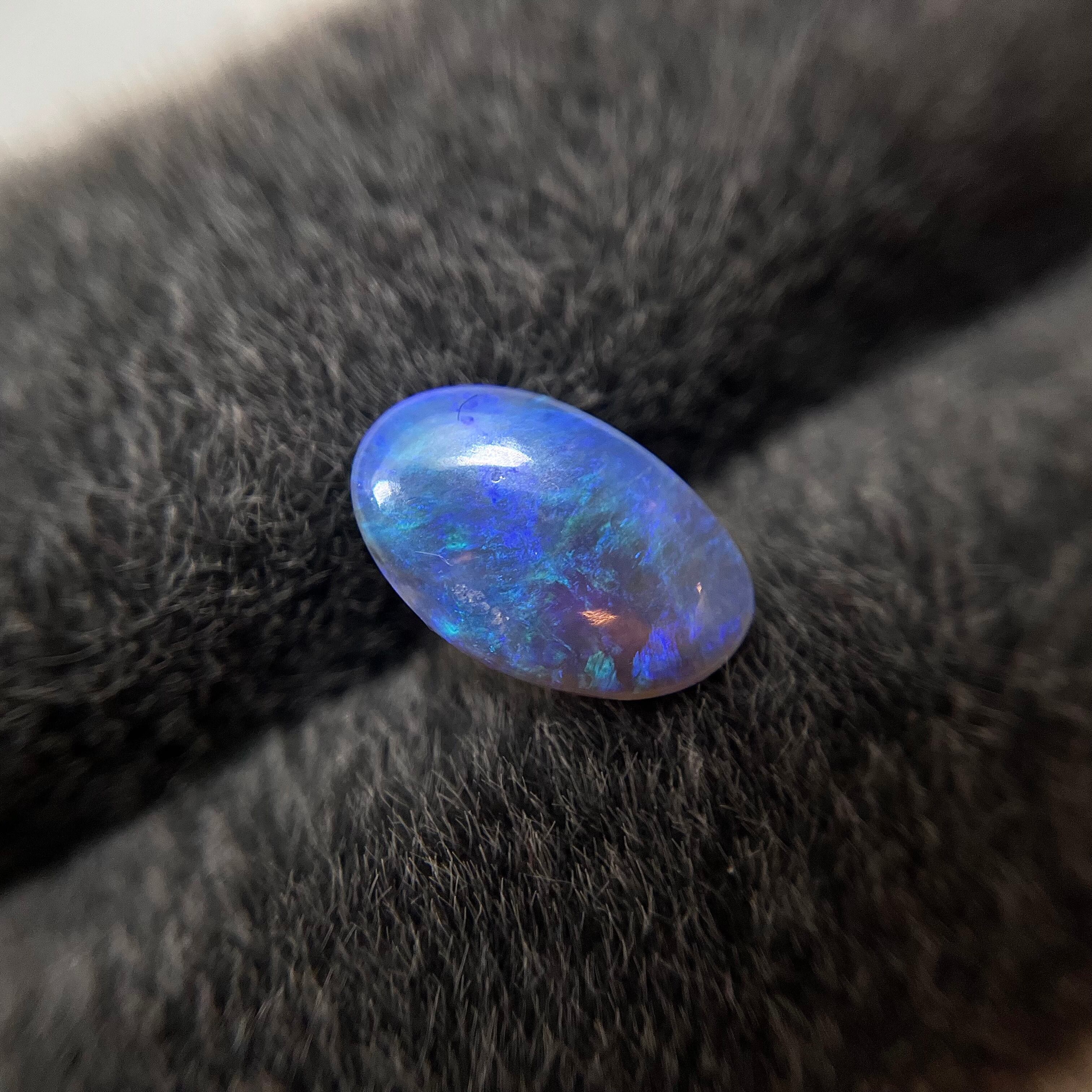 透明な深いオレンジにパープリッシュブルーの班がのるクリスタル系ブラックオパールです。