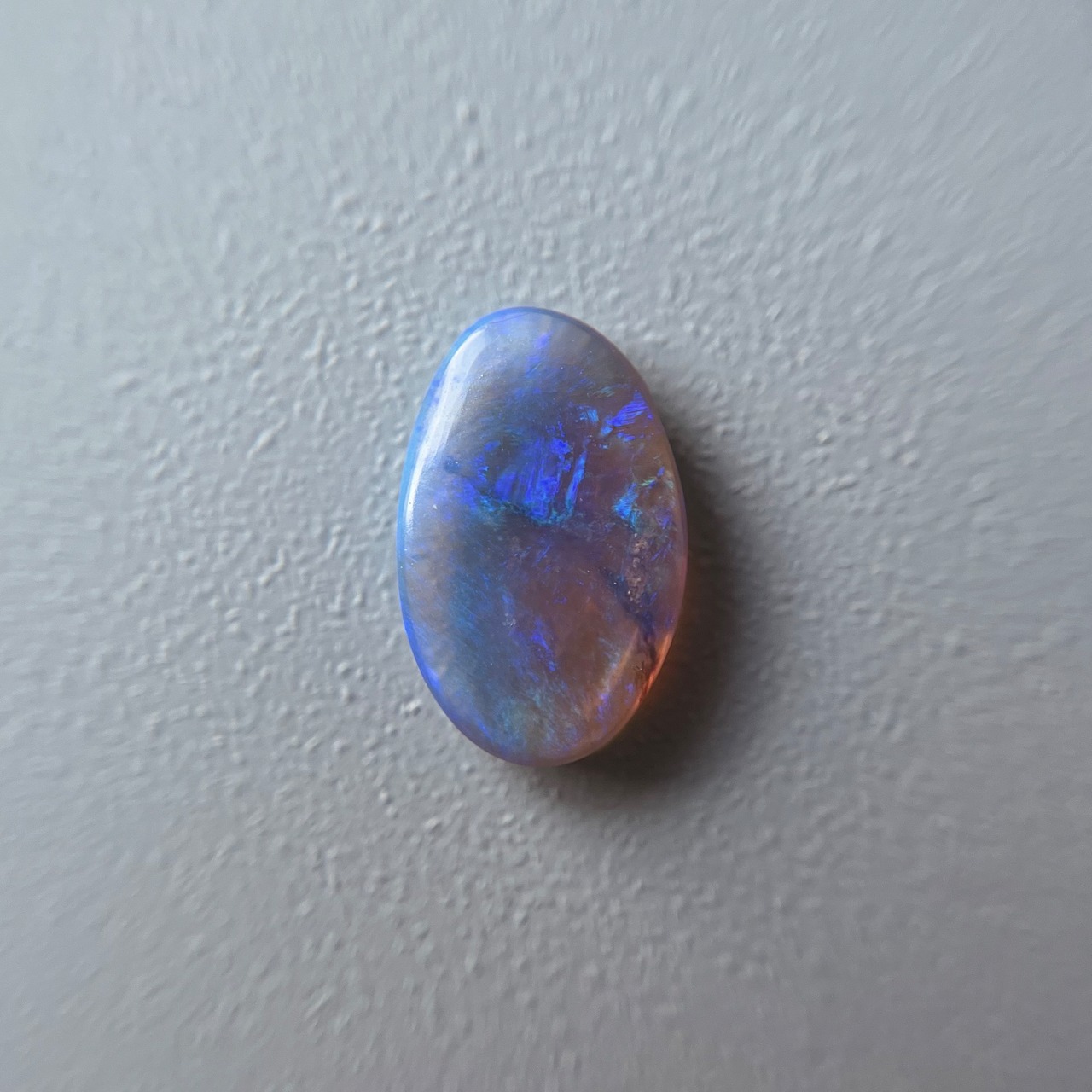 透明な深いオレンジにパープリッシュブルーの斑がのるクリスタル系ブラックオパールです。