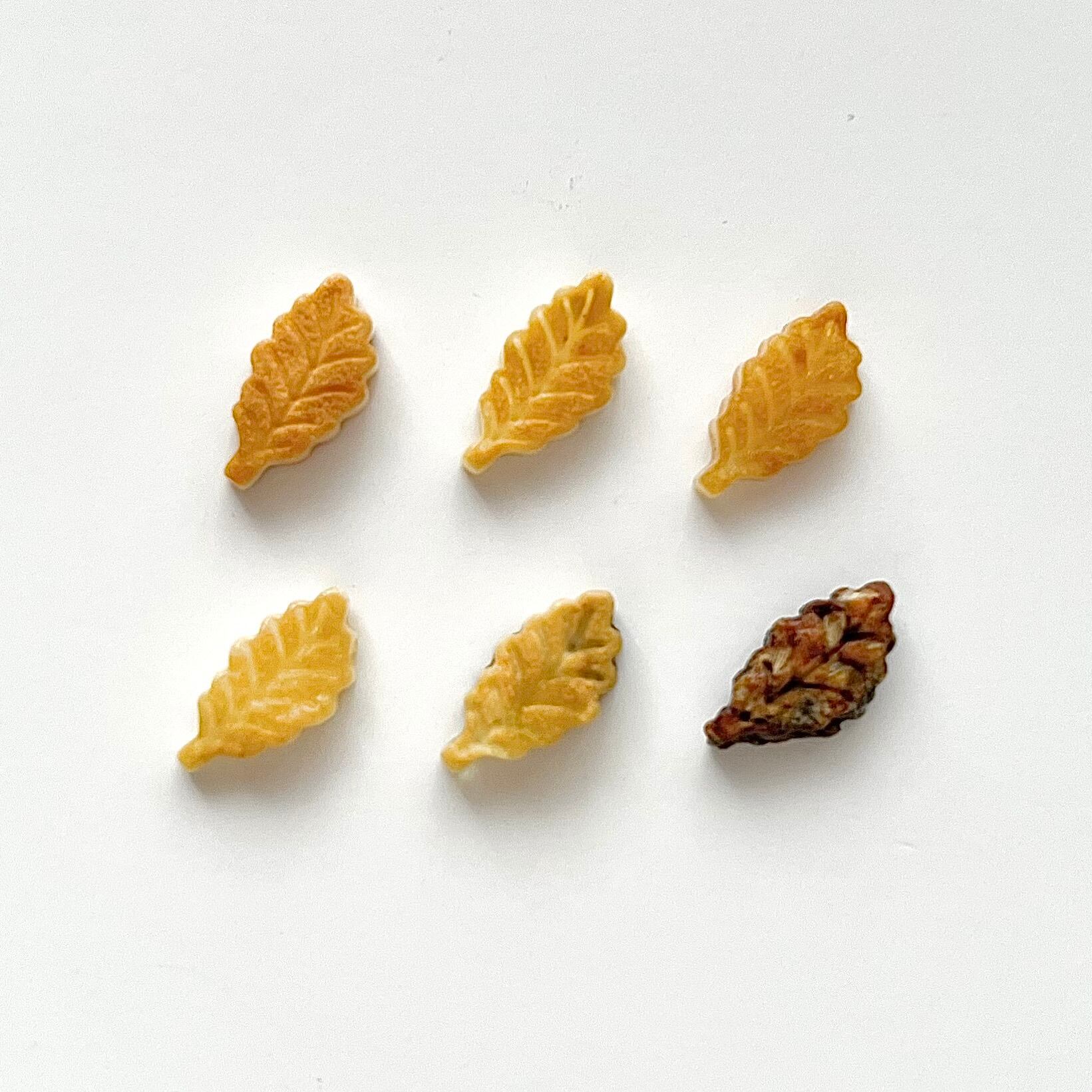 たぬきの頭にのってそうな葉っぱ型のアンバーです。