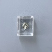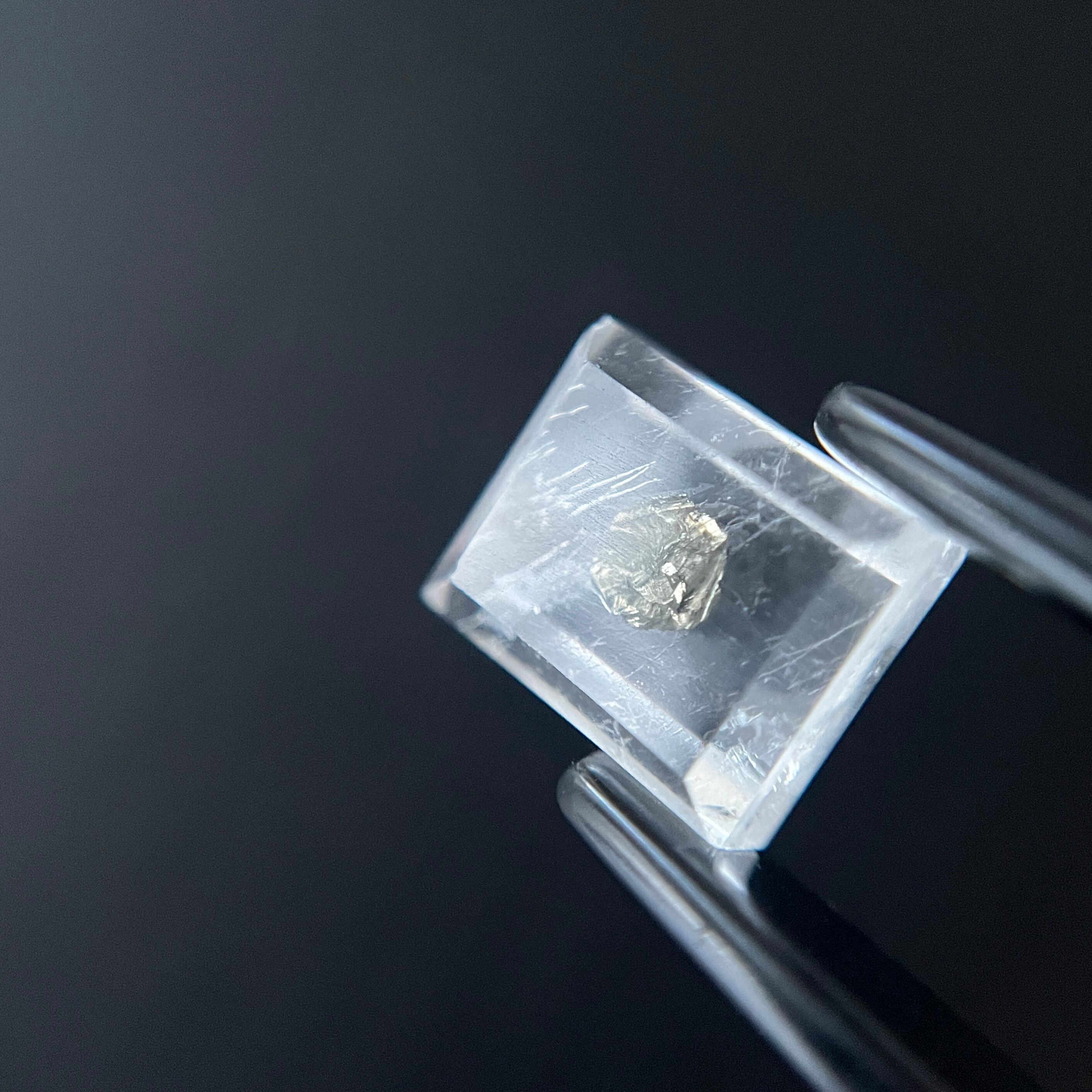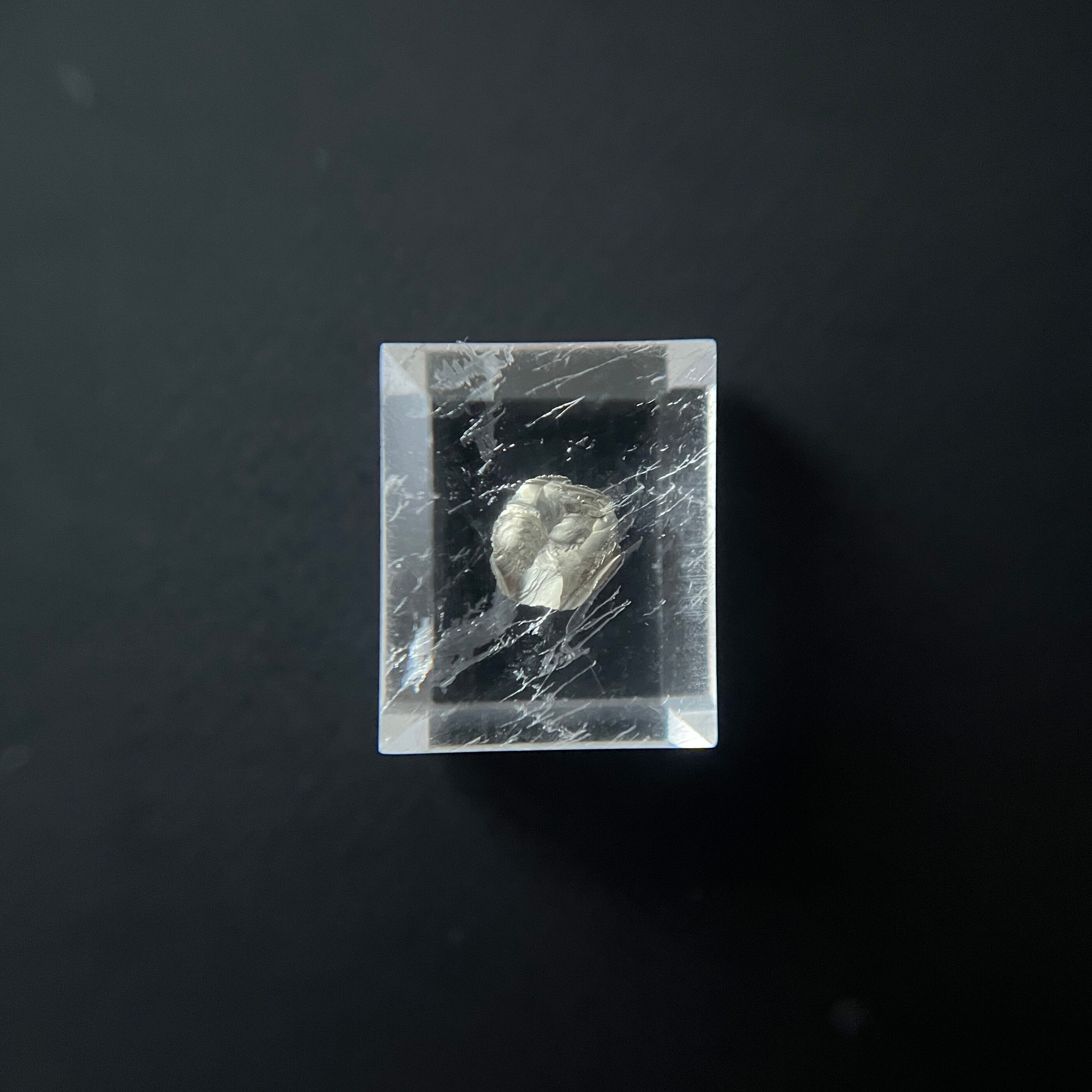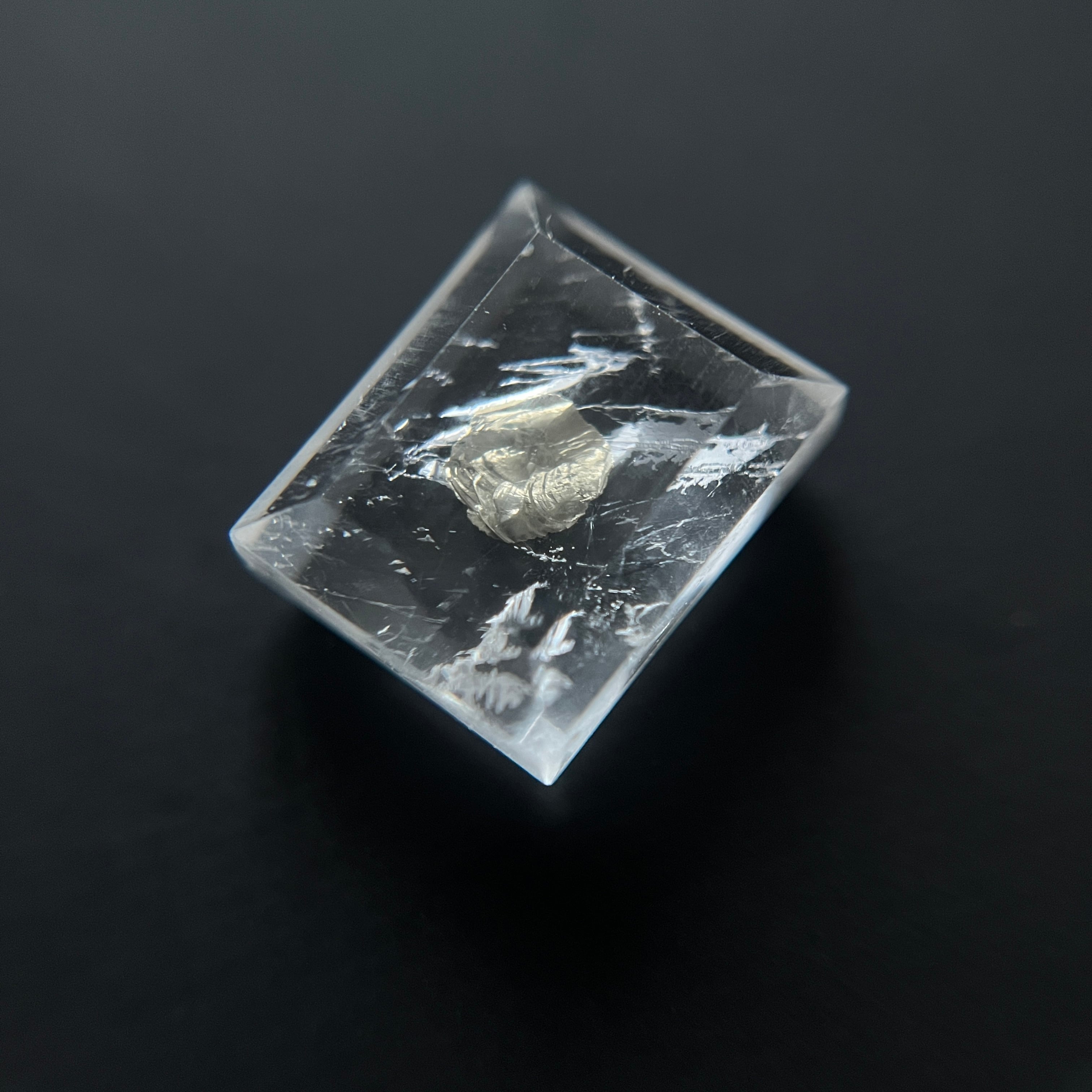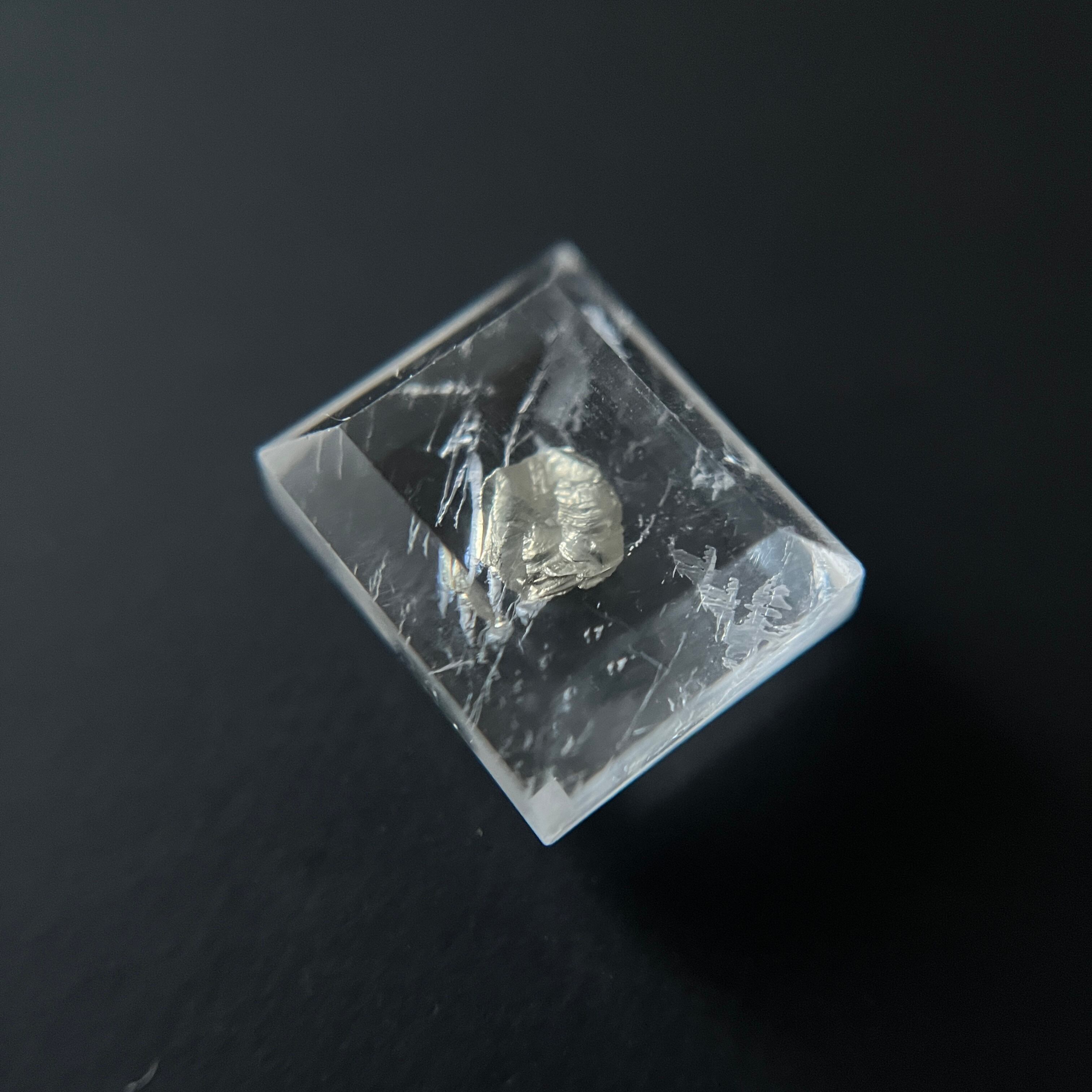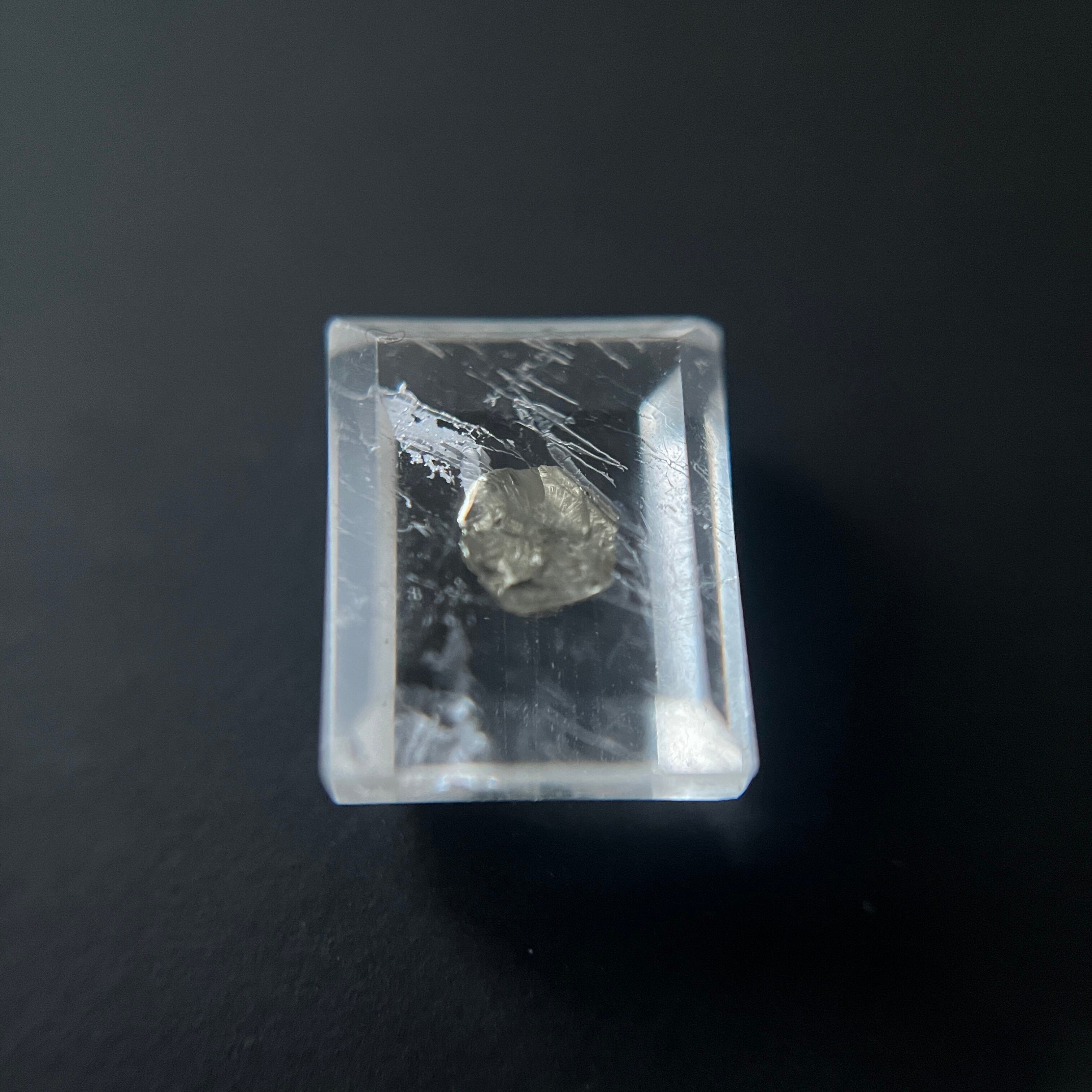 中央に厳かに位置する花のようなパイライトと周囲に吹き荒ぶフラクチャーが幻想的で、スクエア型フラットバックのカットでより活かされています。