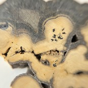 ドイツ語で響く石という意味のシャーレンブレンド。叩くと高い音が鳴ることからその名になったそうです。スファレライト、ガレナ、マーカサイトなどが混ざり合って生まれ、スライスするとそれぞれが層になった波模様になります。こちらは波の外側にふわっとした円状の模様が浮かぶかわいらしい子です。
