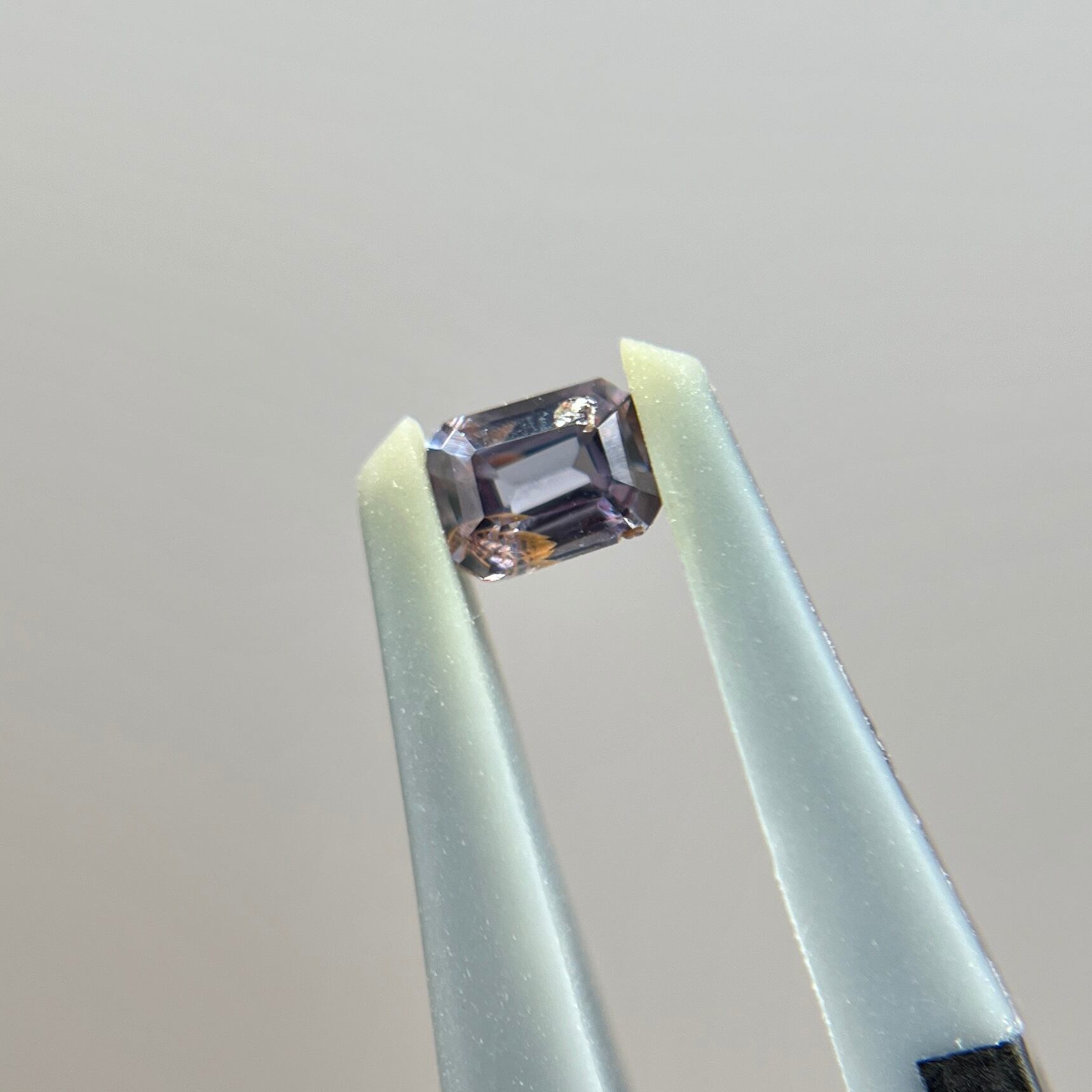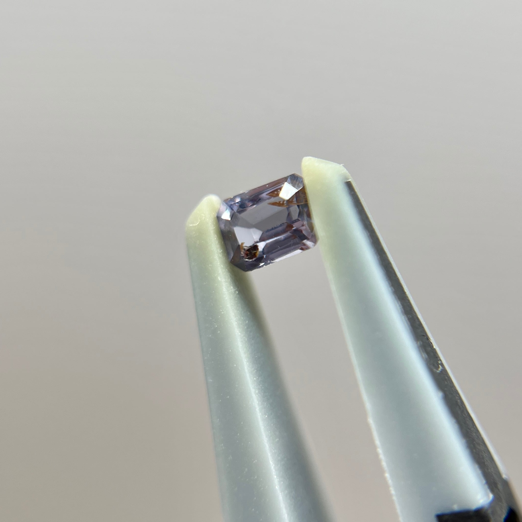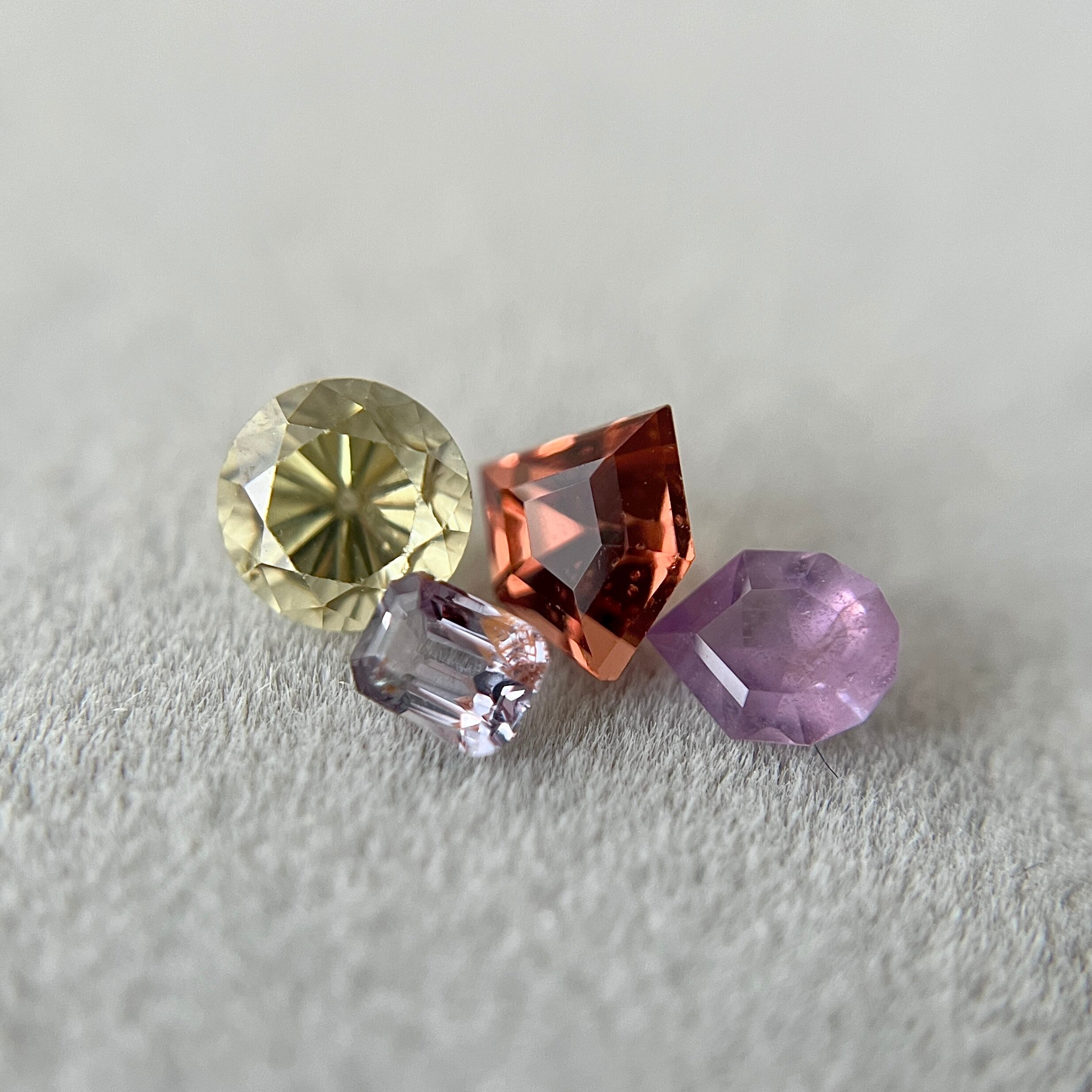 ソーティングでは緑・赤紫と出ていますが、こちらの環境では、自然光で赤寄りの紫、LEDライトで青寄りの紫に見えます。橙色の大きめインクルージョンが2つあり、ファセットに反射して複雑な模様、色味となっています。